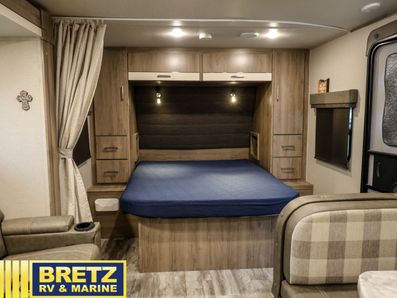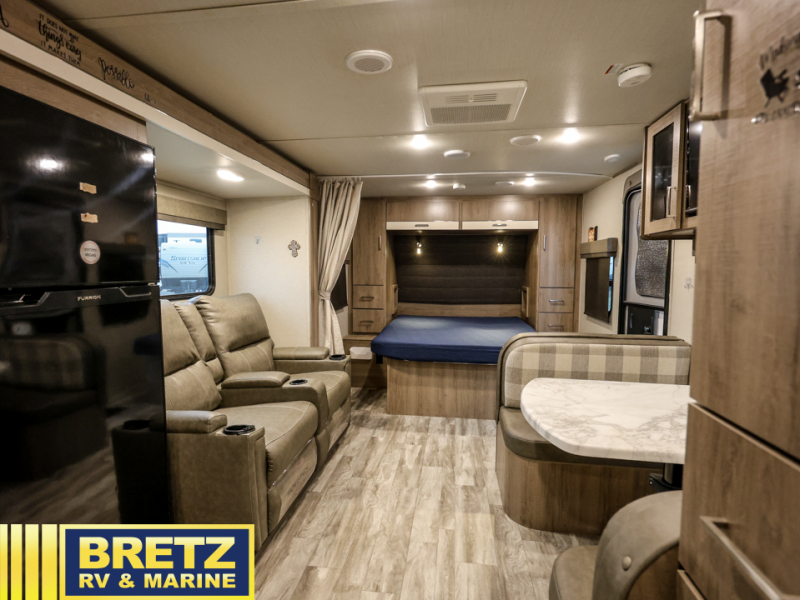 This Imagine XLS travel trailer has theater seating and a booth dinette that you can use any time you need a little break from the outdoors. If you want to come in and grab a coffee, put together a puzzle, or work on your itinerary for the week, just put up your feet and relax. You could even switch on the LED HDTV if you want a little entertainment. The front queen-size bed has a privacy curtain that you can draw to create a semi-private bedroom, and in the back of the trailer you will find the rest of your amenities, like the kitchen and the bathroom. The large slide makes it easy to enjoy spending your time indoors, but if you do want to get back outside, you can sit underneath the 18' electric awning for some shade.