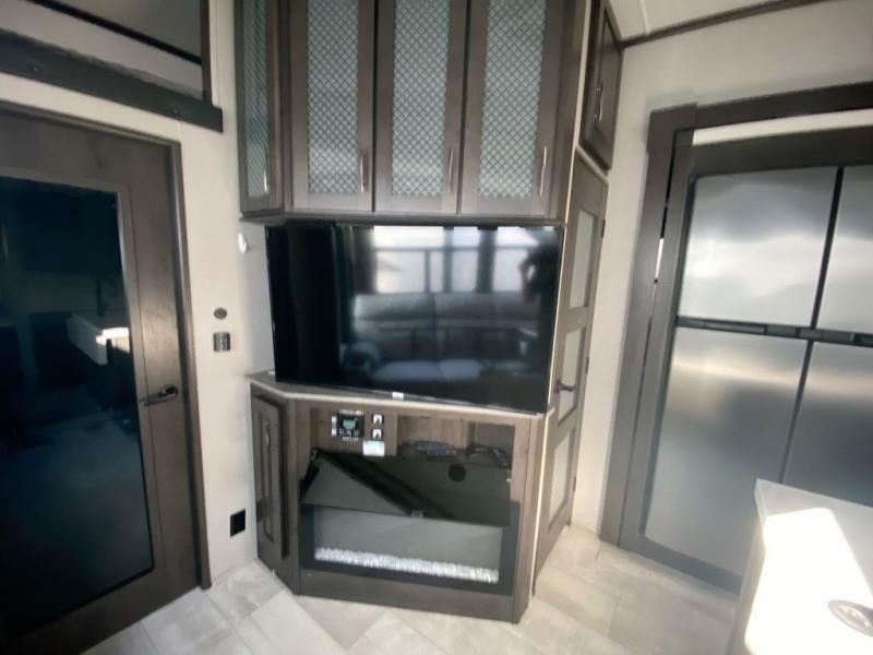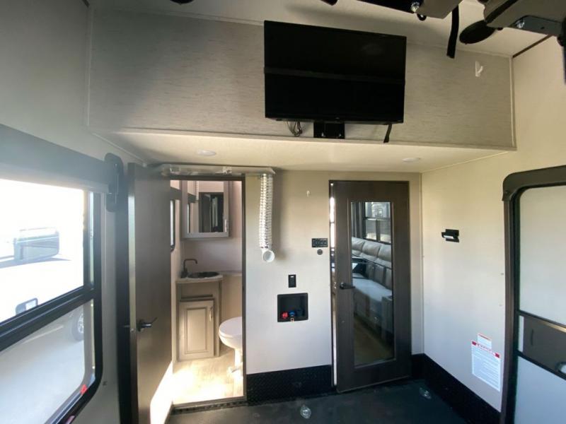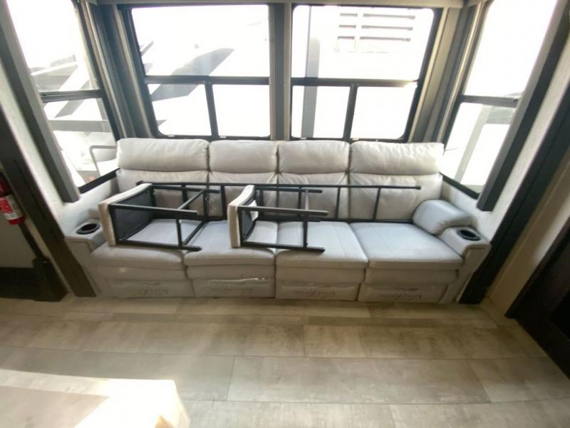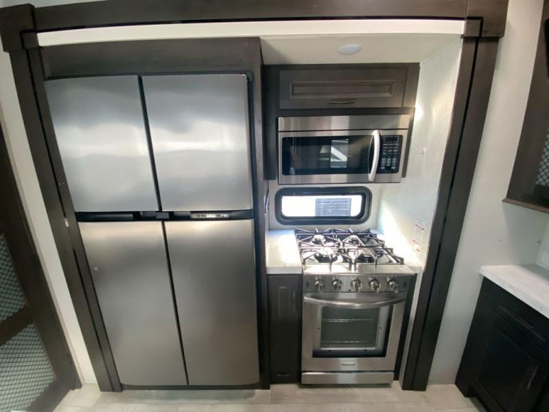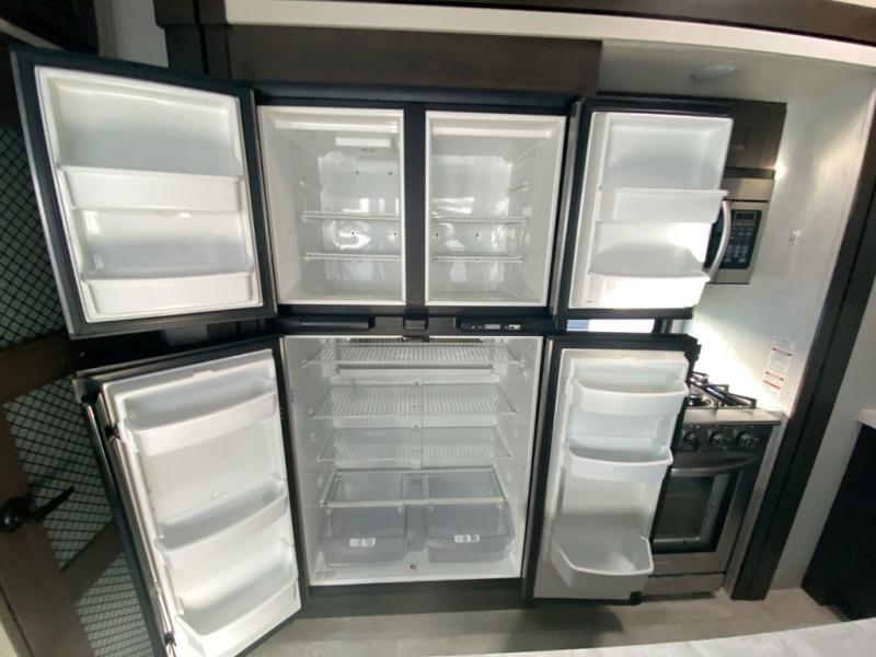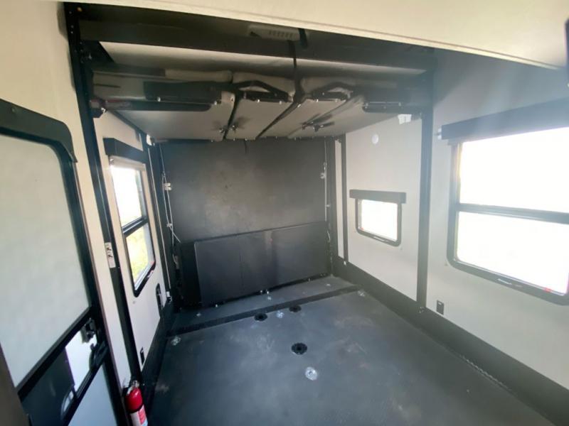 Traveling with friends and family can be comfortable when you have a full double entry bathroom and a half bath available when camping and enjoying the trails on your off-road toys! You will have an 11' garage space that can become a second living/dining area as well as a bedroom if you decide to add the Happi-Jac rollover sofas and a table with a top bed option, plus you can add other options such as an LED TV and/or a washer/dryer. There is an overhead loft bed and a four-seat sofa slide for more sleeping space in the main living area. Everyone can watch the 49" LED TV when waiting for dinner, and enjoy the fireplace on those chiller nights. The kitchen island offers a sink to wash dishes, extra counter space for serving meals and two stools to dine at. The cook will love all the upgraded appliances, and the space thanks to the slide. The front bedroom gives you a queen bed slide or choose a king, lots of clothing space, and a flip-up dresser for even more storage. If you want more garage space, take a look at 381MS!