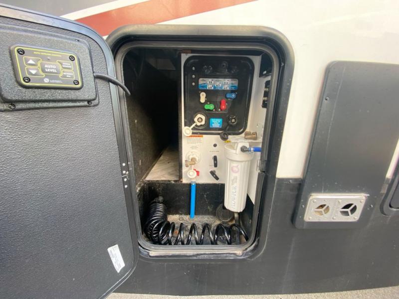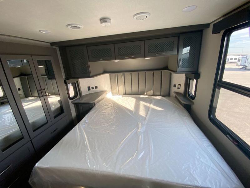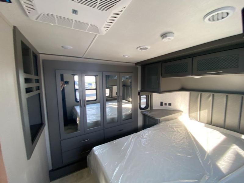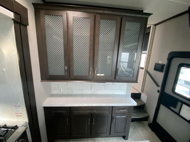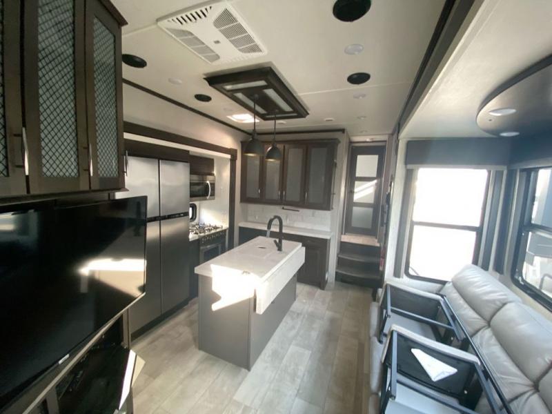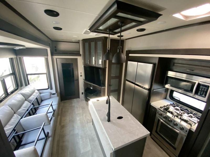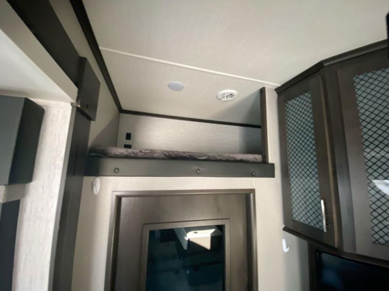 Traveling with friends and family can be comfortable when you have a full double entry bathroom and a half bath available when camping and enjoying the trails on your off-road toys! You will have an 11' garage space that can become a second living/dining area as well as a bedroom if you decide to add the Happi-Jac rollover sofas and a table with a top bed option, plus you can add other options such as an LED TV and/or a washer/dryer. There is an overhead loft bed and a four-seat sofa slide for more sleeping space in the main living area. Everyone can watch the 49" LED TV when waiting for dinner, and enjoy the fireplace on those chiller nights. The kitchen island offers a sink to wash dishes, extra counter space for serving meals and two stools to dine at. The cook will love all the upgraded appliances, and the space thanks to the slide. The front bedroom gives you a queen bed slide or choose a king, lots of clothing space, and a flip-up dresser for even more storage. If you want more garage space, take a look at 381MS!