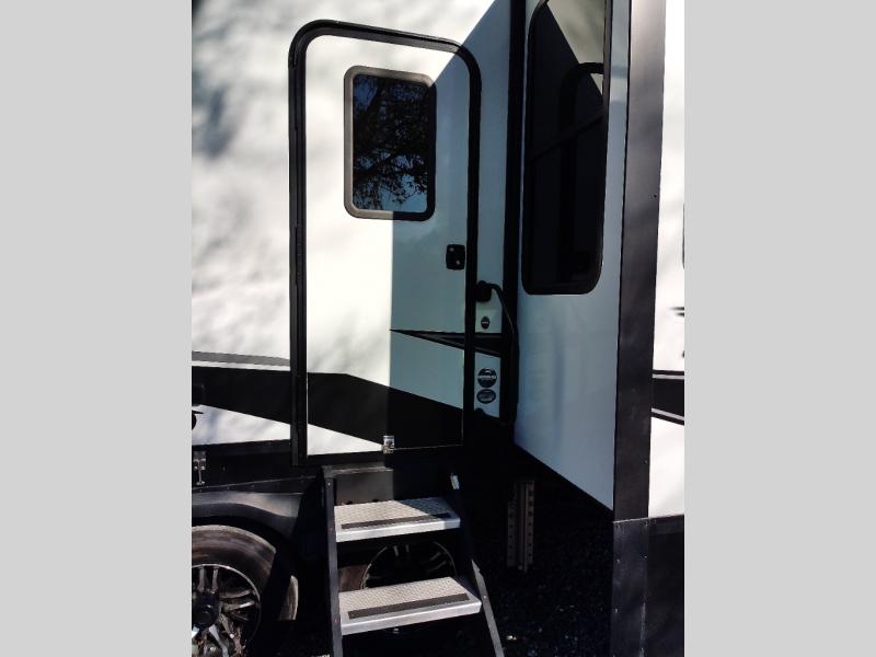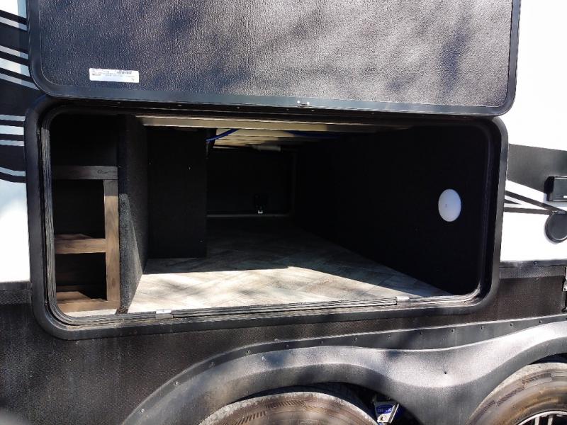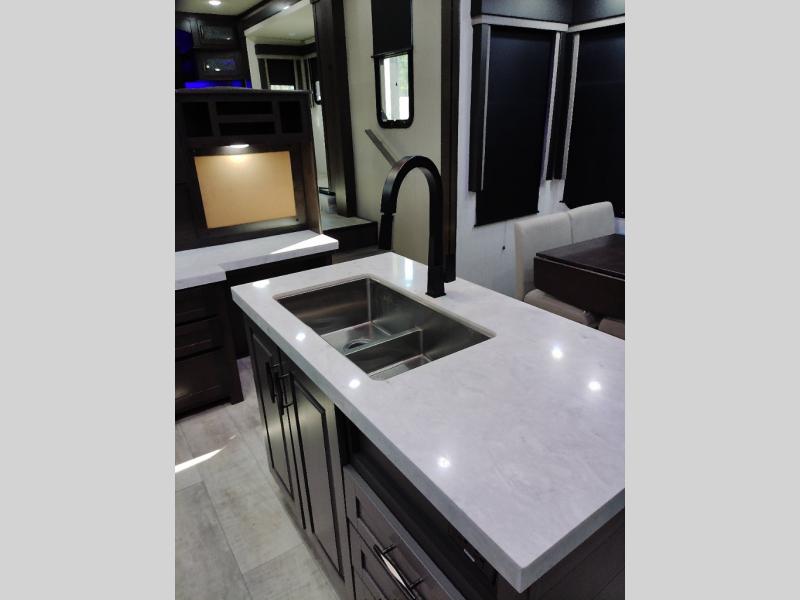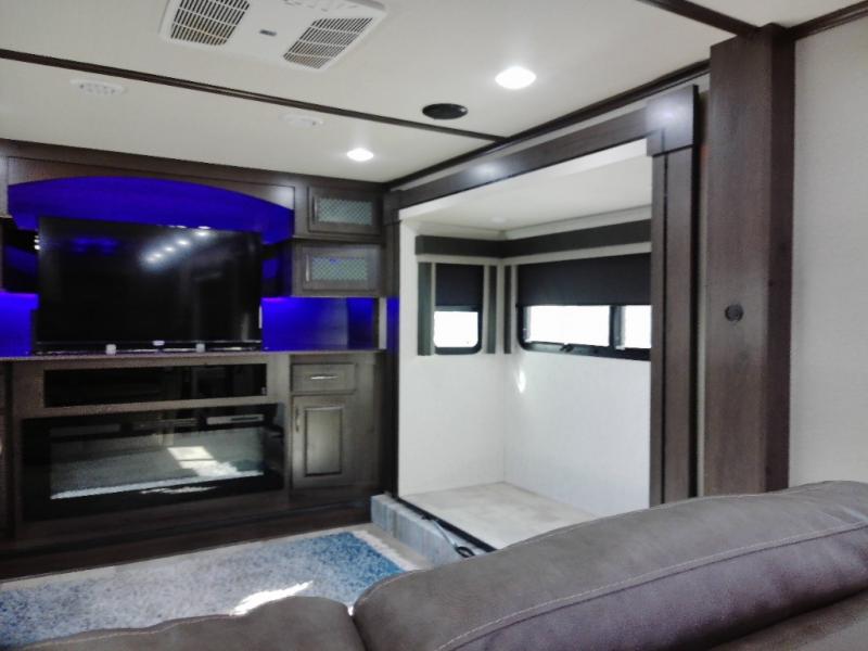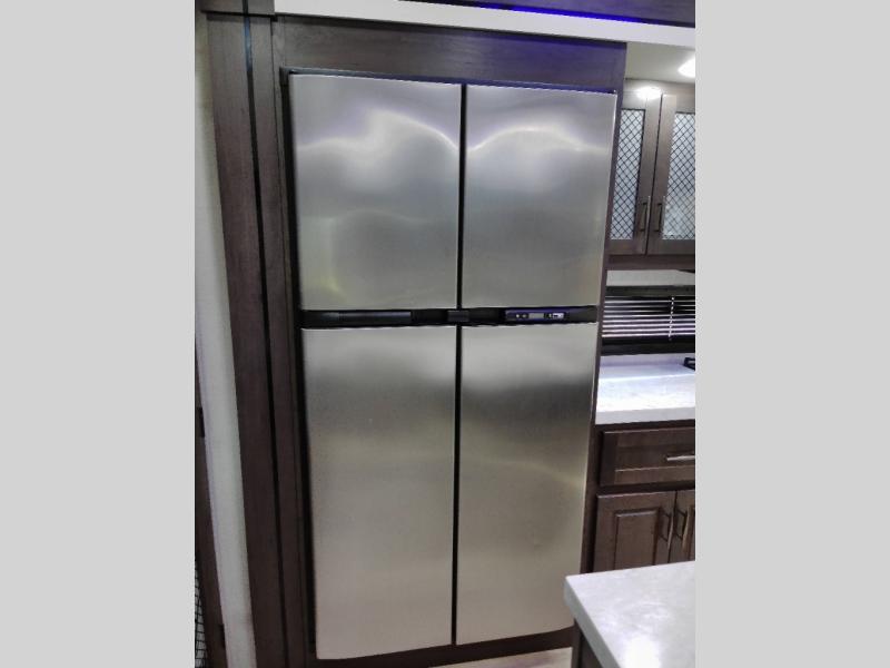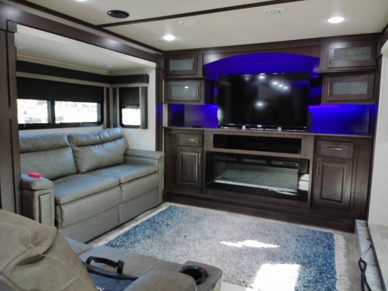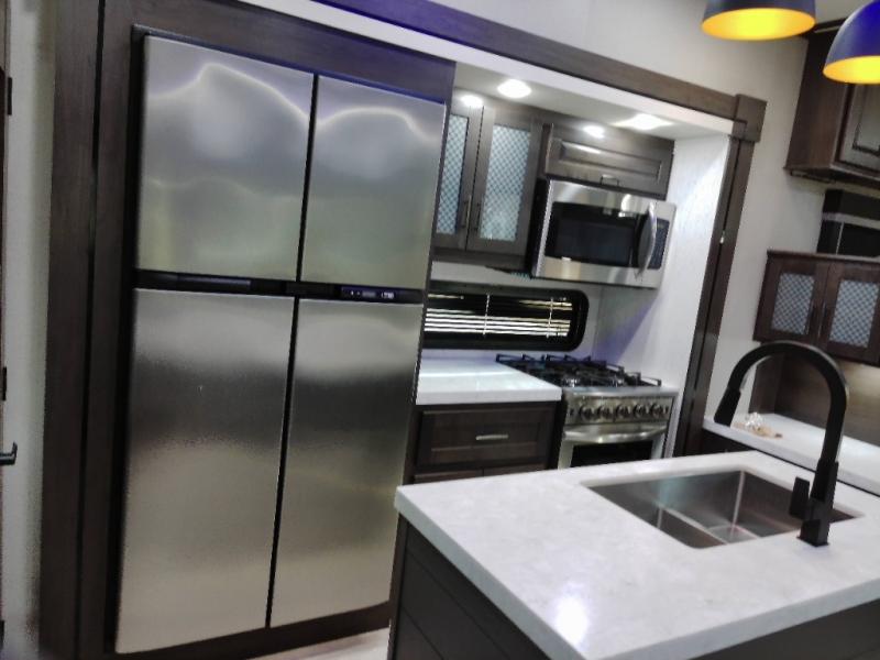 This unique fifth wheel offers a below-floor garage for your toy(s), an outside kitchen and LED TV, two pass-through compartments and two awnings, plus much more to enjoy the outdoors when you aren't inside soaking in the luxury and comfort! The front, separate living area gives you a place to relax with opposing tri-fold sofa slides and theatre seating or choose the lounge chairs option, and you can watch the 49" LED TV with fireplace below. The separate kitchen is spacious as well and includes a kitchen island with stools, a hutch and a desk, plus a free standing dinette within a slide with windows for great views. The pantry even has a prepped space for a washer/dryer option to keep the linens clean. You will enjoy dual access to the full bath, and the rear bedroom provides a walk-around queen bed or choose the king option, plenty of storage and USB charging outlets. If you would prefer to have a residential refrigerator, you should check out model 376THS-R!
