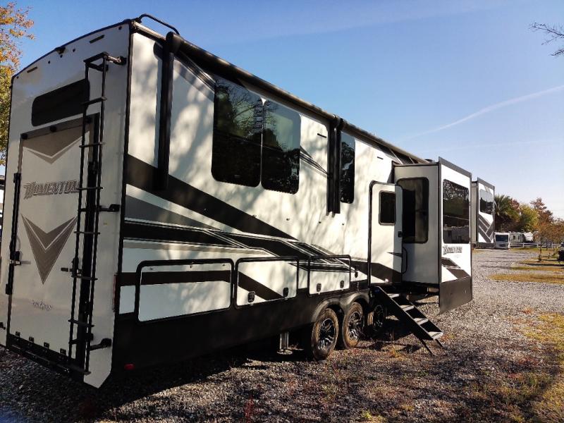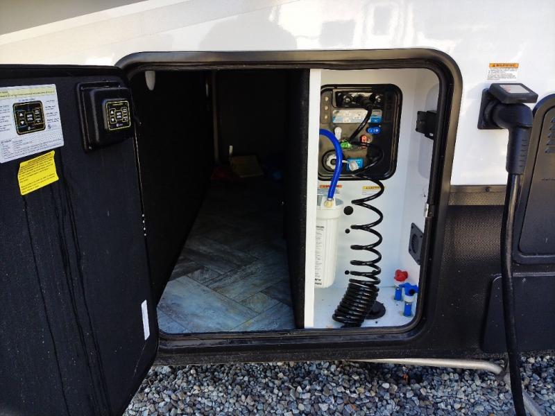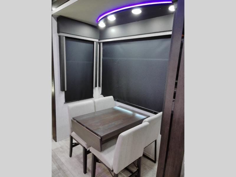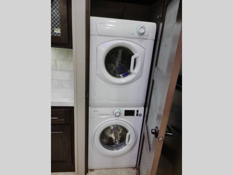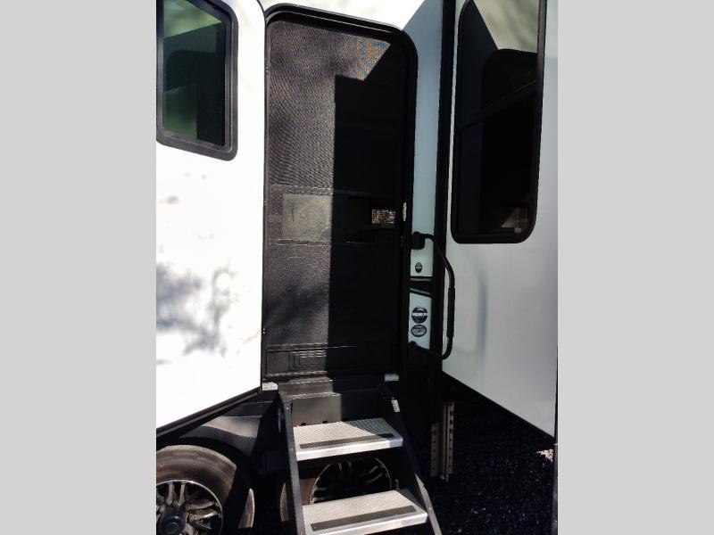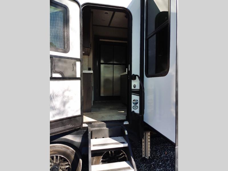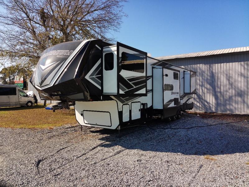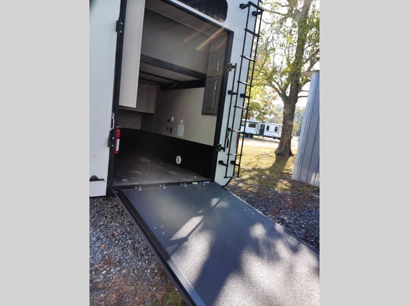 This unique fifth wheel offers a below-floor garage for your toy(s), an outside kitchen and LED TV, two pass-through compartments and two awnings, plus much more to enjoy the outdoors when you aren't inside soaking in the luxury and comfort! The front, separate living area gives you a place to relax with opposing tri-fold sofa slides and theatre seating or choose the lounge chairs option, and you can watch the 49" LED TV with fireplace below. The separate kitchen is spacious as well and includes a kitchen island with stools, a hutch and a desk, plus a free standing dinette within a slide with windows for great views. The pantry even has a prepped space for a washer/dryer option to keep the linens clean. You will enjoy dual access to the full bath, and the rear bedroom provides a walk-around queen bed or choose the king option, plenty of storage and USB charging outlets. If you would prefer to have a residential refrigerator, you should check out model 376THS-R!