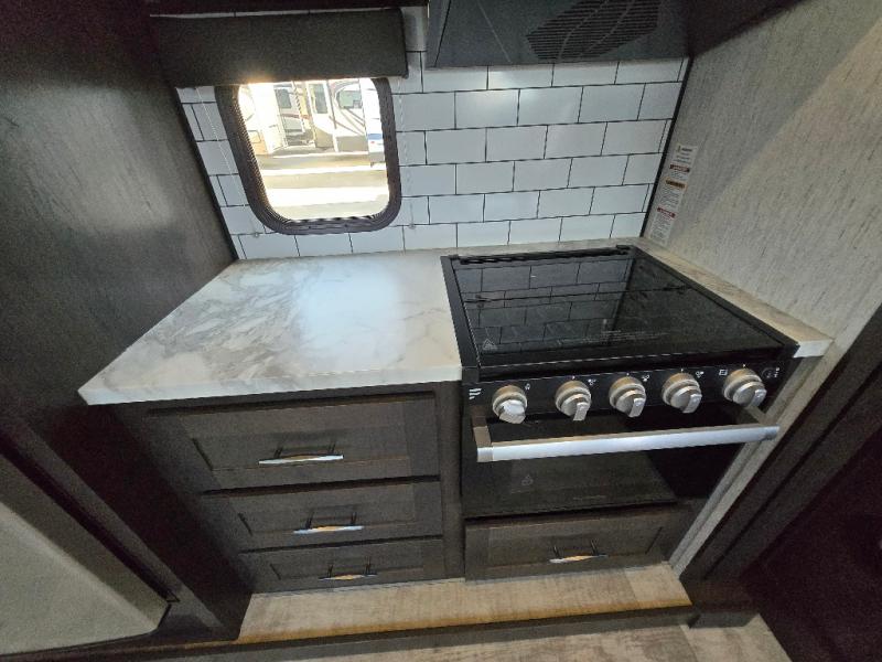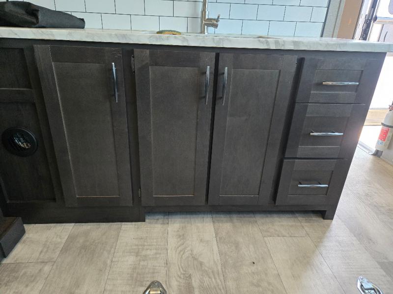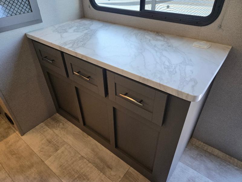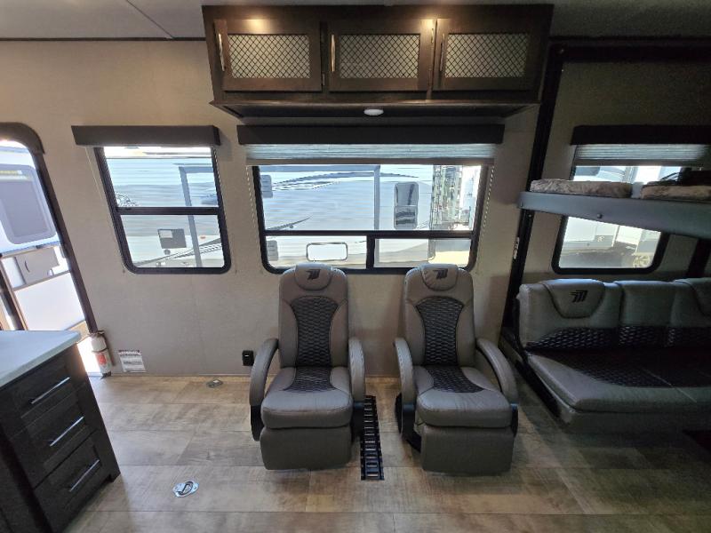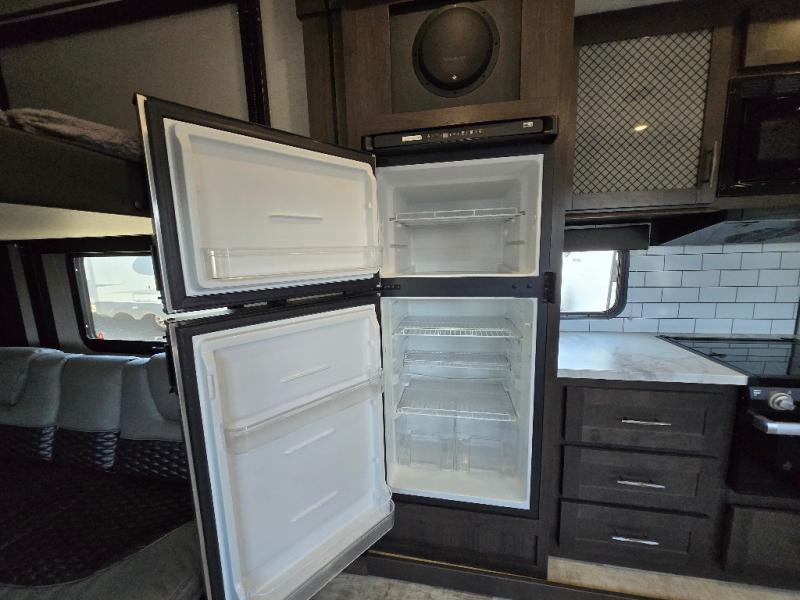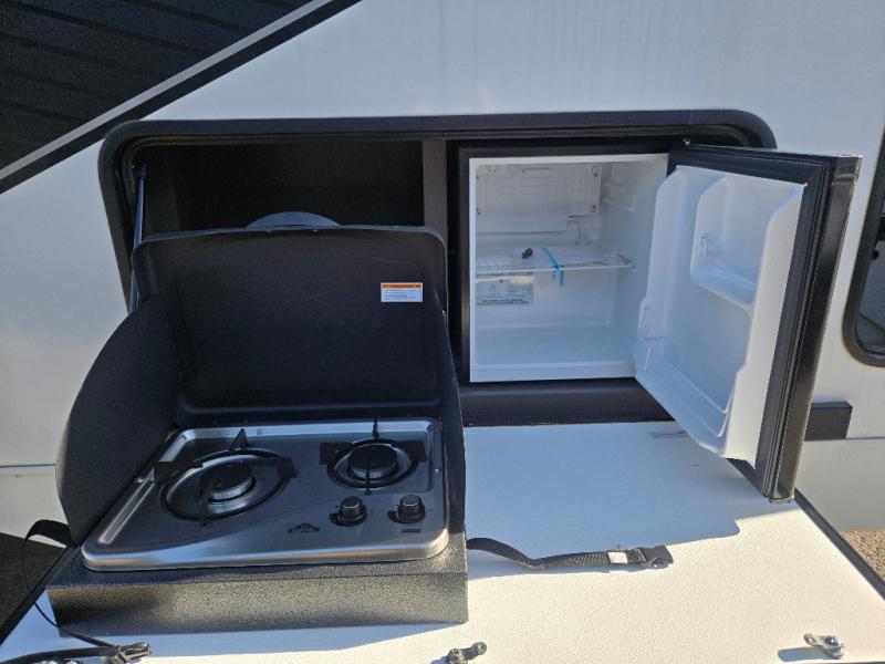 It's time to load up your family and off-road toys to enjoy the great outdoors at the speed you like with this Momentum G-Class toy hauler. Once at your destination, unload the toys from the 13' 6" of cargo space, put out the two slides, and start having fun. You can cook meals in the spacious kitchen area with extra counter space and relax in the Euro chairs or on the rollover sofas with a table. You can even cook at the outside kitchen underneath the 19' power awning. Once it's bedtime, the kids can sleep on the Happi-Jac power bunk or rollover sofas in the main area, and everyone is sure to appreciate the USB charging outlets to keep the electronics up and running just like the fuel station will do for the toys.