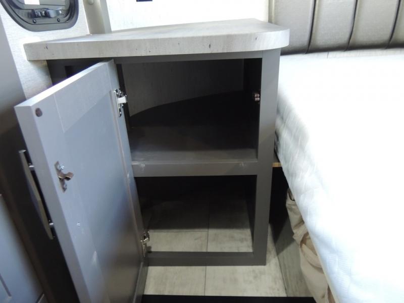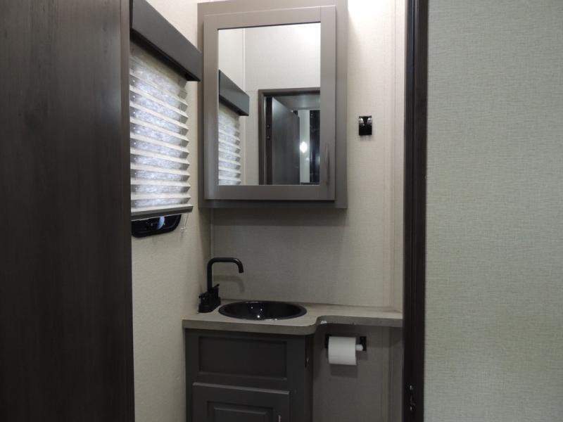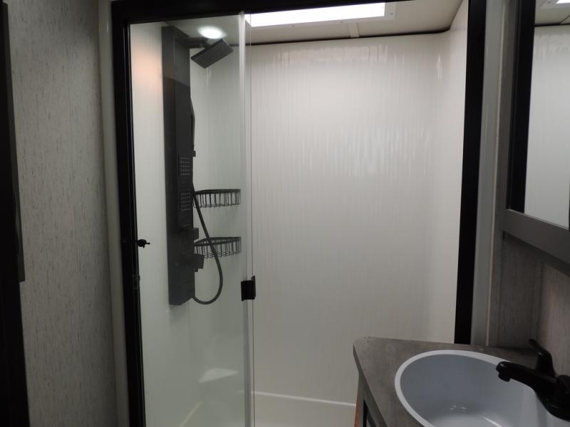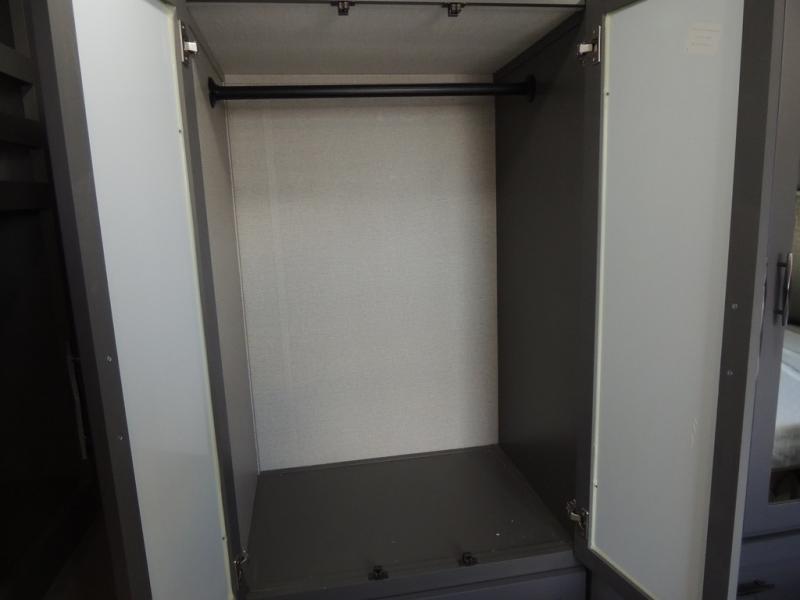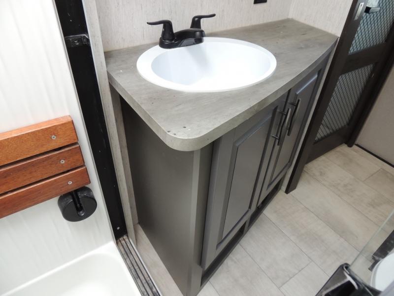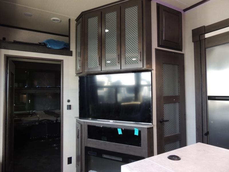 Traveling with friends and family can be comfortable when you have a full double entry bathroom and a half bath available when camping and enjoying the trails on your off-road toys! You will have an 11' garage space that can become a second living/dining area as well as a bedroom if you decide to add the Happi-Jac rollover sofas and a table with a top bed option, plus you can add other options such as an LED TV and/or a washer/dryer. There is an overhead loft bed and a four-seat sofa slide for more sleeping space in the main living area. Everyone can watch the 49" LED TV when waiting for dinner, and enjoy the fireplace on those chiller nights. The kitchen island offers a sink to wash dishes, extra counter space for serving meals and two stools to dine at. The cook will love all the upgraded appliances, and the space thanks to the slide. The front bedroom gives you a queen bed slide or choose a king, lots of clothing space, and a flip-up dresser for even more storage. If you want more garage space, take a look at 381MS!