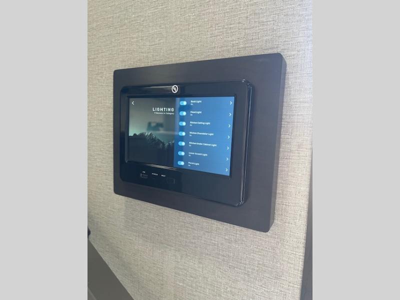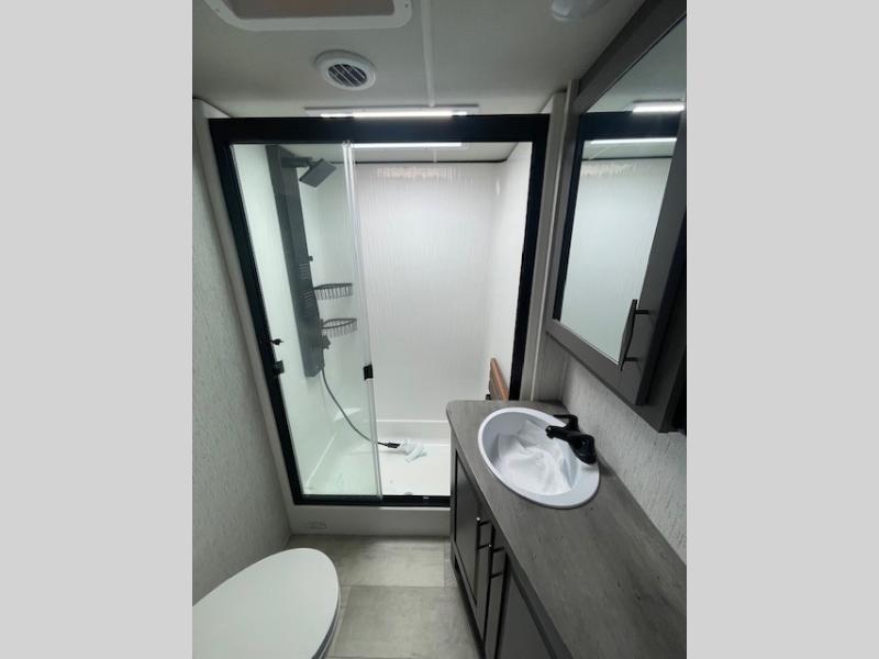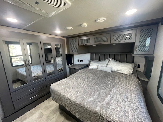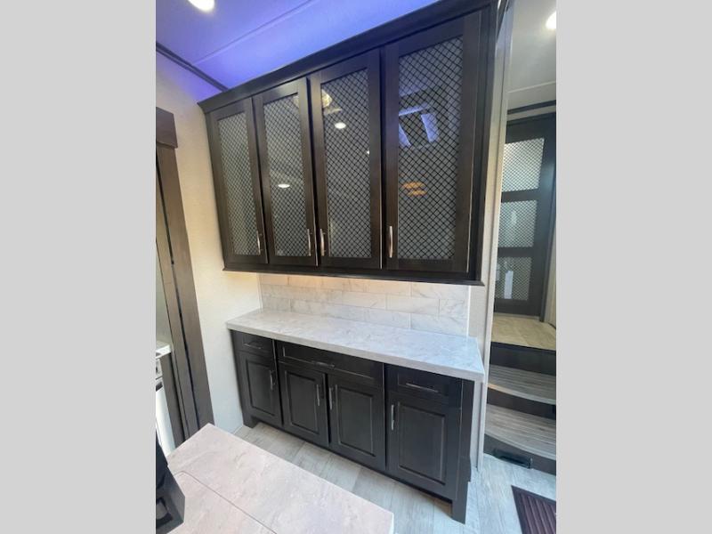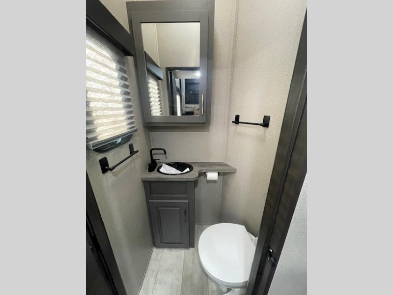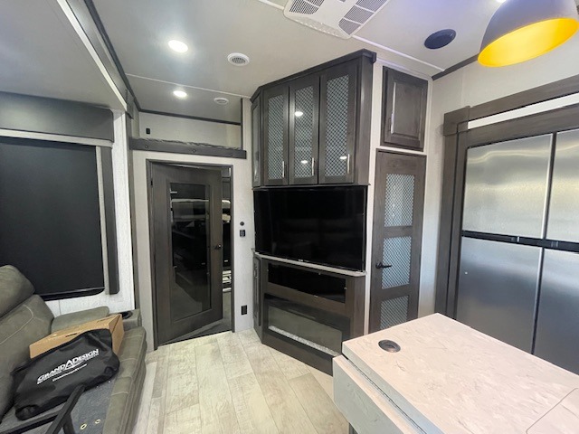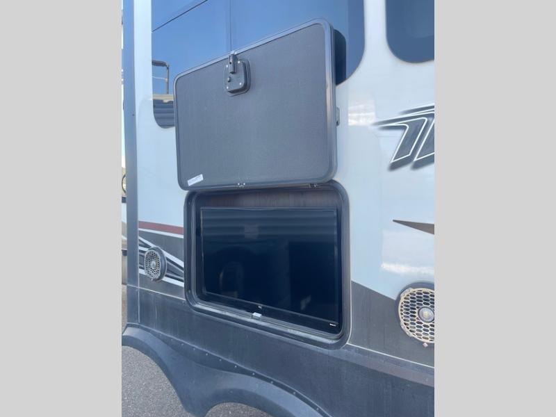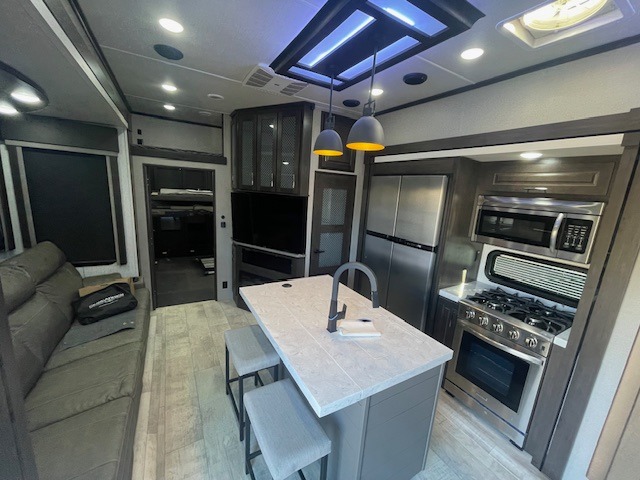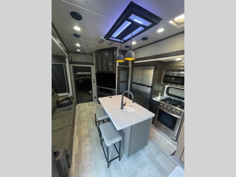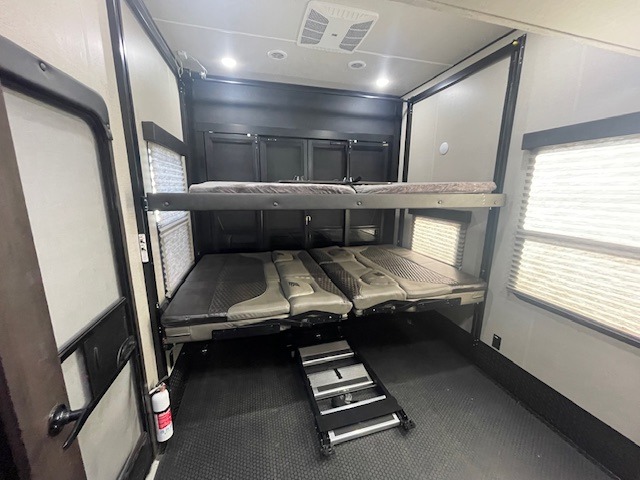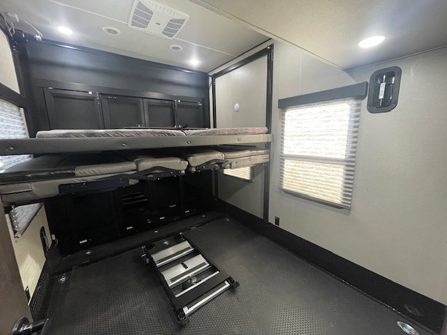 Traveling with friends and family can be comfortable when you have a full double entry bathroom and a half bath available when camping and enjoying the trails on your off-road toys! You will have an 11' garage space that can become a second living/dining area as well as a bedroom if you decide to add the Happi-Jac rollover sofas and a table with a top bed option, plus you can add other options such as an LED TV and/or a washer/dryer. There is an overhead loft bed and a four-seat sofa slide for more sleeping space in the main living area. Everyone can watch the 49" LED TV when waiting for dinner, and enjoy the fireplace on those chiller nights. The kitchen island offers a sink to wash dishes, extra counter space for serving meals and two stools to dine at. The cook will love all the upgraded appliances, and the space thanks to the slide. The front bedroom gives you a queen bed slide or choose a king, lots of clothing space, and a flip-up dresser for even more storage. If you want more garage space, take a look at 381MS!