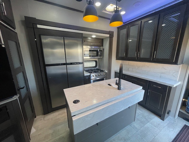 The Momentum M-Class fifth wheel toy haulers by Grand Design are lighter than the Momentum yet aren't lightweight on features when it comes to elegant design, luxury and a "Class" of its own! The chef-inspired kitchen provides a free-standing 3.7 cu. ft. gas range, a four burner cooktop with cast iron grill, an electronic ignition oven, and a digital display and interior oven light, plus 42,500 BTU of cooking power. The upgraded main bathroom offers solid surface counter tops, a three-jet shower panel system, a shower wand, and a teak bench seat. Each toy hauler includes a triple insulated garage floor, Tuff-Ply gas and oil resistant garage flooring, 2,500 lb. rated flush-mount tie-downs, and a Fast Ramp rear ramp door with two-sided lift-assist technology making it easy for one person to operate. And the MORryde CRE3000 suspension system and the rubber pin box, plus the upgraded axle hangers provide performance and smooth towing to your favorite destinations!