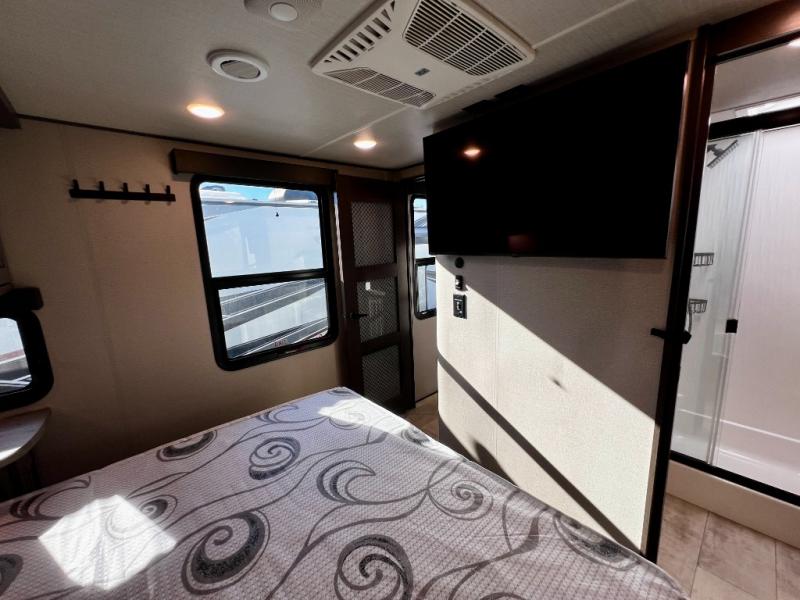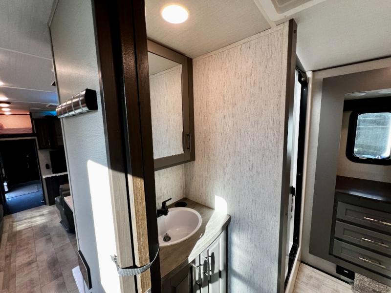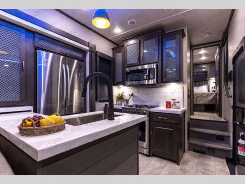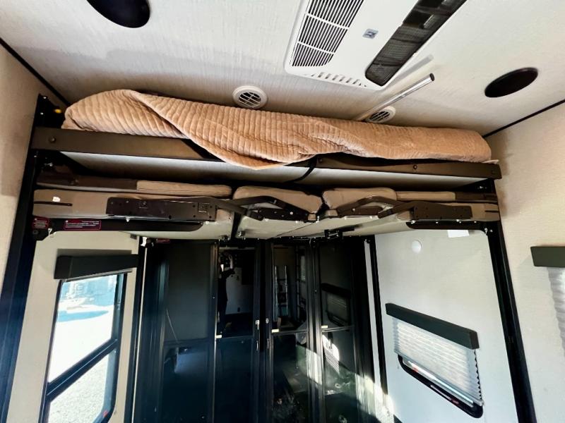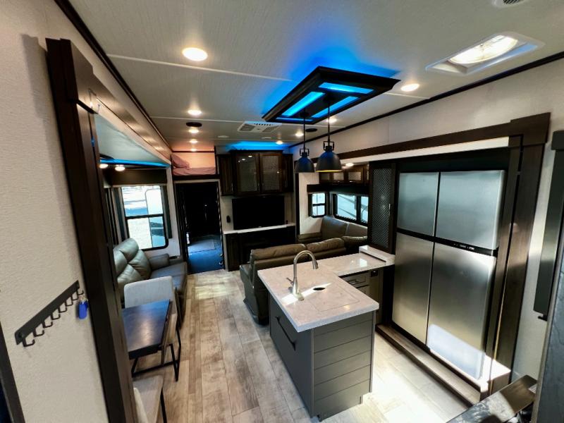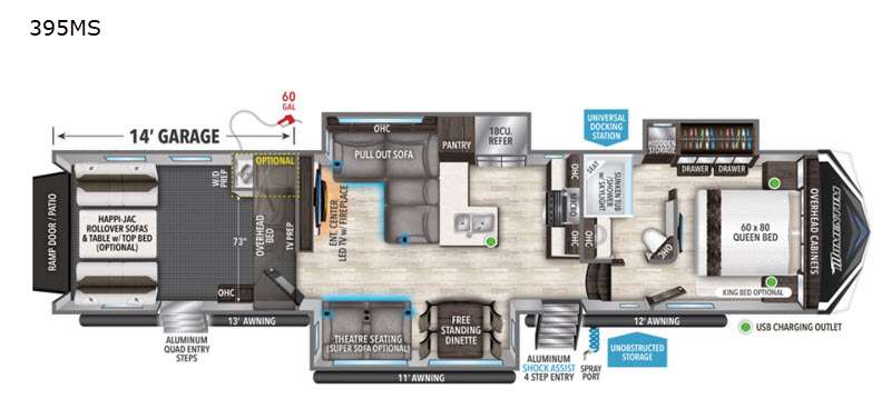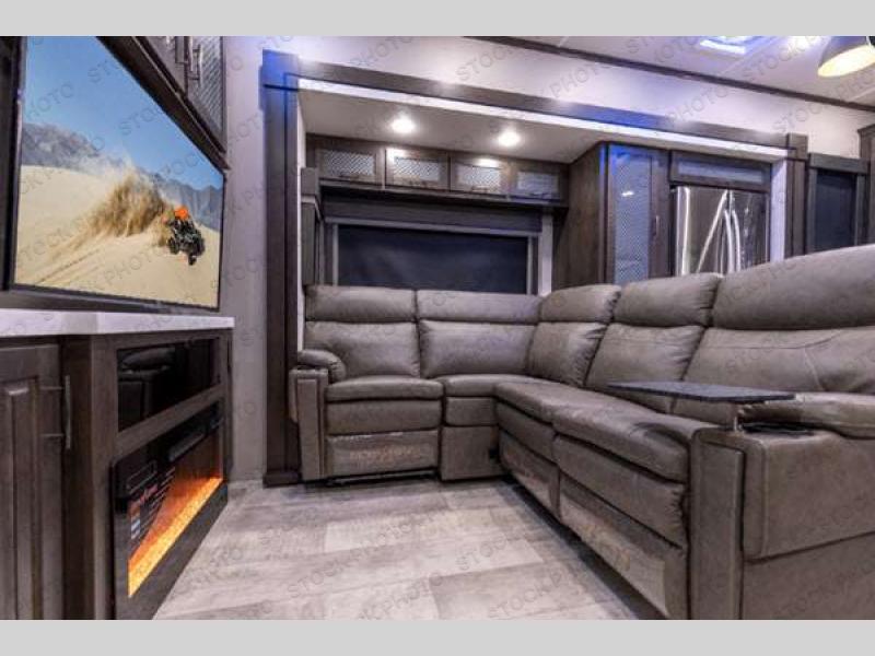 You won't believe all that this Momentum M-Class toy hauler has to offer! From the front master suite with a queen bed, a wardrobe slide with drawers and a hidden storage area, and an entrance into the dual-entry bathroom to the two main entry doors, this unit has quite the convenience. The rear ramp door makes it easy to load and unload your toys, and if you choose to add the optional patio system, then you can look out at your beautiful scenery as you sit back and relax. The garage area has an overhead loft bed and the option to add a half bathroom as well as an optional washer and dryer. The living area has an L-shaped pull-out sofa for you to relax on as you enjoy the entertainment center with a fireplace and a 49" LED TV. There are three power awnings to keep you protected outside and an unobstructed storage area to keep all of your outdoor camping gear! If you would prefer to have a residential refrigerator, you should check out model 395MS-R!