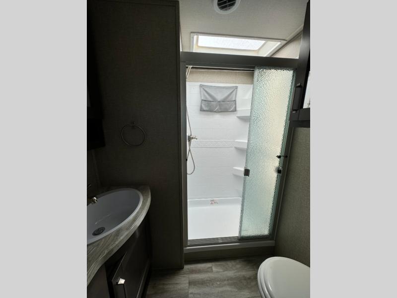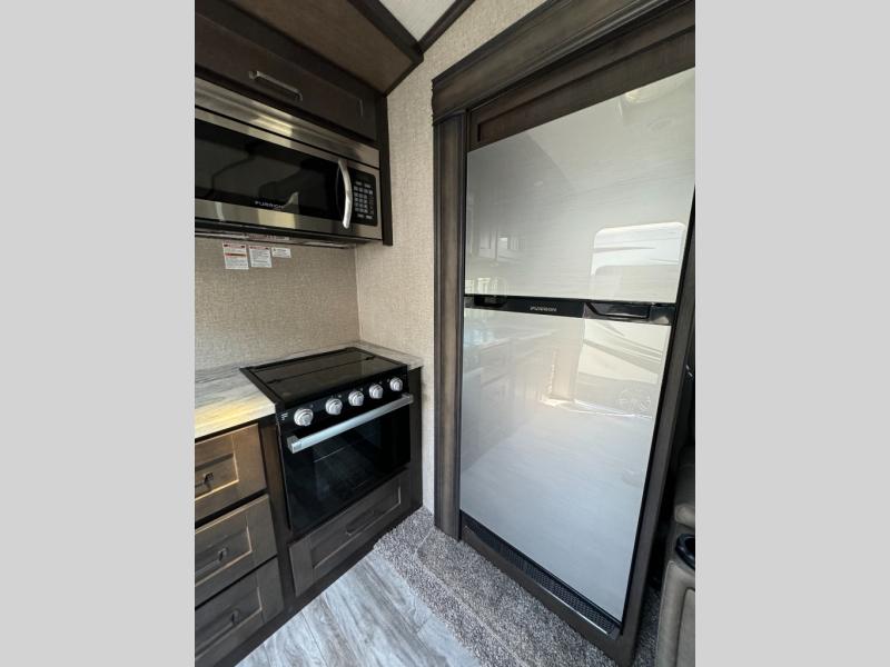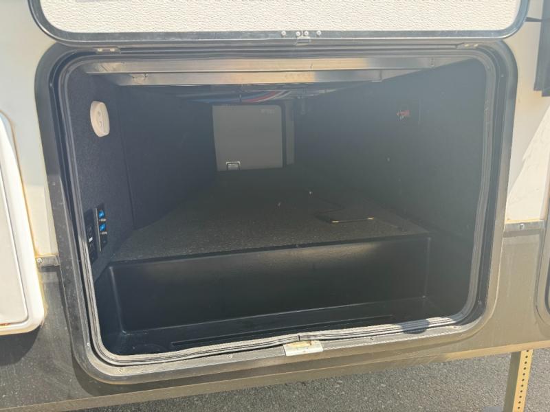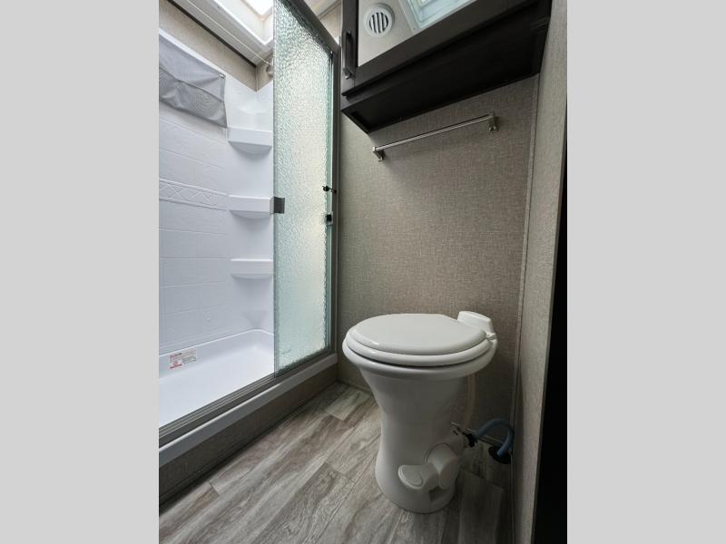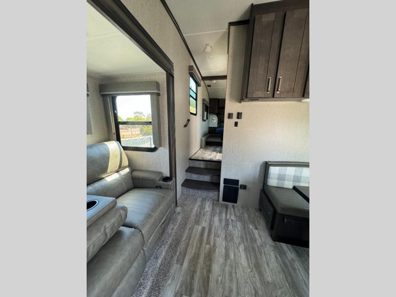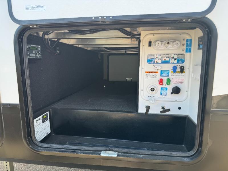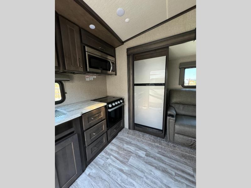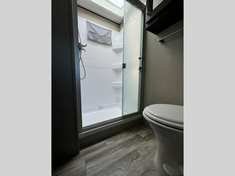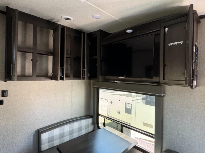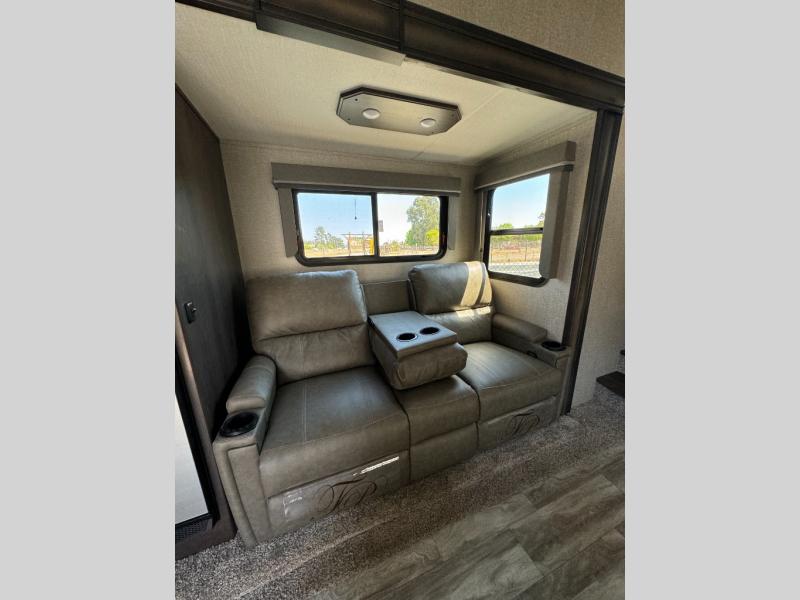 Enjoy a weekend getaway at a campground or off-grid in this fifth wheel! The front private bedroom has a queen bed for you to lay your head on at night and overhead cabinets to keep things out of the way. Inside the full bathroom there is a shower with a skylight for added natural lighting as you get ready each morning. Once you have prepared a delicious home cooked meal at the rear kitchen, head to the booth dinette for a comfortable place to enjoy it. What better way to wind down your nights than to relax on the 70" theatre seating and watch your favorite movie on the 40" LED HDTV. The theatre seats can also be switched out for an optional tri-fold seating if you would prefer that type of seating.