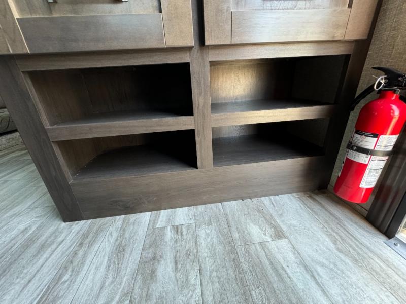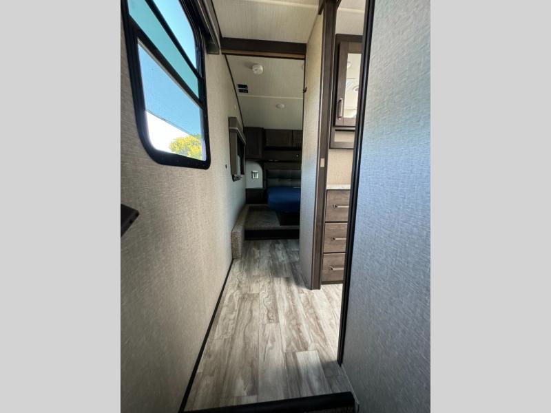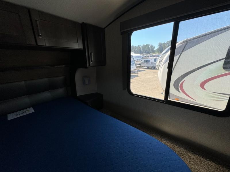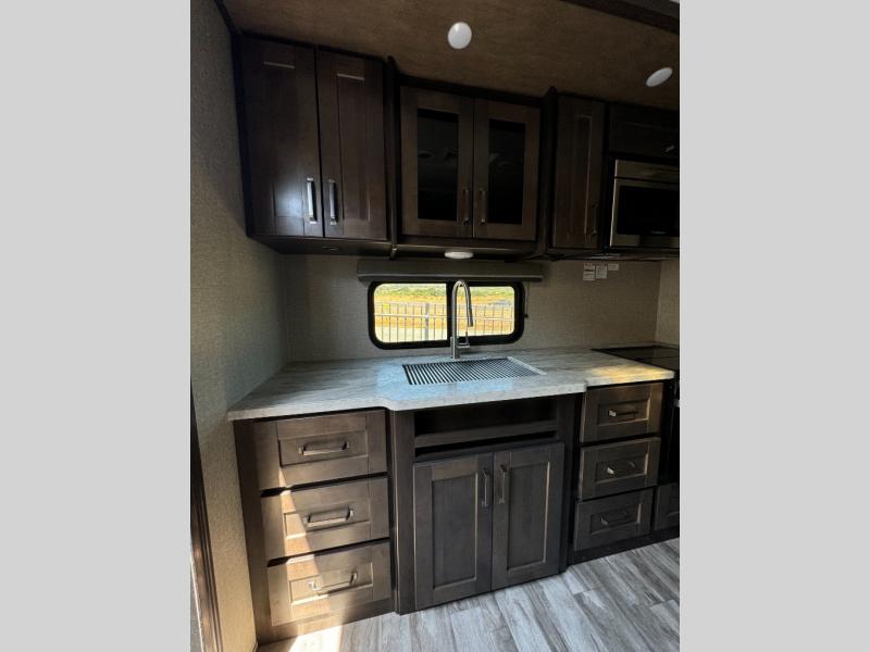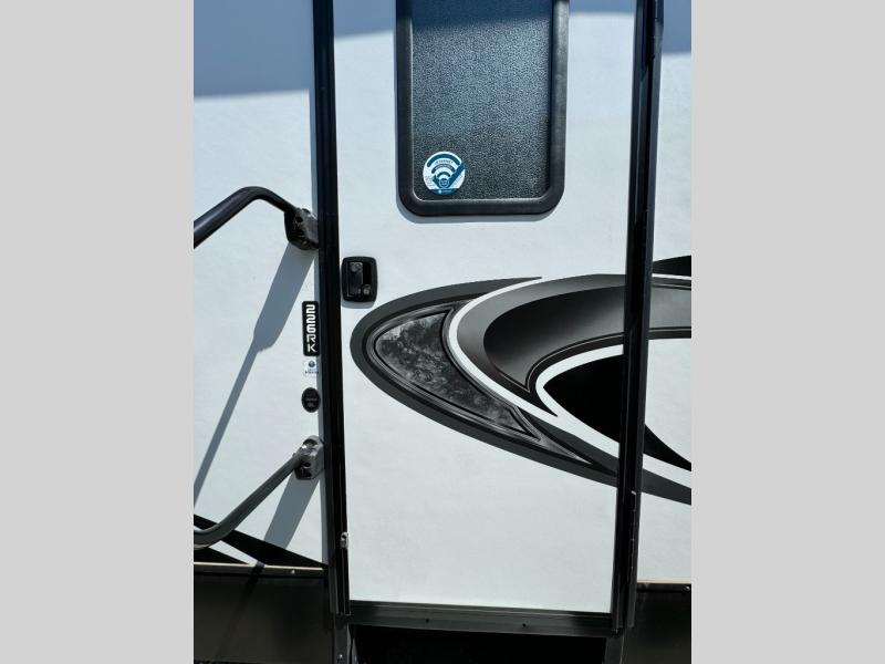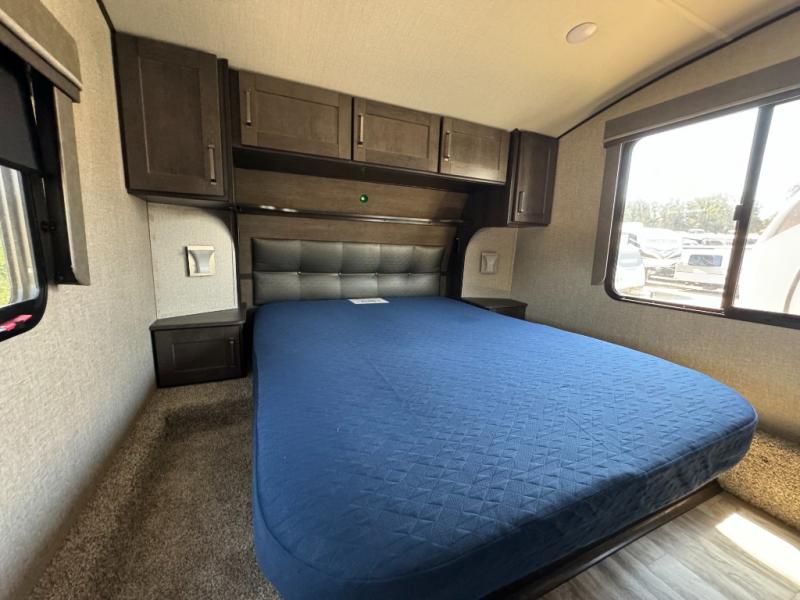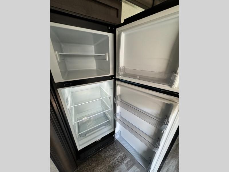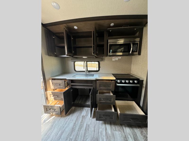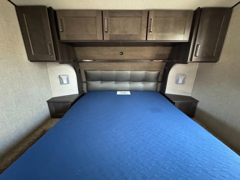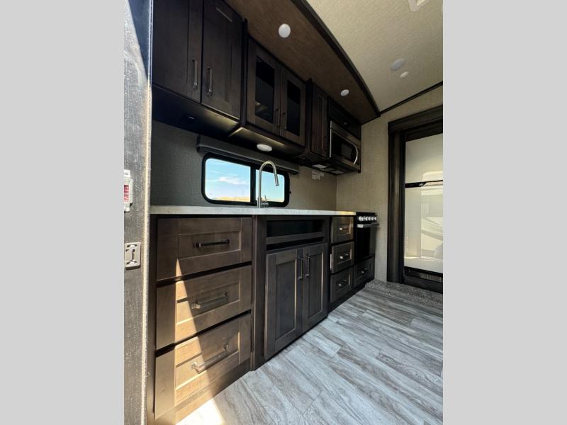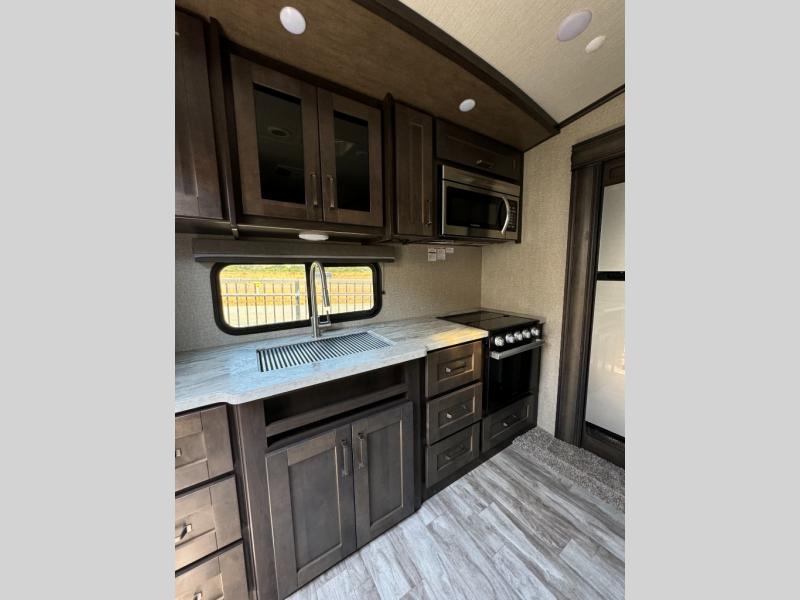 Enjoy a weekend getaway at a campground or off-grid in this fifth wheel! The front private bedroom has a queen bed for you to lay your head on at night and overhead cabinets to keep things out of the way. Inside the full bathroom there is a shower with a skylight for added natural lighting as you get ready each morning. Once you have prepared a delicious home cooked meal at the rear kitchen, head to the booth dinette for a comfortable place to enjoy it. What better way to wind down your nights than to relax on the 70" theatre seating and watch your favorite movie on the 40" LED HDTV. The theatre seats can also be switched out for an optional tri-fold seating if you would prefer that type of seating.