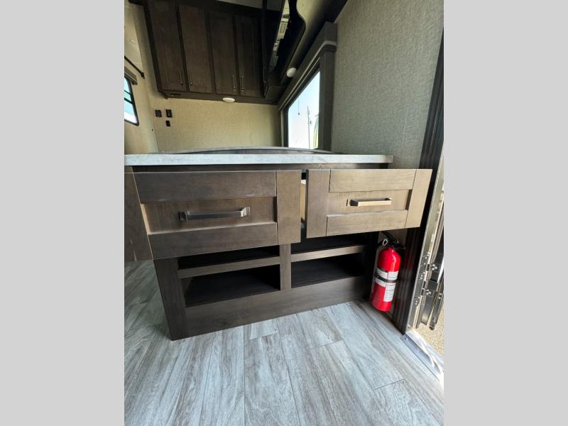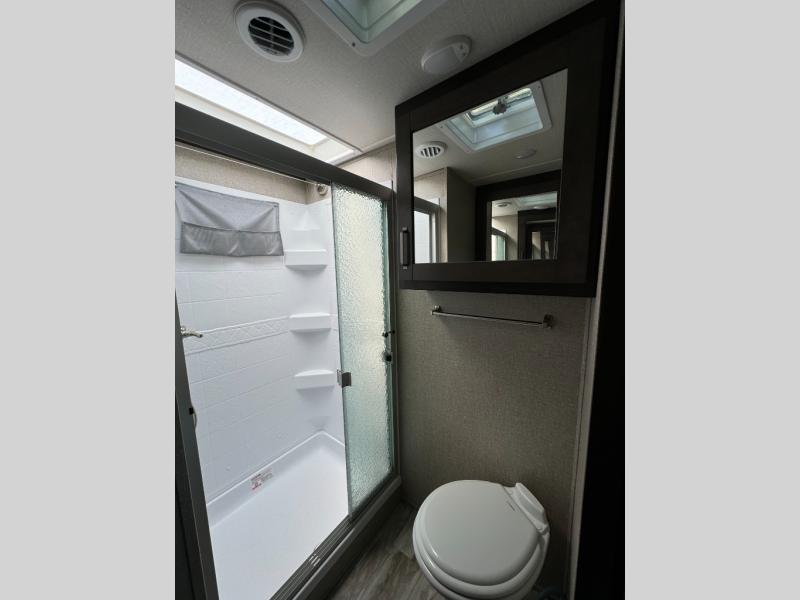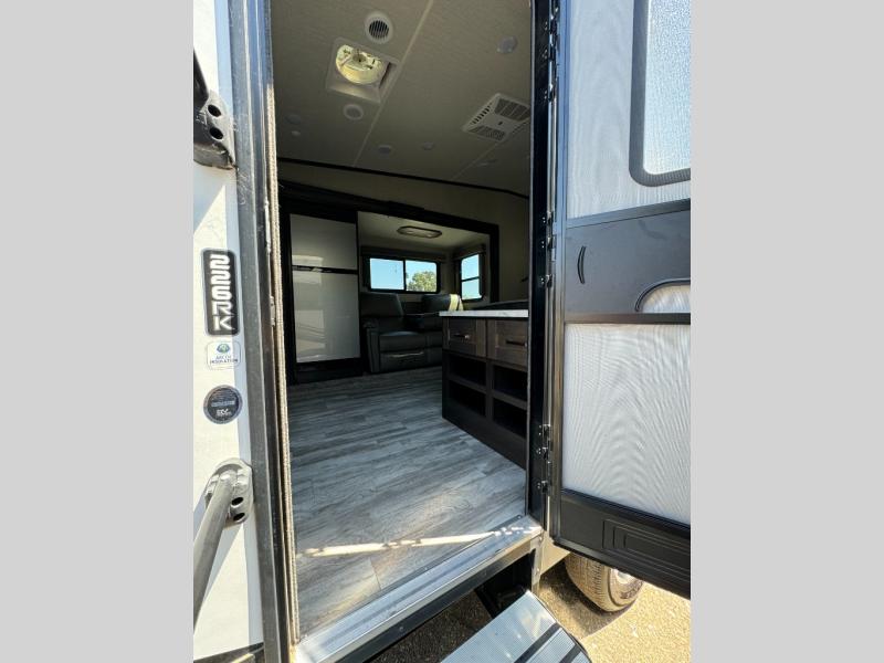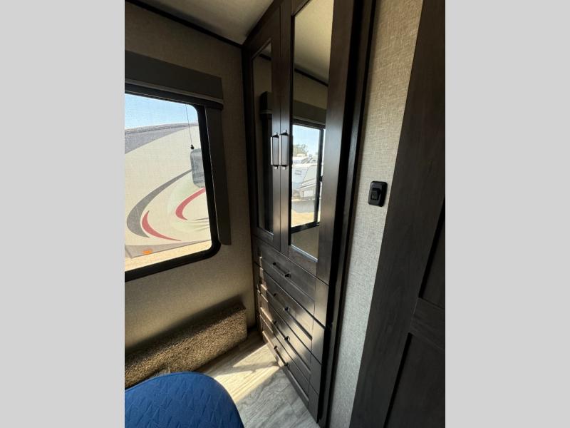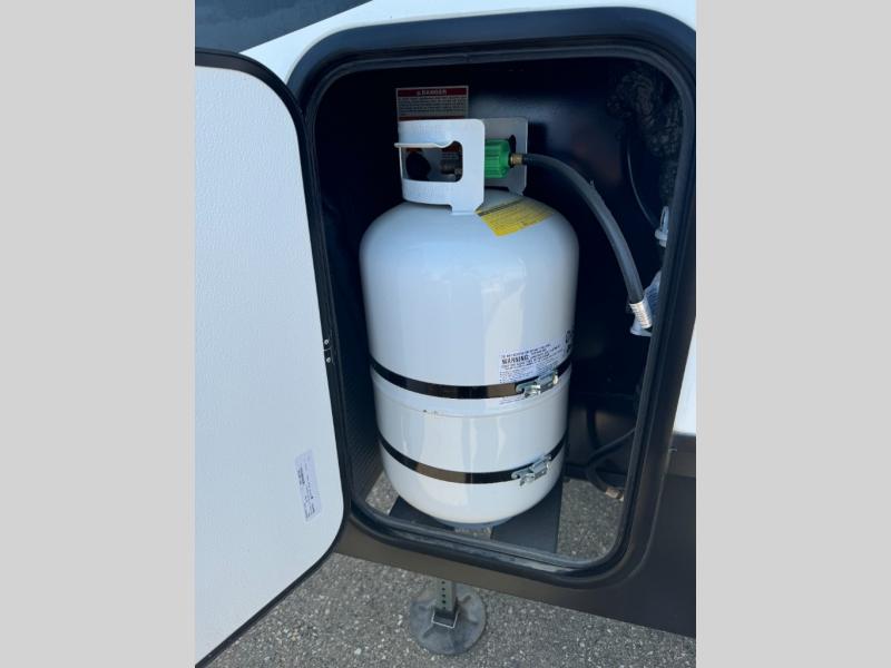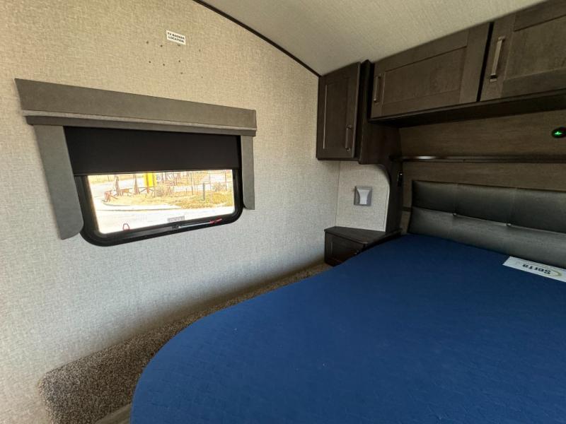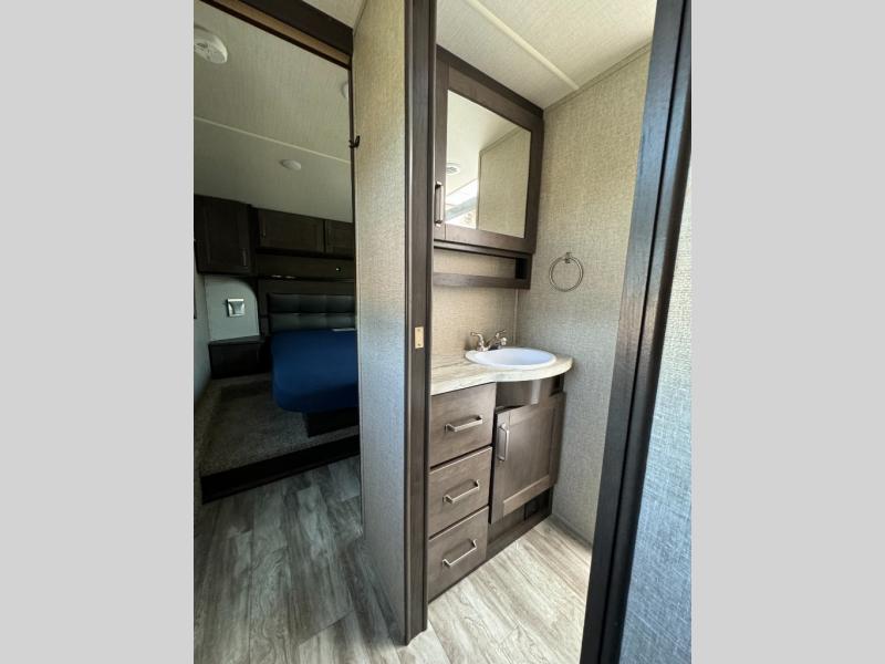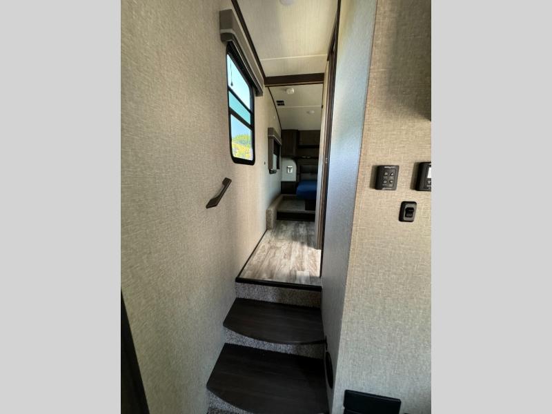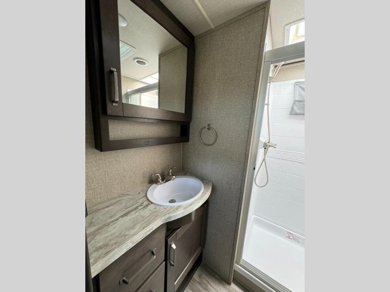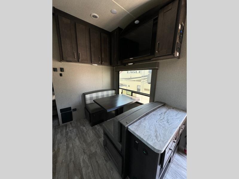 Enjoy a weekend getaway at a campground or off-grid in this fifth wheel! The front private bedroom has a queen bed for you to lay your head on at night and overhead cabinets to keep things out of the way. Inside the full bathroom there is a shower with a skylight for added natural lighting as you get ready each morning. Once you have prepared a delicious home cooked meal at the rear kitchen, head to the booth dinette for a comfortable place to enjoy it. What better way to wind down your nights than to relax on the 70" theatre seating and watch your favorite movie on the 40" LED HDTV. The theatre seats can also be switched out for an optional tri-fold seating if you would prefer that type of seating.