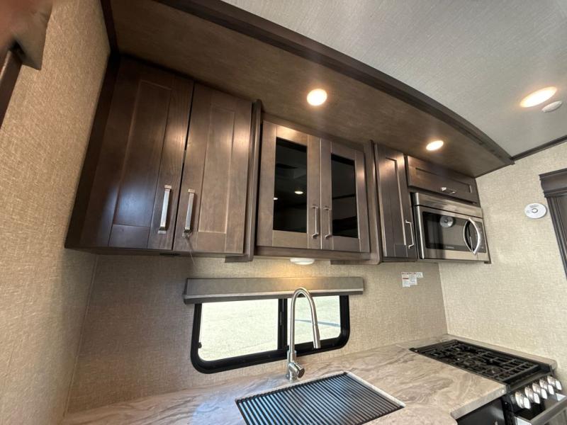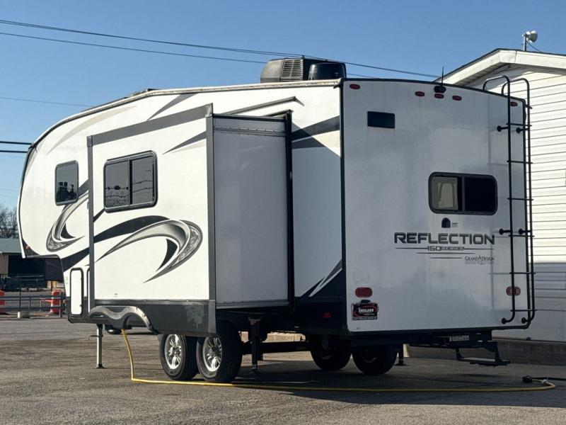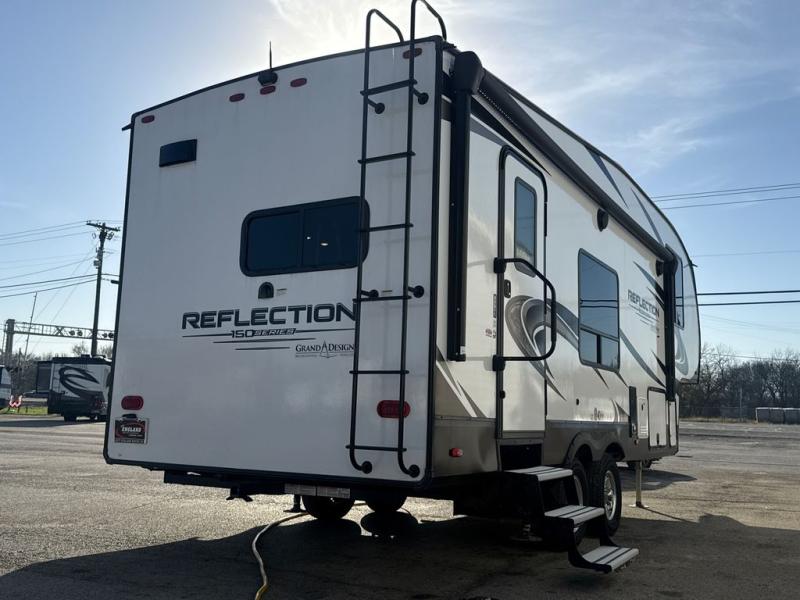 With any Reflection 150 Series fifth wheel by Grand Design, there is more available payload capacity and a broader range of half-ton trucks capable of towing this fifth wheel, and no slider hitch is needed thanks to the 90-degree turning radius which makes them short bed friendly and easier to tow. The mandatory Ultimate Power package provides a "One-Touch" automatic leveling system and a detachable power cord with LED light for easy setup, plus motion sensor pass-through lighting and entry lighting, and the Tire Linc TPMS will help you stay safe on the road. The interior offers residential luxury from the cabinetry and gunstock hardware plus the booth dinette to the residential-style window treatment. Make your refined decision today!