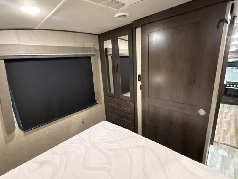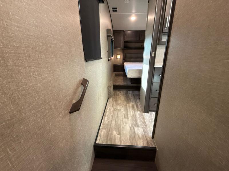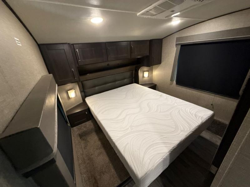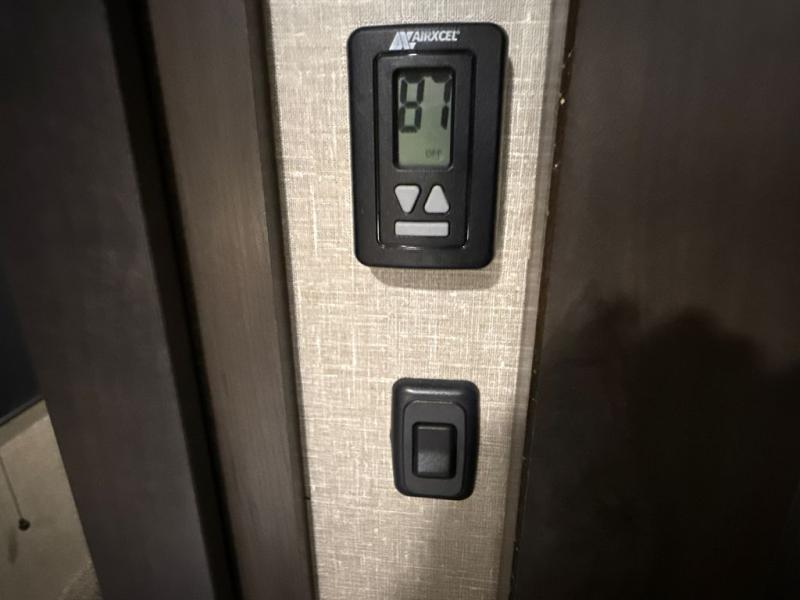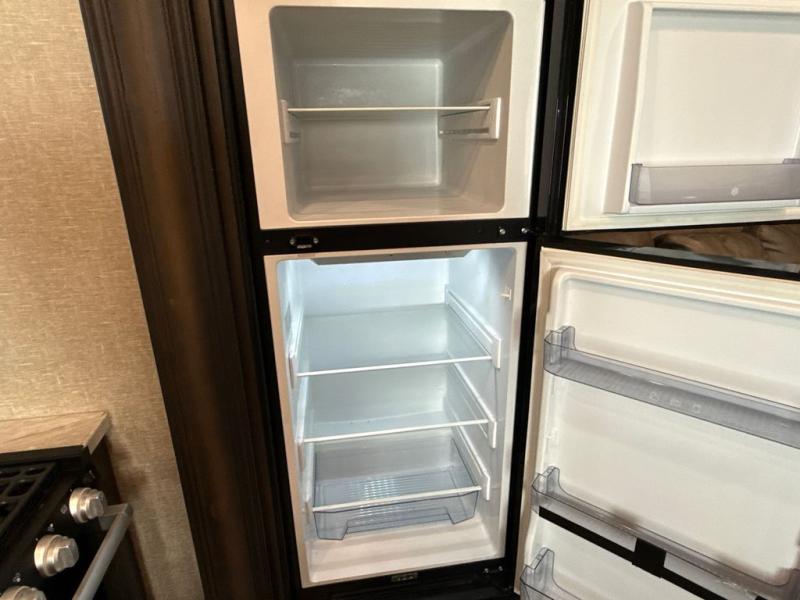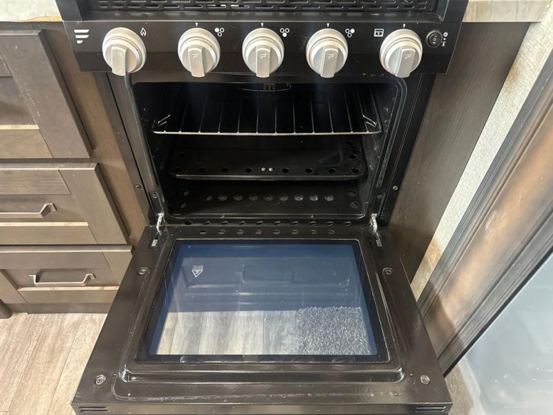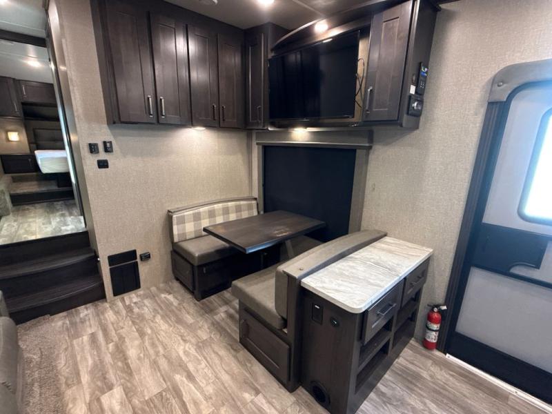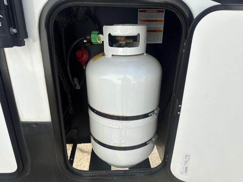 Enjoy a weekend getaway at a campground or off-grid in this fifth wheel! The front private bedroom has a queen bed for you to lay your head on at night and overhead cabinets to keep things out of the way. Inside the full bathroom there is a shower with a skylight for added natural lighting as you get ready each morning. Once you have prepared a delicious home cooked meal at the rear kitchen, head to the booth dinette for a comfortable place to enjoy it. What better way to wind down your nights than to relax on the 70" theatre seating and watch your favorite movie on the 40" LED HDTV. The theatre seats can also be switched out for an optional tri-fold seating if you would prefer that type of seating.