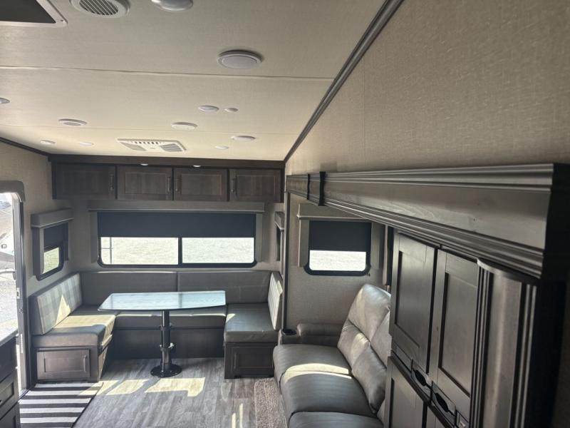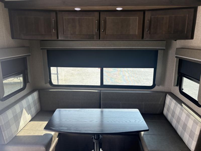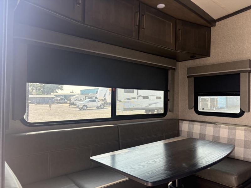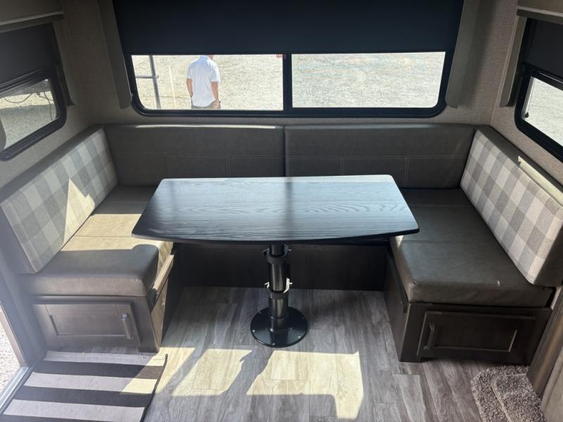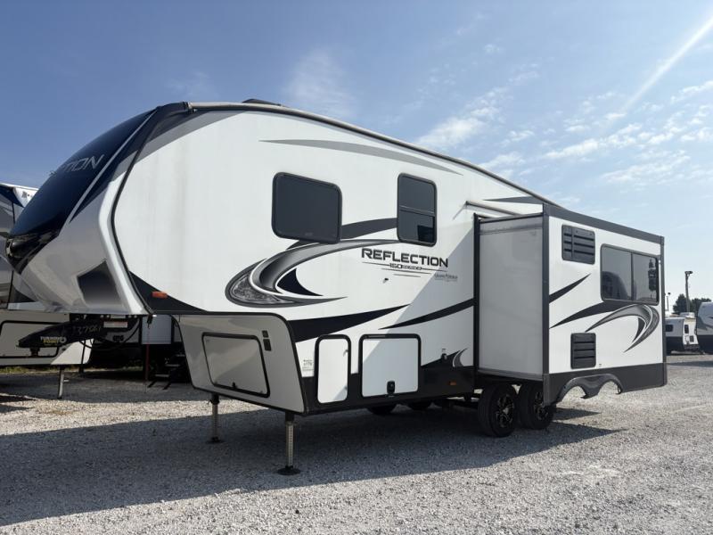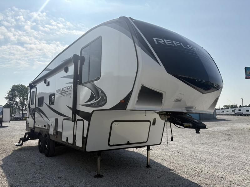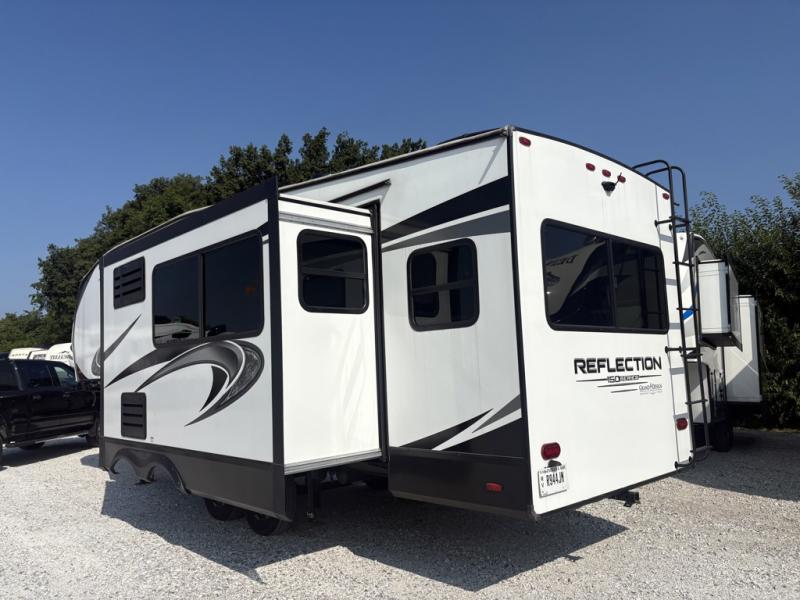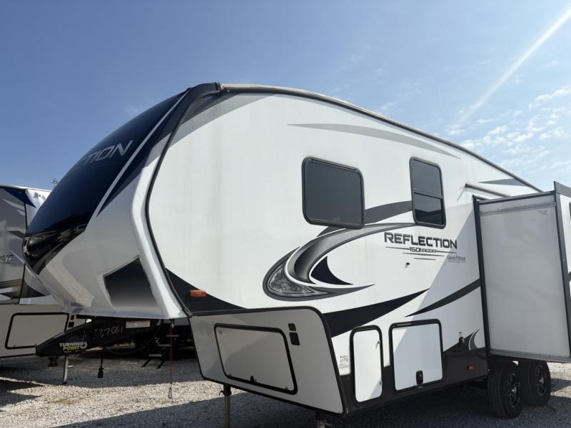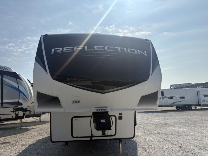 With any Reflection 150 Series fifth wheel by Grand Design, there is more available payload capacity and a broader range of half-ton trucks capable of towing this fifth wheel, and no slider hitch is needed thanks to the 90-degree turning radius which makes them short bed friendly and easier to tow. The mandatory Ultimate Power package provides a "One-Touch" automatic leveling system and a detachable power cord with LED light for easy setup, plus motion sensor pass-through lighting and entry lighting, and the Tire Linc TPMS will help you stay safe on the road. The interior offers residential luxury from the cabinetry and gunstock hardware plus the booth dinette to the residential-style window treatment. Make your refined decision today!