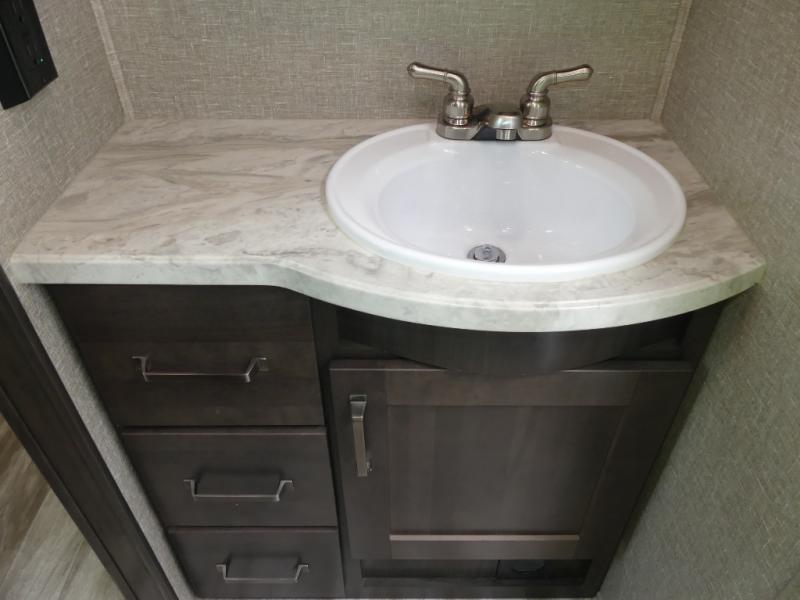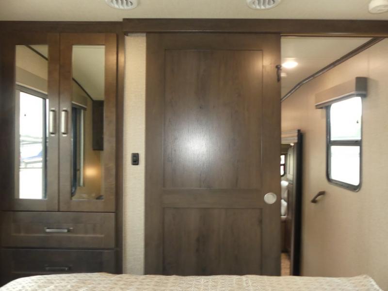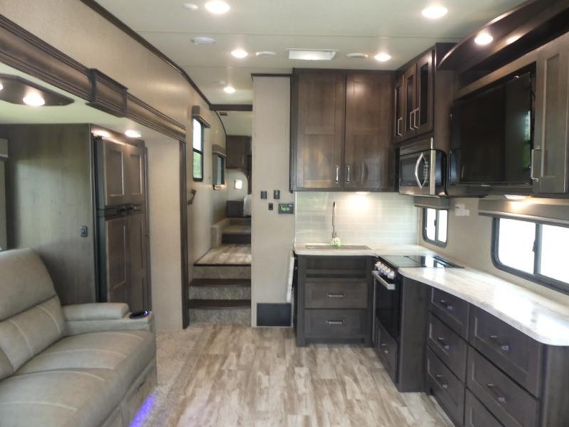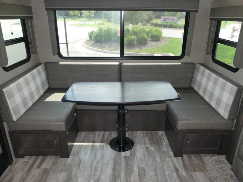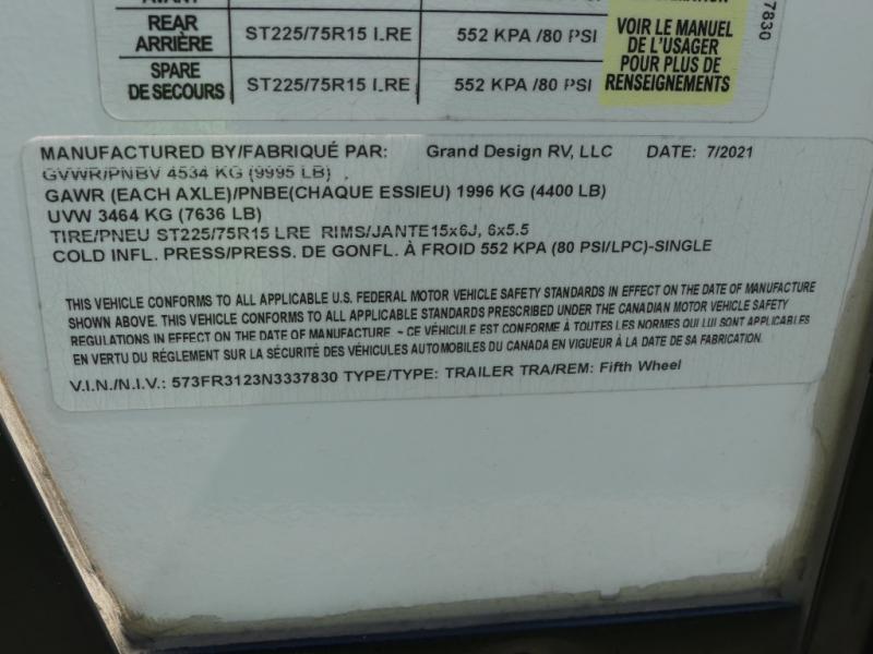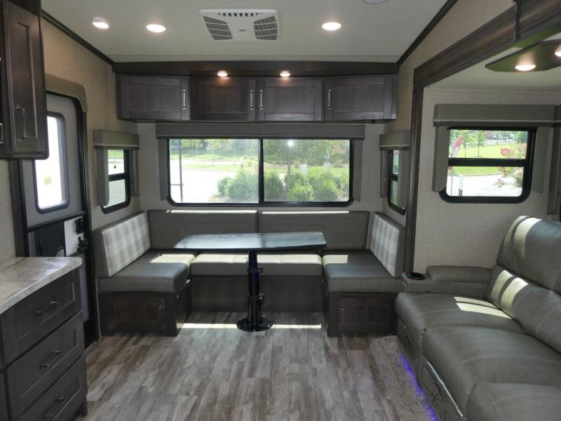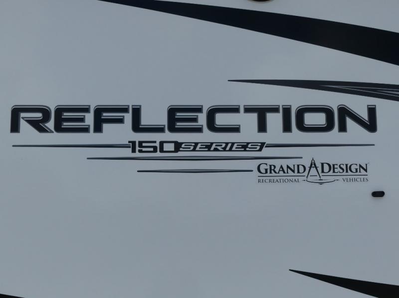 With any Reflection 150 Series fifth wheel by Grand Design, there is more available payload capacity and a broader range of half-ton trucks capable of towing this fifth wheel, and no slider hitch is needed thanks to the 90-degree turning radius which makes them short bed friendly and easier to tow. The mandatory Ultimate Power package provides a "One-Touch" automatic leveling system and a detachable power cord with LED light for easy setup, plus motion sensor pass-through lighting and entry lighting, and the Tire Linc TPMS will help you stay safe on the road. The interior offers residential luxury from the cabinetry and gunstock hardware plus the booth dinette to the residential-style window treatment. Make your refined decision today!