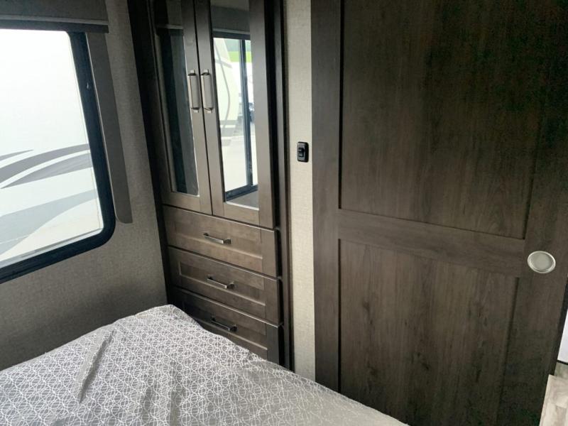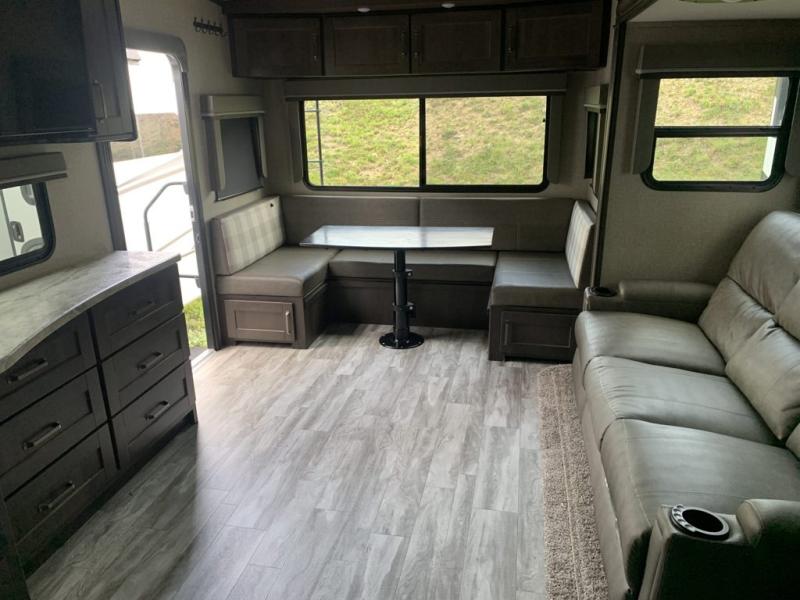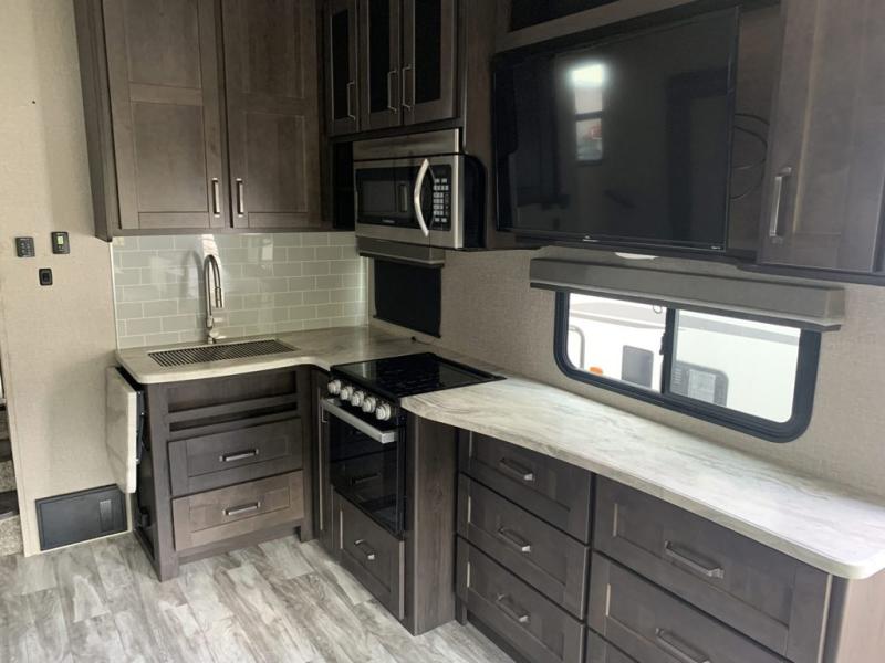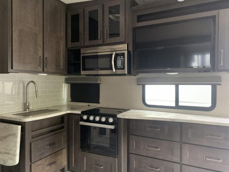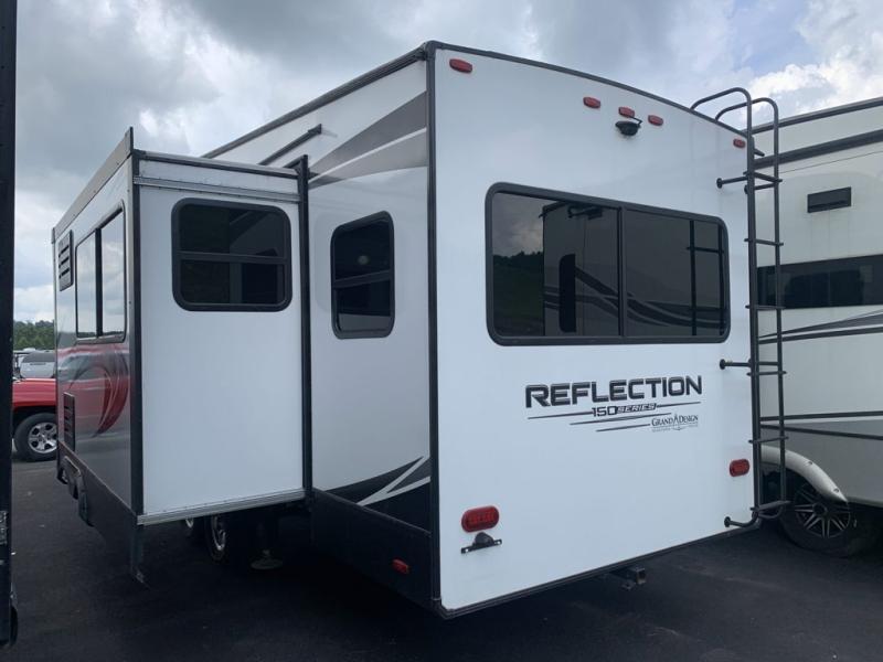 With any Reflection 150 Series fifth wheel by Grand Design, there is more available payload capacity and a broader range of half-ton trucks capable of towing this fifth wheel, and no slider hitch is needed thanks to the 90-degree turning radius which makes them short bed friendly and easier to tow. The mandatory Ultimate Power package provides a "One-Touch" automatic leveling system and a detachable power cord with LED light for easy setup, plus motion sensor pass-through lighting and entry lighting, and the Tire Linc TPMS will help you stay safe on the road. The interior offers residential luxury from the cabinetry and gunstock hardware plus the booth dinette to the residential-style window treatment. Make your refined decision today!