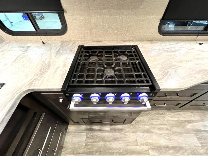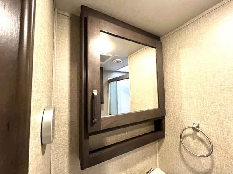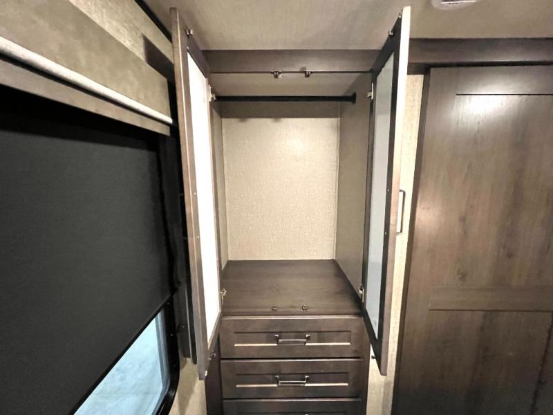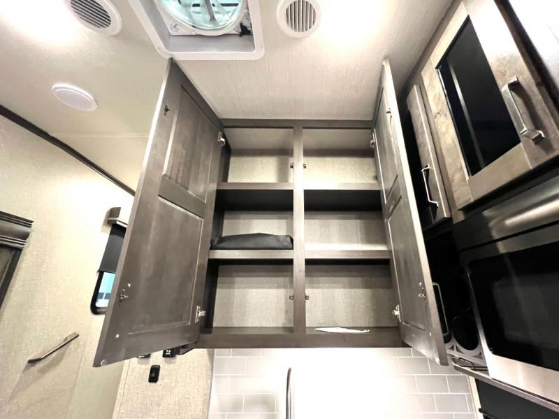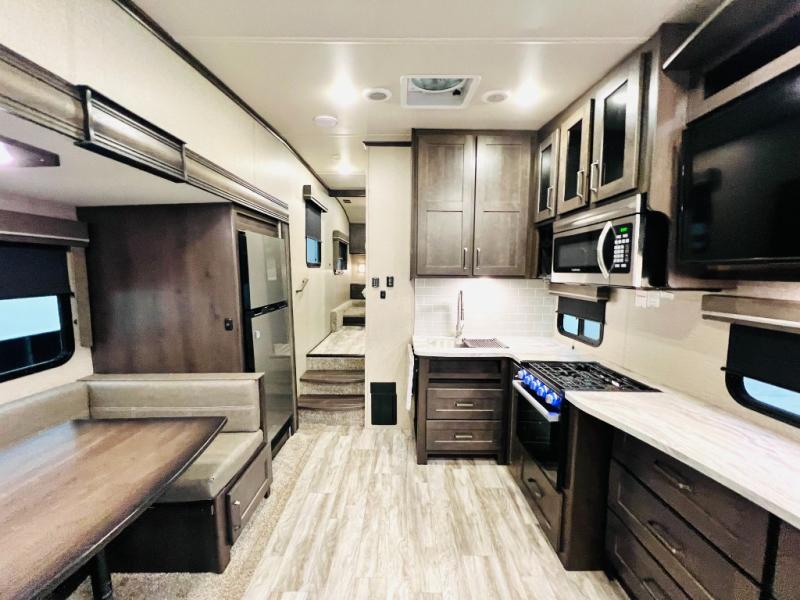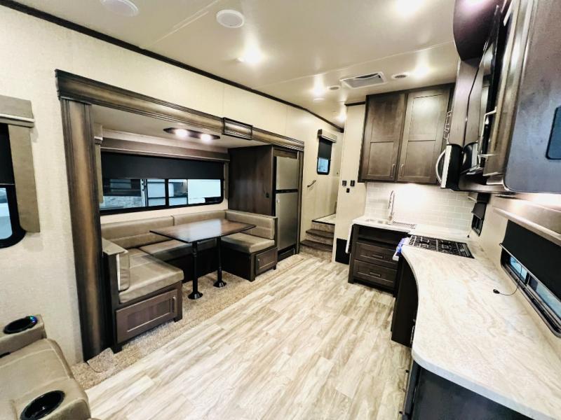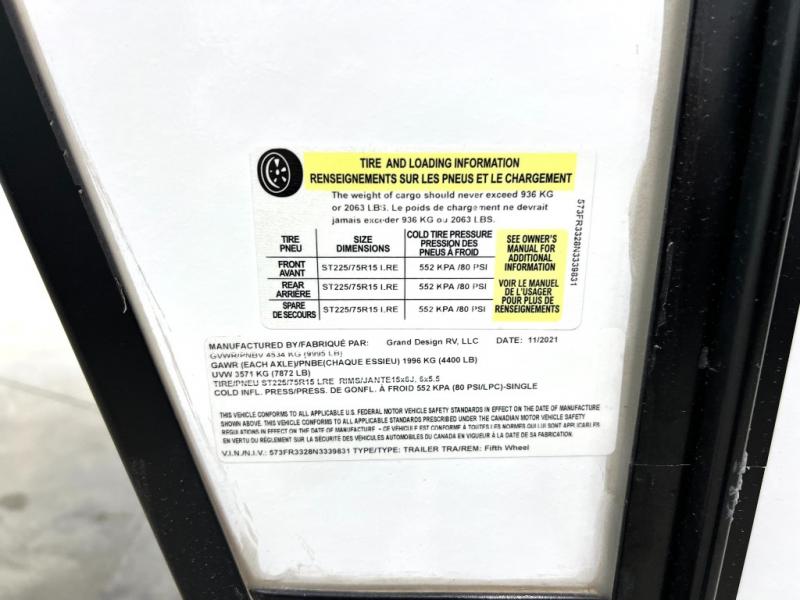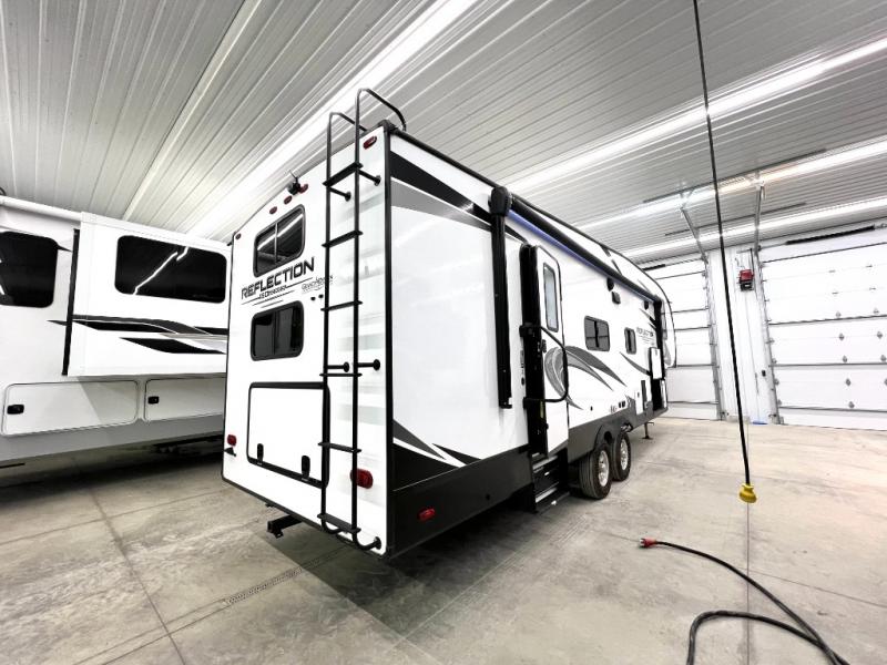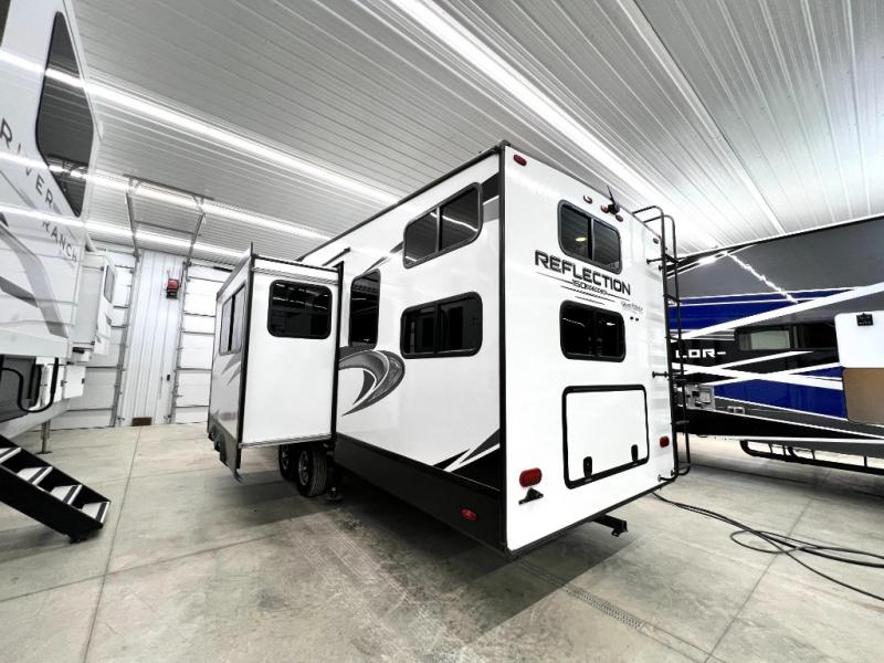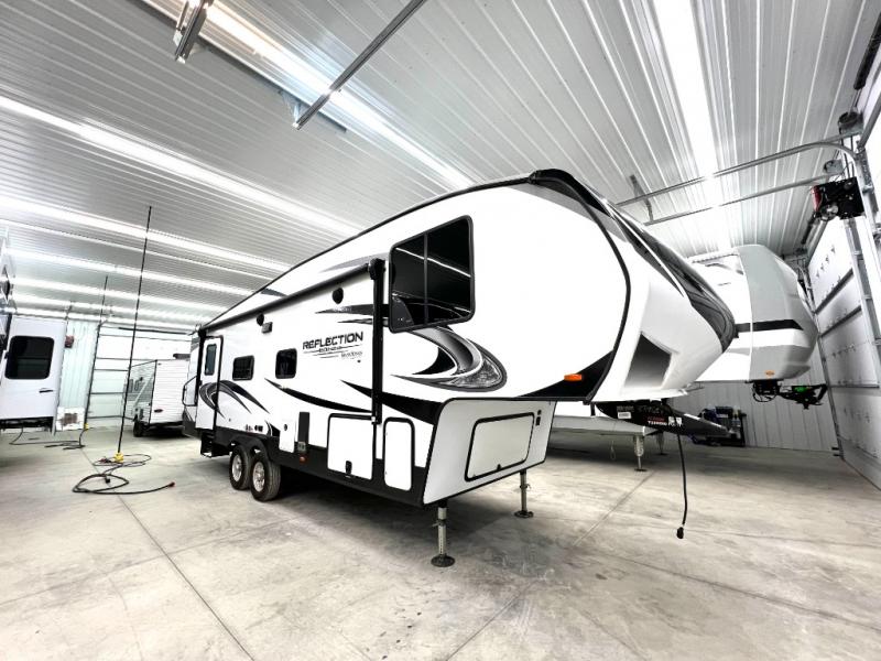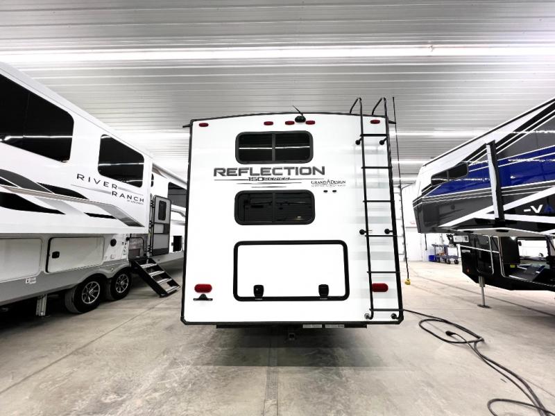 With any Reflection 150 Series fifth wheel by Grand Design, there is more available payload capacity and a broader range of half-ton trucks capable of towing this fifth wheel, and no slider hitch is needed thanks to the 90-degree turning radius which makes them short bed friendly and easier to tow. The mandatory Ultimate Power package provides a "One-Touch" automatic leveling system and a detachable power cord with LED light for easy setup, plus motion sensor pass-through lighting and entry lighting, and the Tire Linc TPMS will help you stay safe on the road. The interior offers residential luxury from the cabinetry and gunstock hardware plus the booth dinette to the residential-style window treatment. Make your refined decision today!
