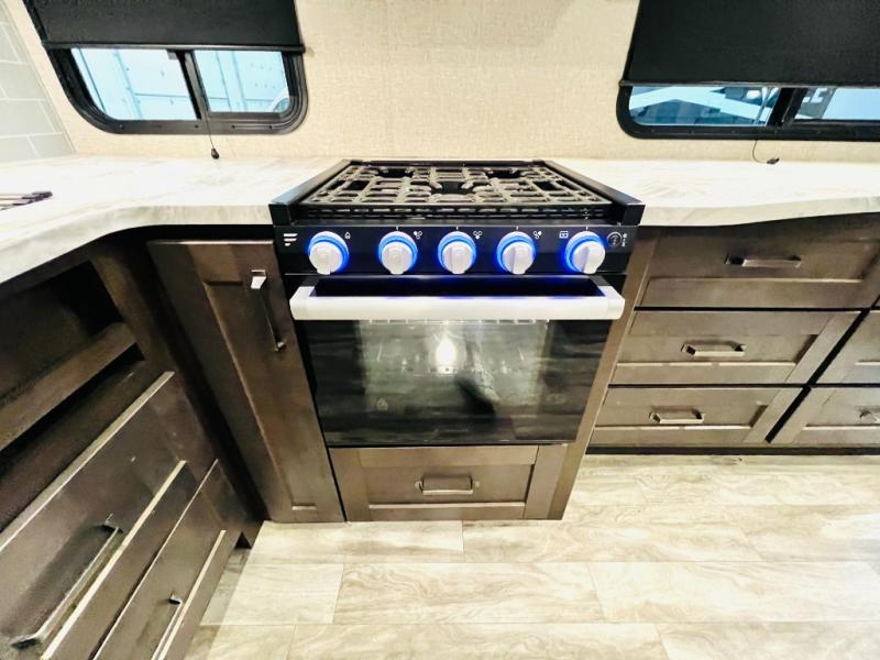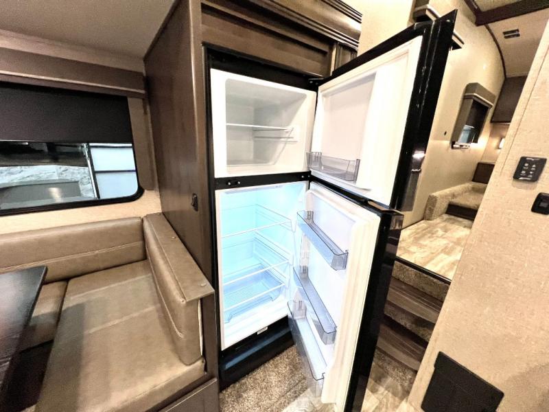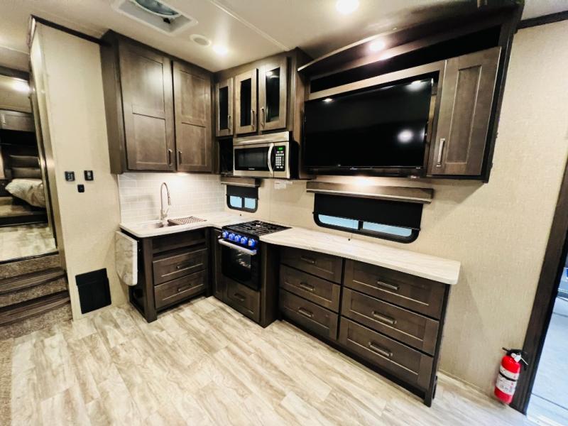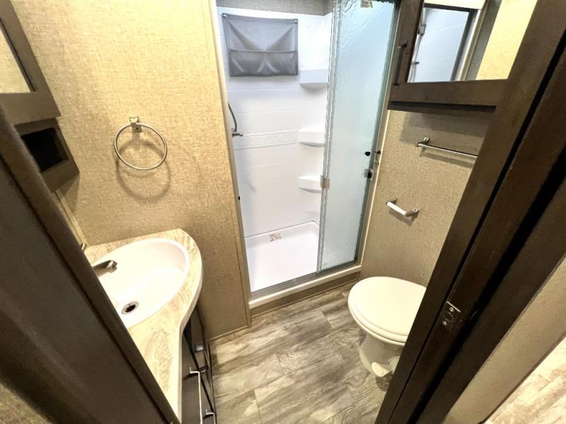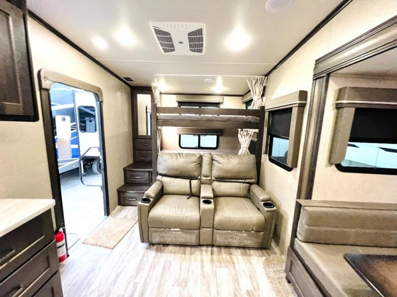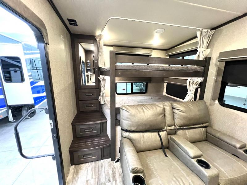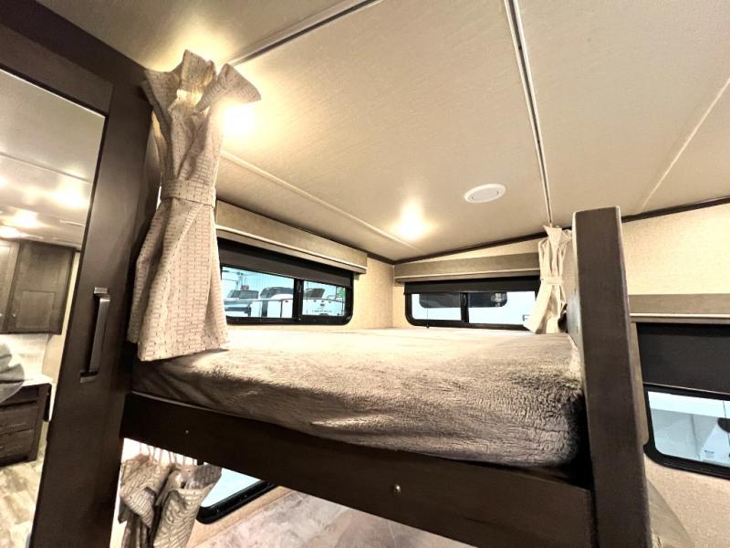 Get away from the hustle and bustle of the city every chance you get with this fifth wheel in tow! Once at your campsite, you can easily set up the single slide and the 20' electric awning and head out for a hike or relax on the U-shaped dinette and theatre seating while watching the 40" LED HDTV. The cook will love the L-shaped kitchen giving them their own space without interruptions and they will have full amenities to keep everyone fed. Everyone can take turns getting cleaned up in the walk-in shower in the full bathroom before calling it a night. The front bedroom offers a walk-around queen bed and plenty of storage, while the rear of this fifth wheel gives the kids or your friends 46" bunk beds to sleep on with their own storage near the step storage. And the U-shaped dinette offers extra sleeping space.