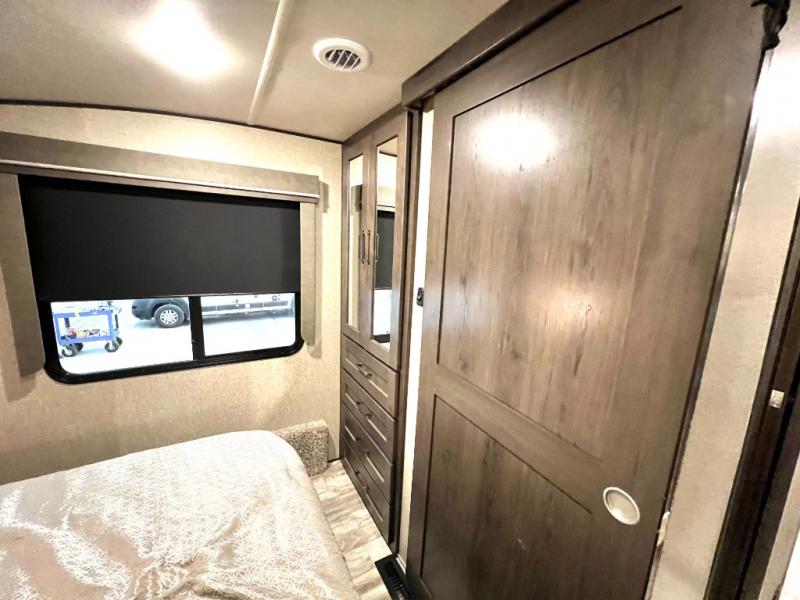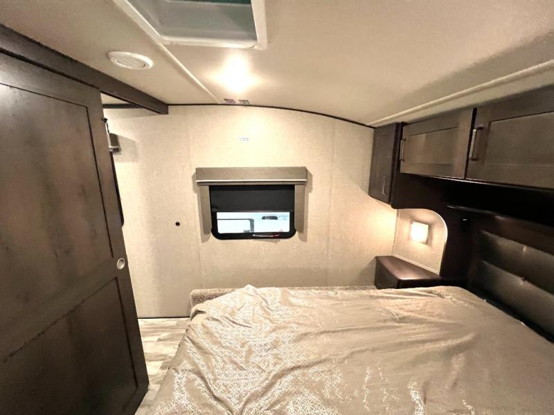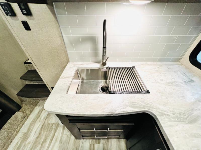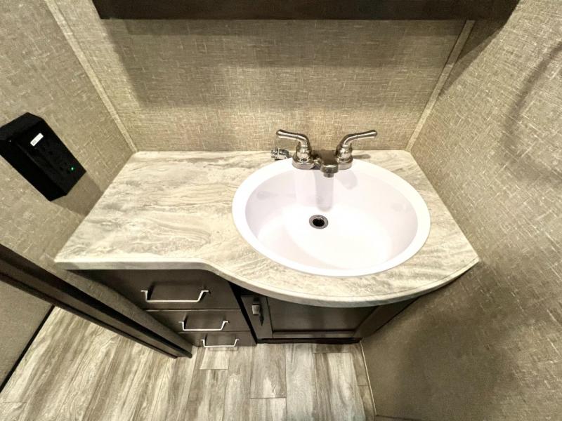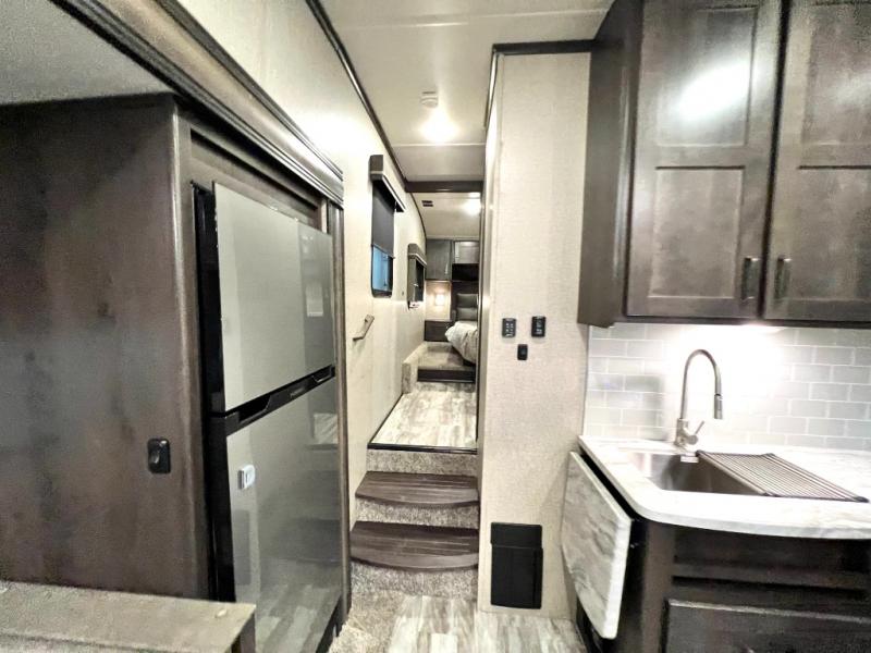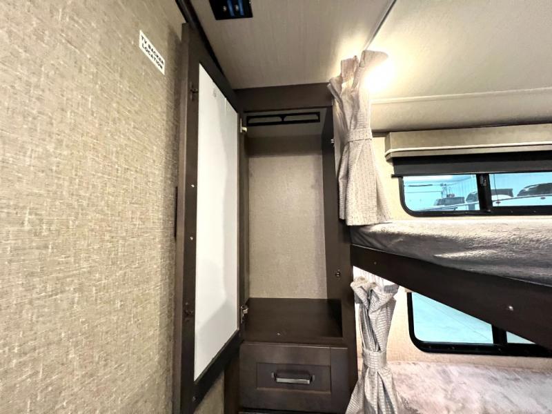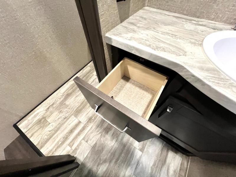 Get away from the hustle and bustle of the city every chance you get with this fifth wheel in tow! Once at your campsite, you can easily set up the single slide and the 20' electric awning and head out for a hike or relax on the U-shaped dinette and theatre seating while watching the 40" LED HDTV. The cook will love the L-shaped kitchen giving them their own space without interruptions and they will have full amenities to keep everyone fed. Everyone can take turns getting cleaned up in the walk-in shower in the full bathroom before calling it a night. The front bedroom offers a walk-around queen bed and plenty of storage, while the rear of this fifth wheel gives the kids or your friends 46" bunk beds to sleep on with their own storage near the step storage. And the U-shaped dinette offers extra sleeping space.