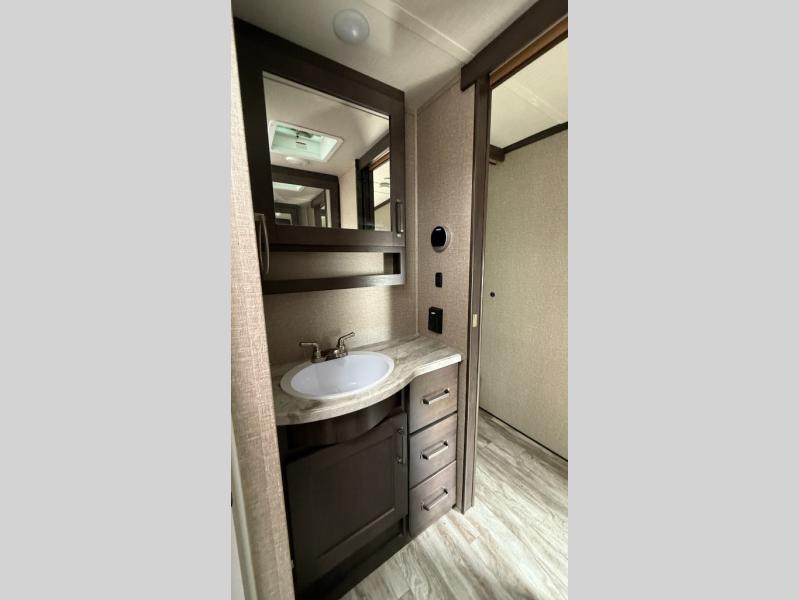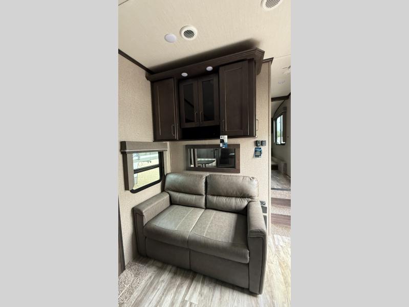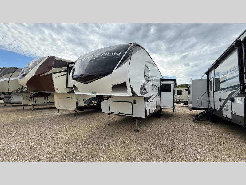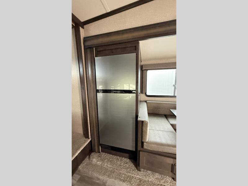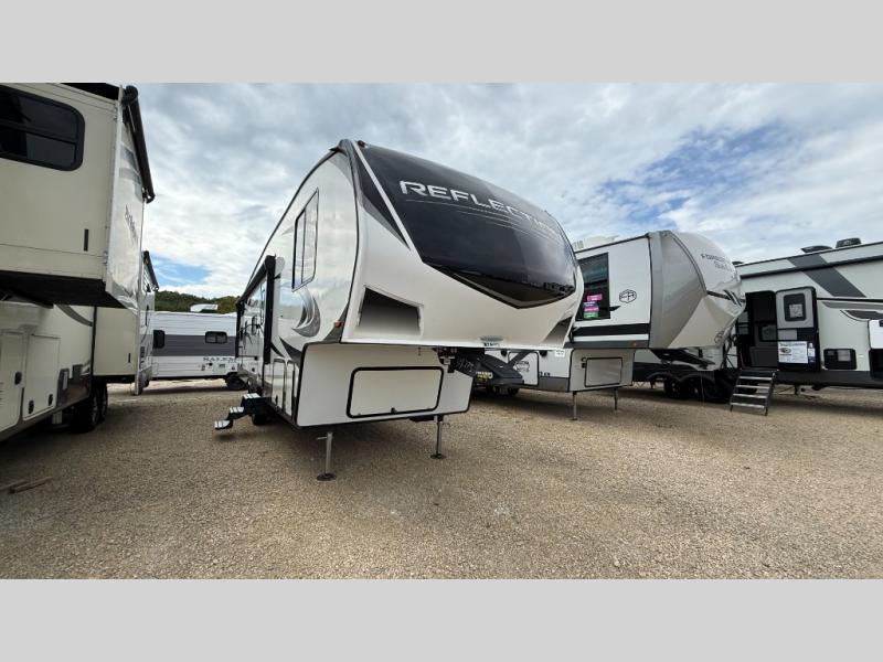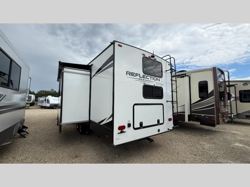 With any Reflection 150 Series fifth wheel by Grand Design, there is more available payload capacity and a broader range of half-ton trucks capable of towing this fifth wheel, and no slider hitch is needed thanks to the 90-degree turning radius which makes them short bed friendly and easier to tow. The mandatory Ultimate Power package provides a "One-Touch" automatic leveling system and a detachable power cord with LED light for easy setup, plus motion sensor pass-through lighting and entry lighting, and the Tire Linc TPMS will help you stay safe on the road. The interior offers residential luxury from the cabinetry and gunstock hardware plus the booth dinette to the residential-style window treatment. Make your refined decision today!
