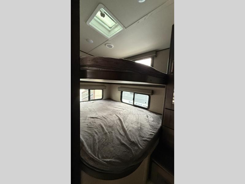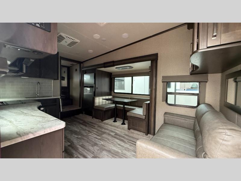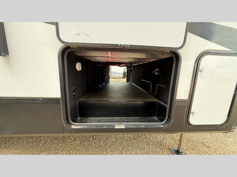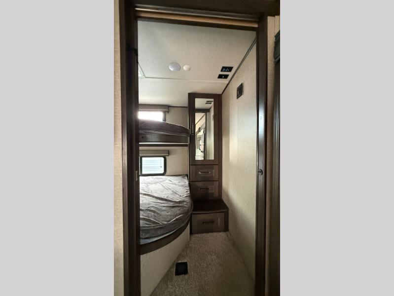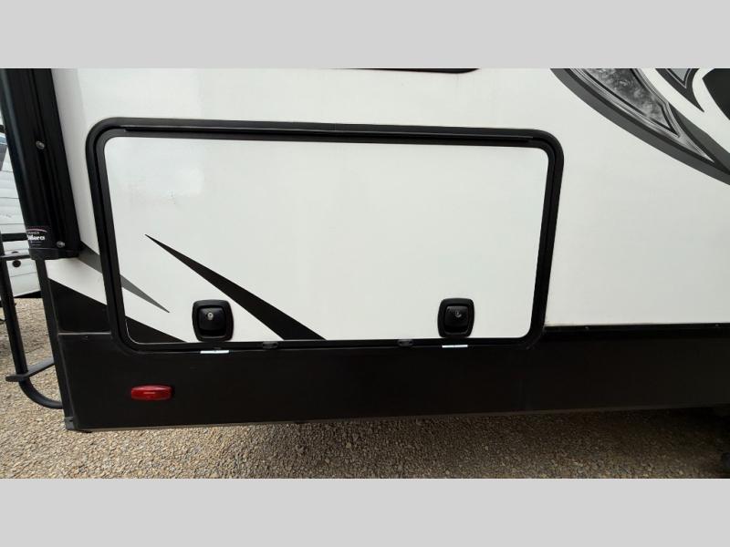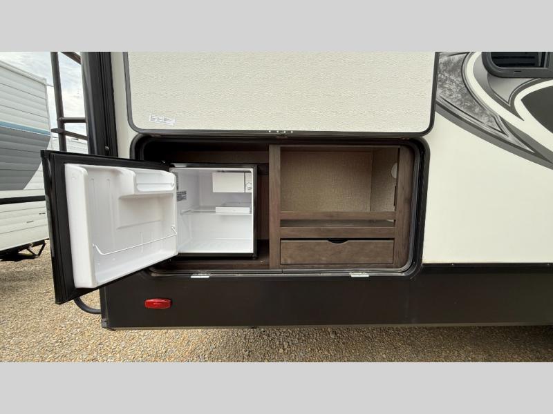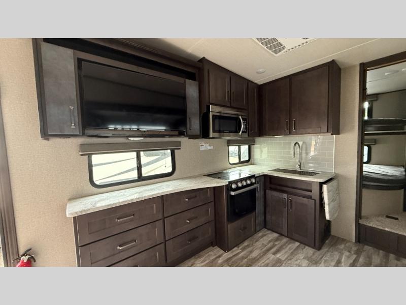 When you enjoy the outdoors as much as the indoors, this fifth wheel offers convenience and comfort throughout the inside and outside! From some of the exterior features such as the outside kitchen to make meals while visiting with other RVers, the spray port to wash off dirty shoes, the rear storage, the All-In-One docking station, the 20' electric awning and aluminum entry steps for safe entry to the interior features with a walk-around queen bed in the front private bedroom and the double-size bunks in the rear with step storage to the 40" LED HDTV in the main living and kitchen area. The tri-fold sofa and U-shaped dinette offer extra sleeping space as well, and the cook will love the L-shaped kitchen area inside with full amenities.