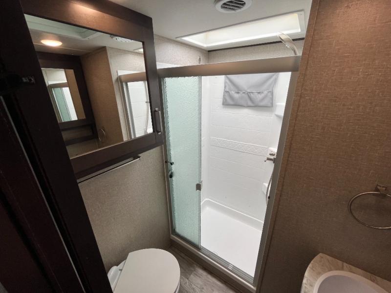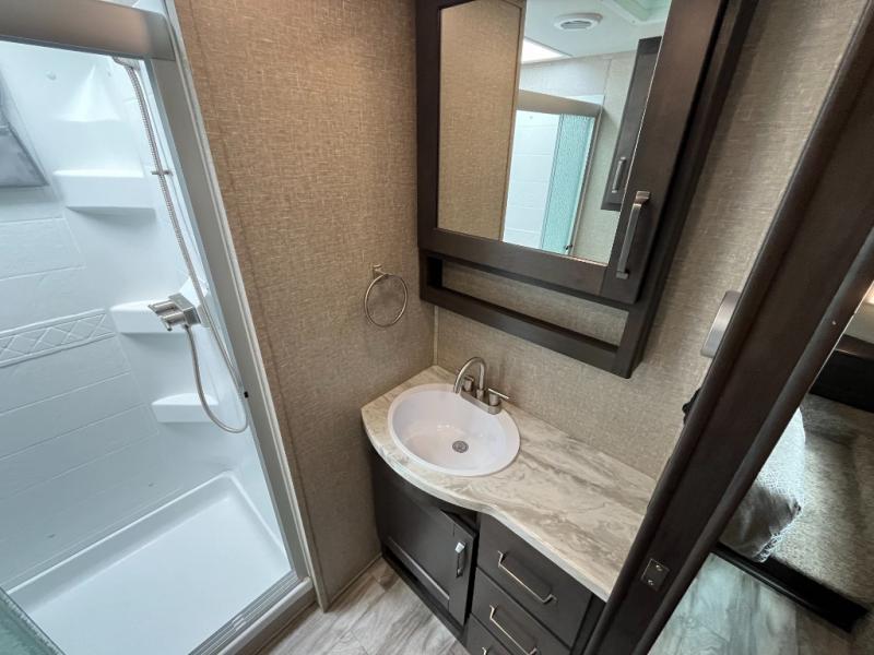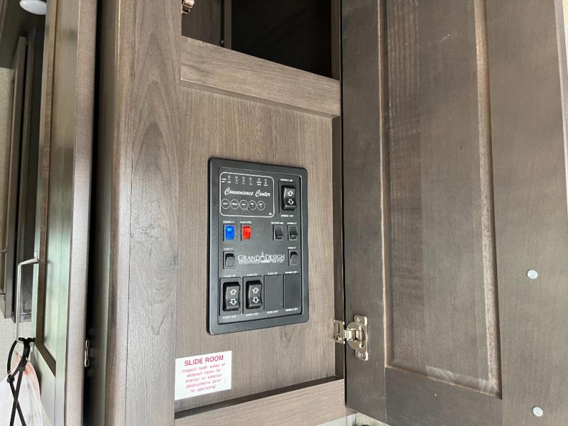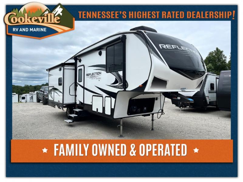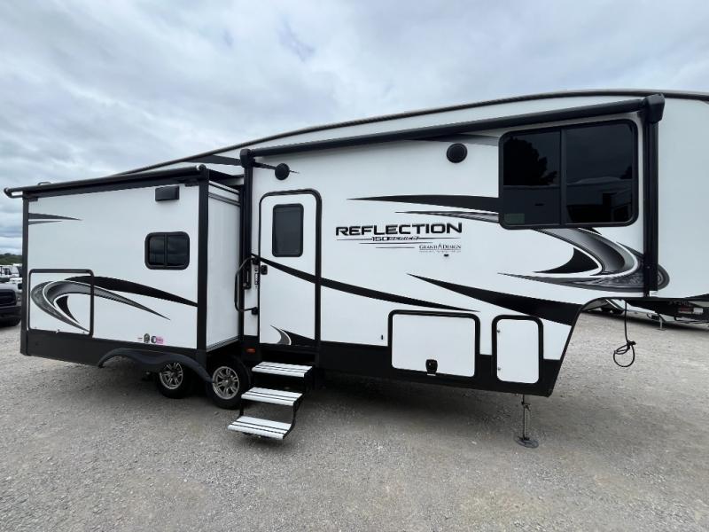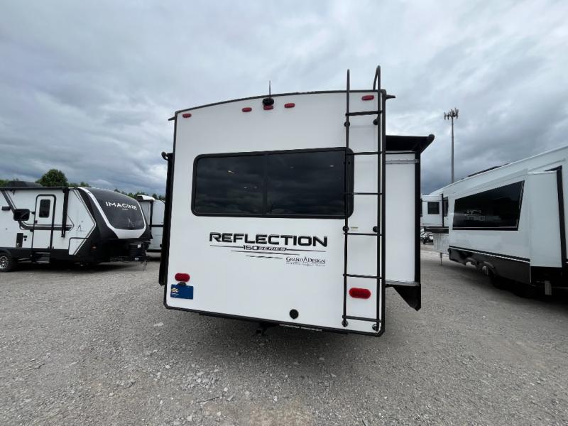 With any Reflection 150 Series fifth wheel by Grand Design, there is more available payload capacity and a broader range of half-ton trucks capable of towing this fifth wheel, and no slider hitch is needed thanks to the 90-degree turning radius which makes them short bed friendly and easier to tow. The mandatory Ultimate Power package provides a "One-Touch" automatic leveling system and a detachable power cord with LED light for easy setup, plus motion sensor pass-through lighting and entry lighting, and the Tire Linc TPMS will help you stay safe on the road. The interior offers residential luxury from the cabinetry and gunstock hardware plus the booth dinette to the residential-style window treatment. Make your refined decision today!