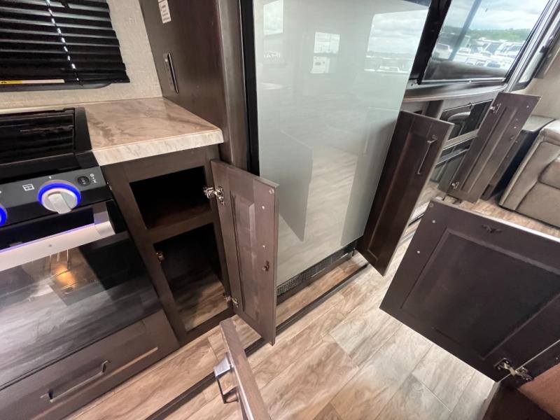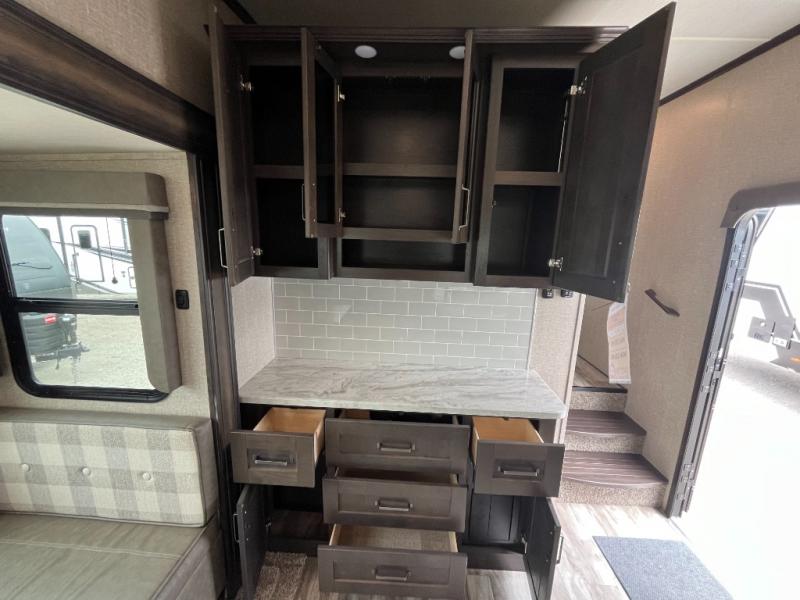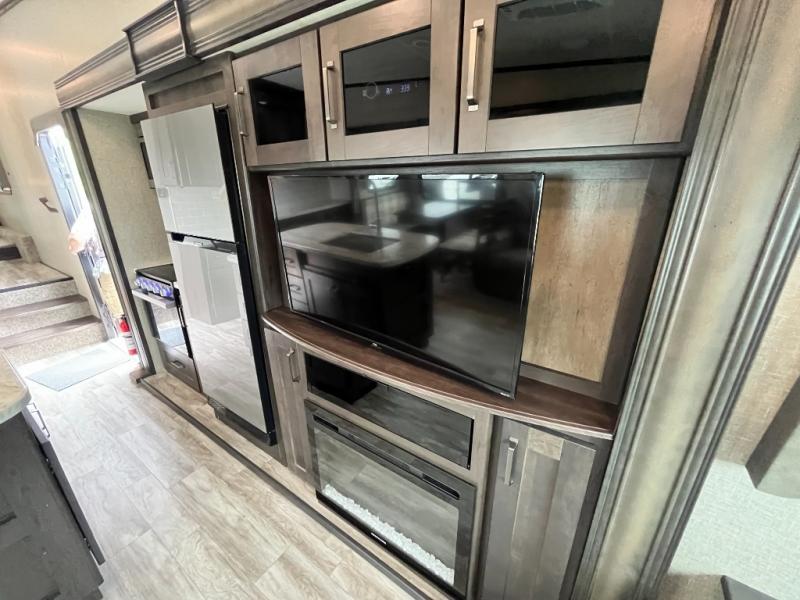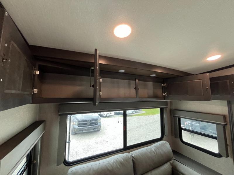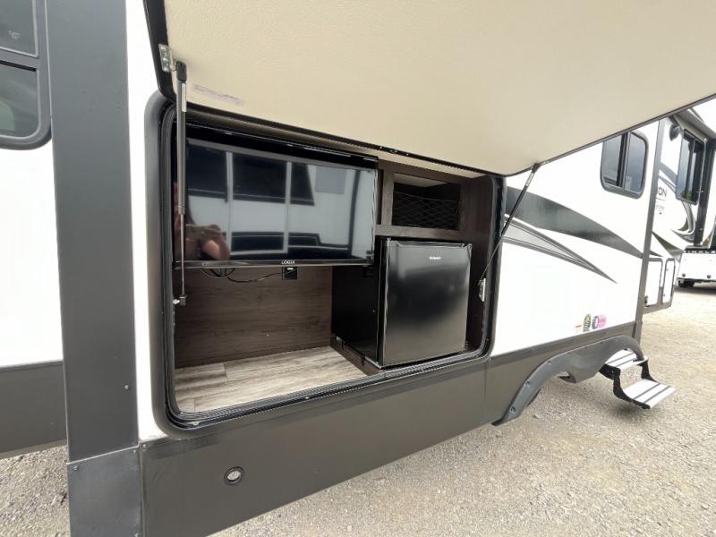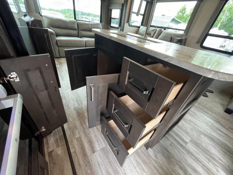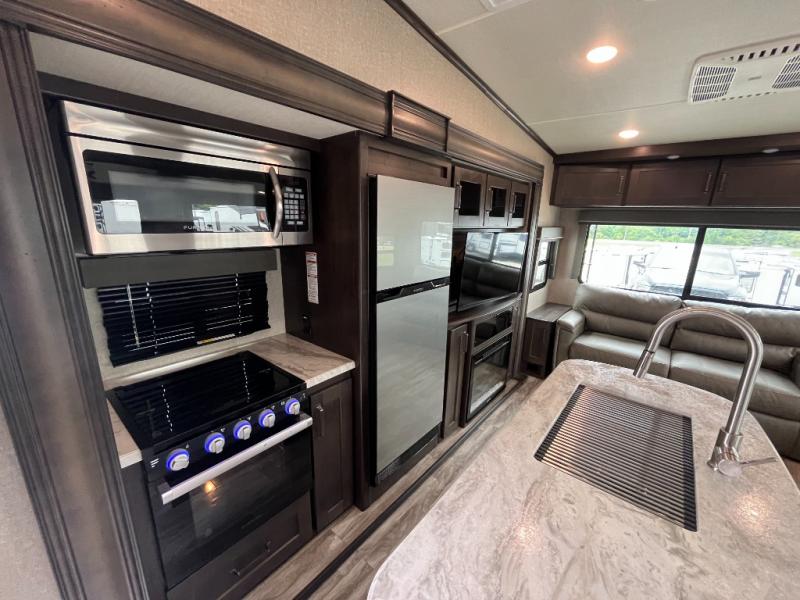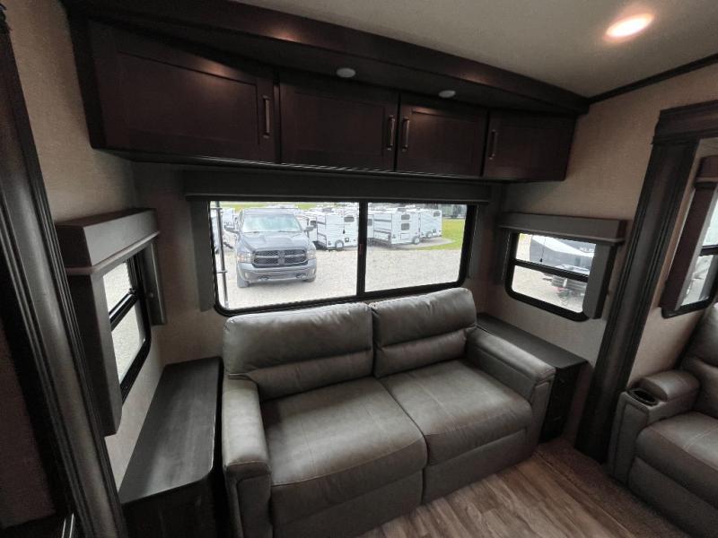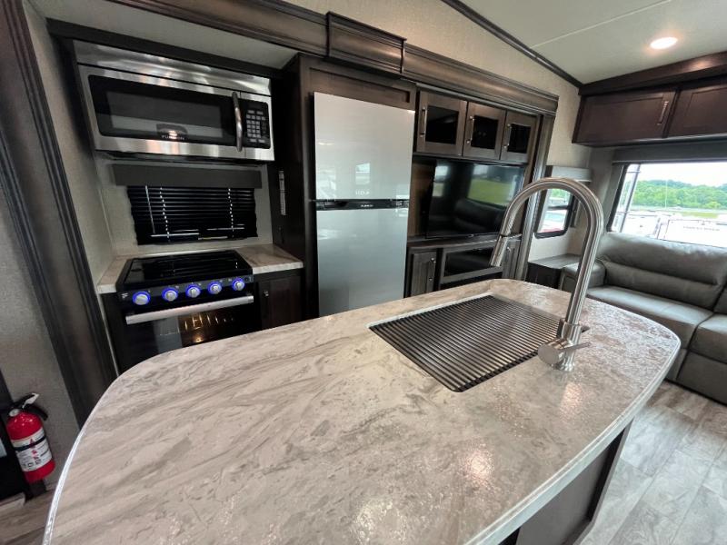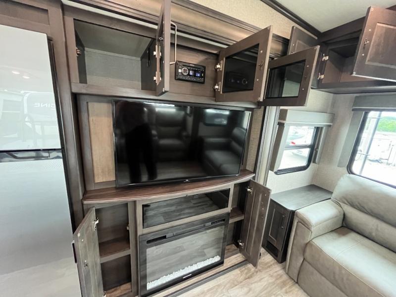 Get ready to enjoy the inside just as much as the outdoors when you have this fifth wheel at the campgrounds. The interior offers a spacious main living and kitchen area thanks to the opposing slides which make walking around the kitchen island easy. The hutch offers more counter and storage space to prepare and serve meals, plus bring extra dishes and such, and the 10 cu. ft. refrigerator will hold your leftovers plus some. Relax on the tri-fold sofa that offers extra sleeping space for guests, and you will love the theatre seats while watching the 40" LED HDTV with fireplace below. There is a full bathroom with a walk-in shower, and the front bedroom allows you to sleep like a queen!