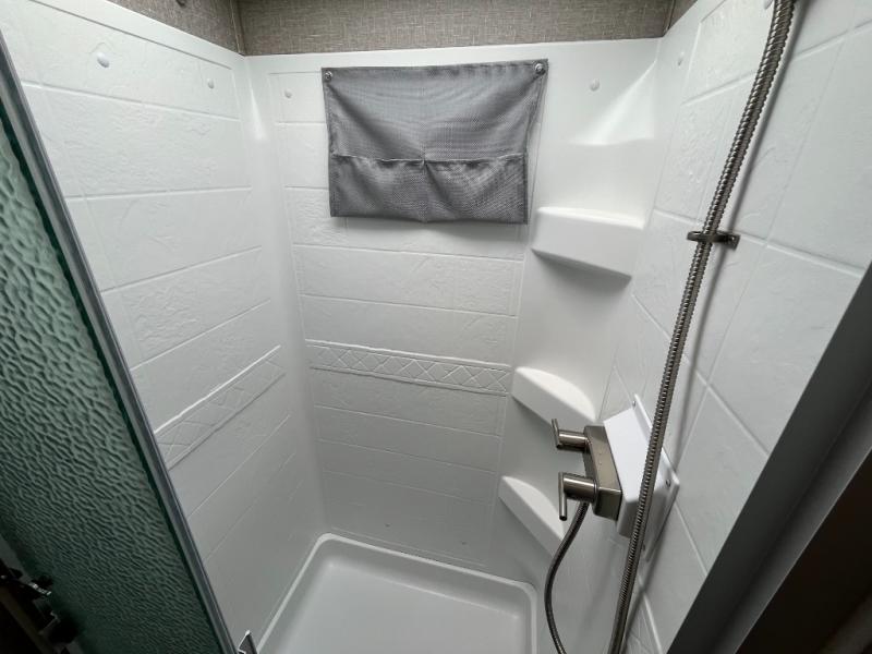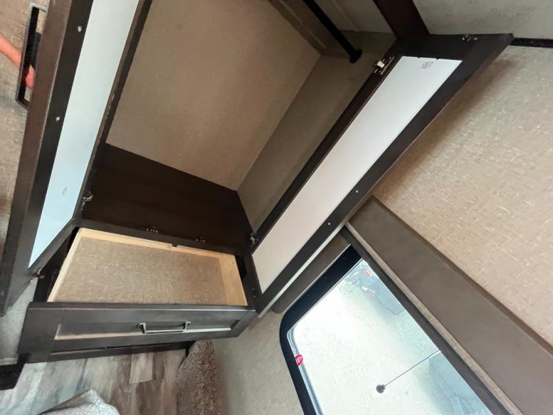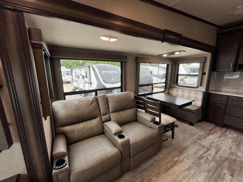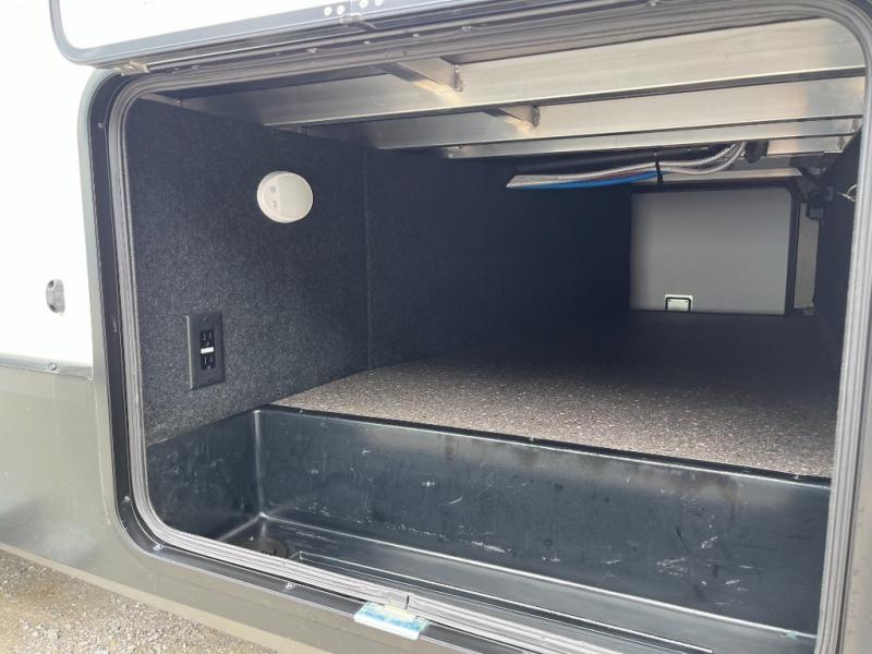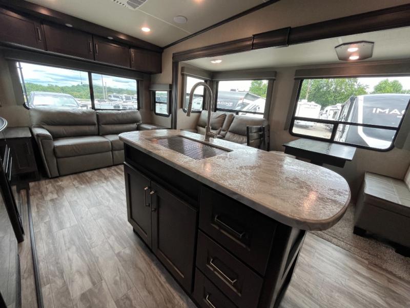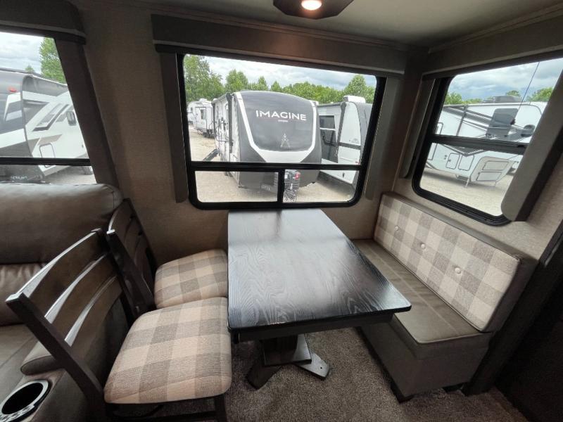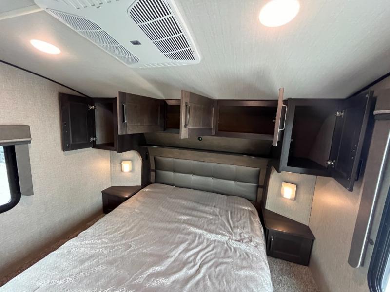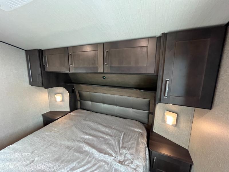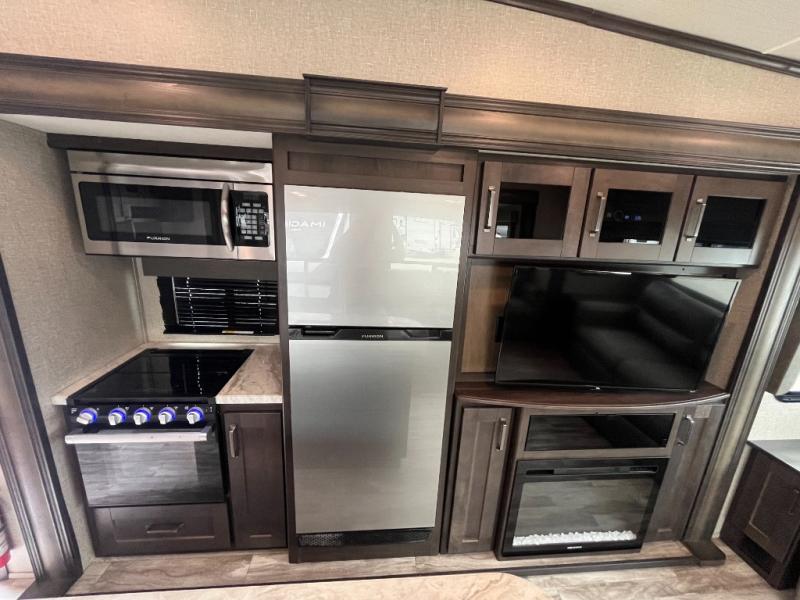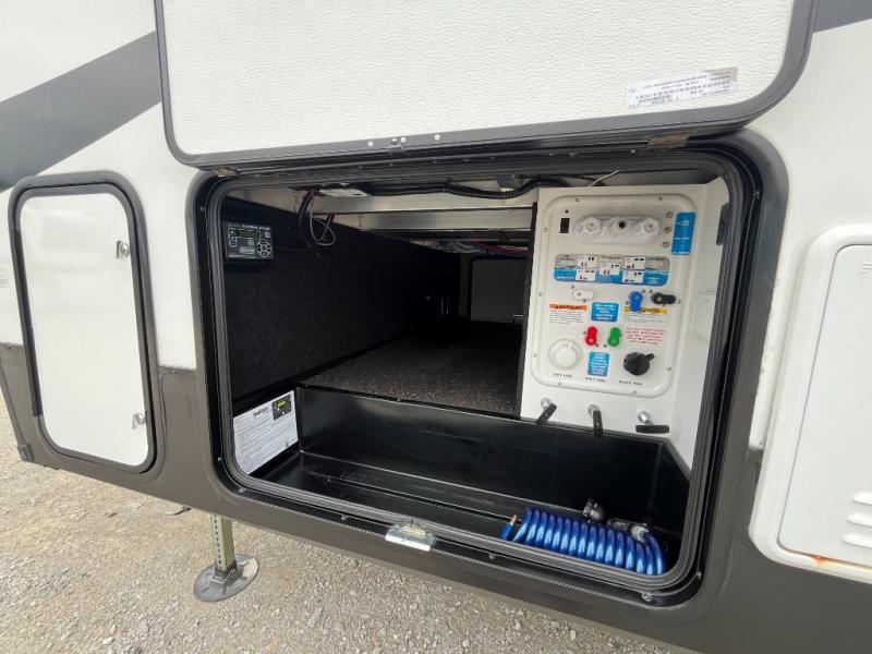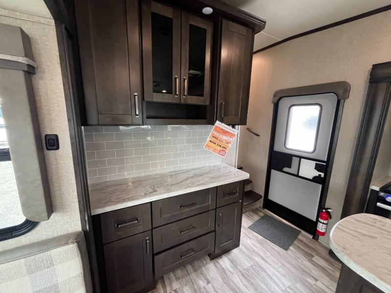 Get ready to enjoy the inside just as much as the outdoors when you have this fifth wheel at the campgrounds. The interior offers a spacious main living and kitchen area thanks to the opposing slides which make walking around the kitchen island easy. The hutch offers more counter and storage space to prepare and serve meals, plus bring extra dishes and such, and the 10 cu. ft. refrigerator will hold your leftovers plus some. Relax on the tri-fold sofa that offers extra sleeping space for guests, and you will love the theatre seats while watching the 40" LED HDTV with fireplace below. There is a full bathroom with a walk-in shower, and the front bedroom allows you to sleep like a queen!