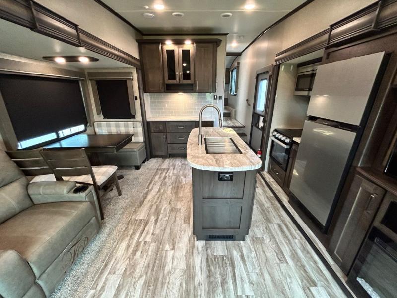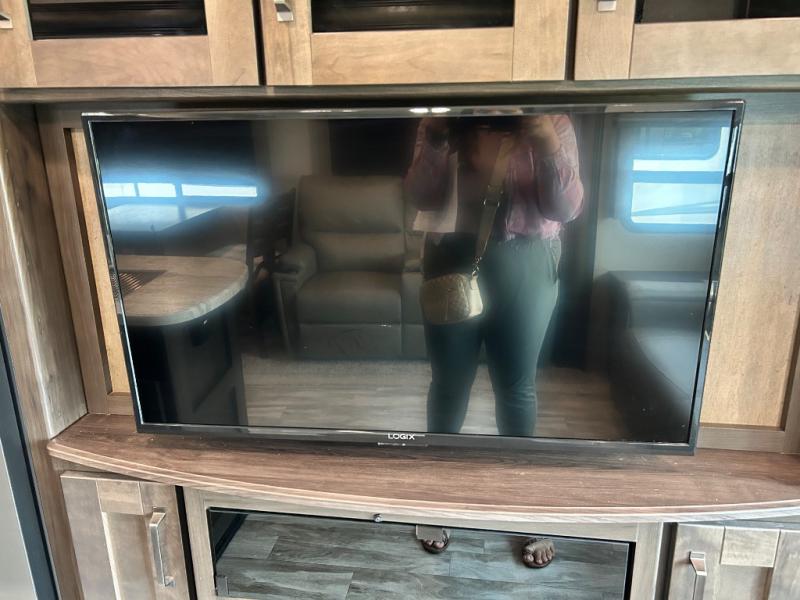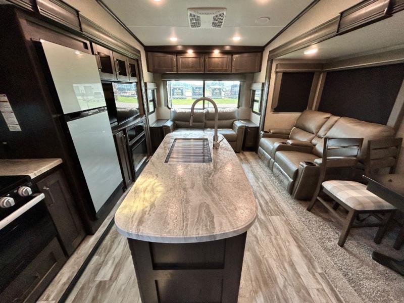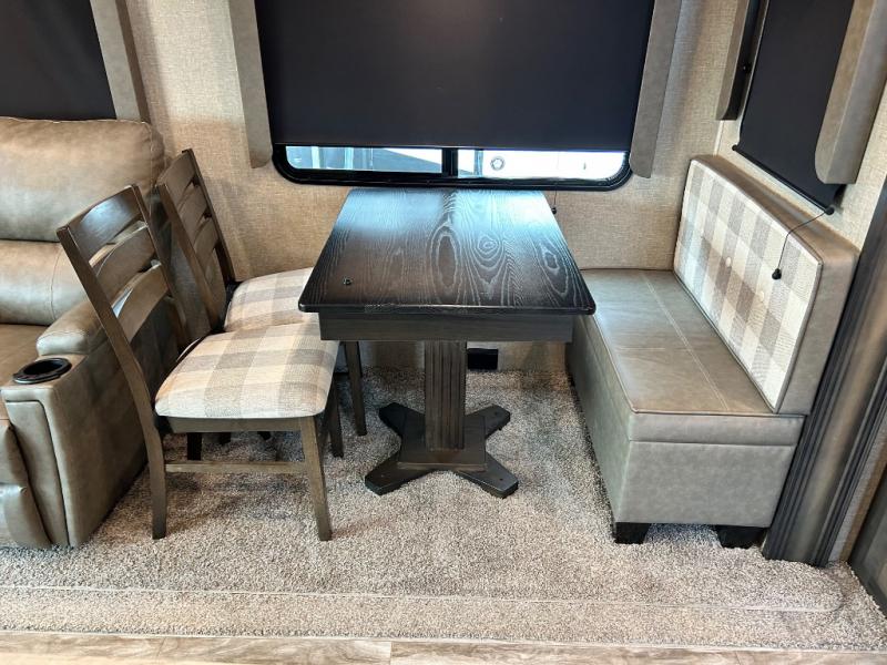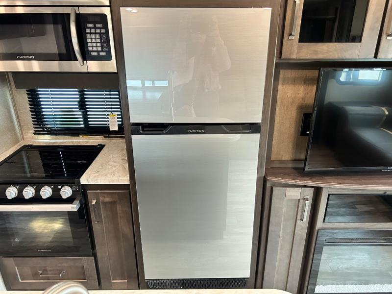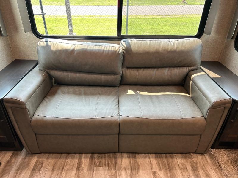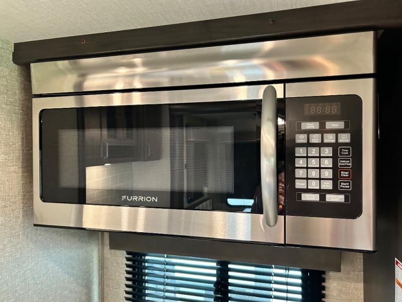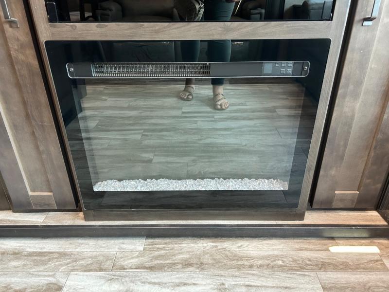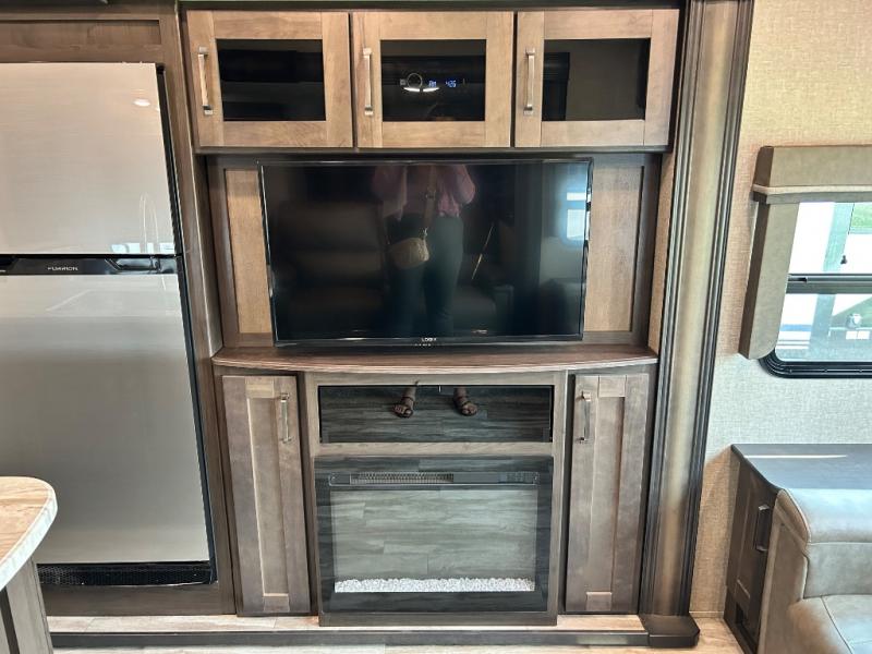 Get ready to enjoy the inside just as much as the outdoors when you have this fifth wheel at the campgrounds. The interior offers a spacious main living and kitchen area thanks to the opposing slides which make walking around the kitchen island easy. The hutch offers more counter and storage space to prepare and serve meals, plus bring extra dishes and such, and the 10 cu. ft. refrigerator will hold your leftovers plus some. Relax on the tri-fold sofa that offers extra sleeping space for guests, and you will love the theatre seats while watching the 40" LED HDTV with fireplace below. There is a full bathroom with a walk-in shower, and the front bedroom allows you to sleep like a queen!
