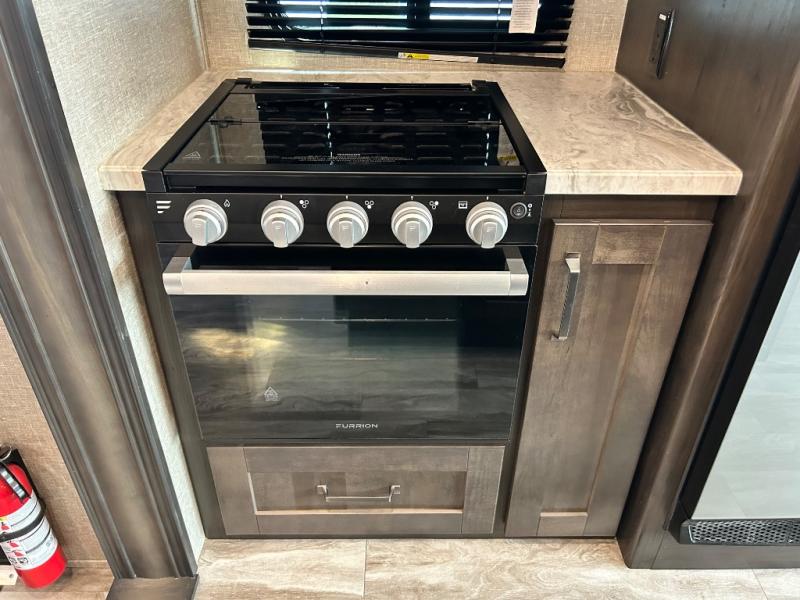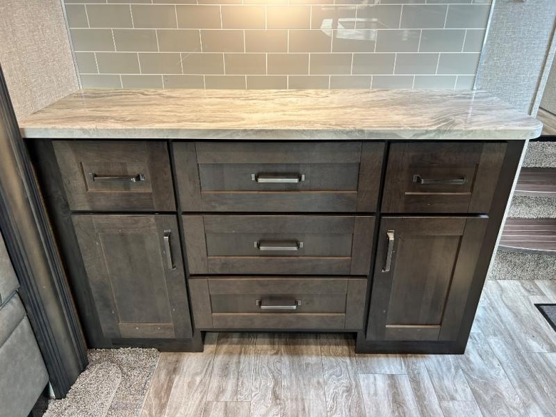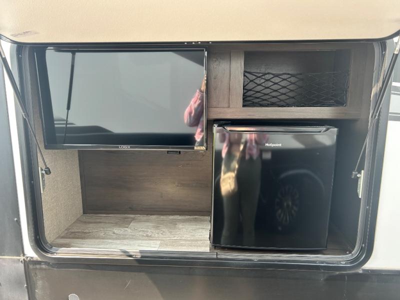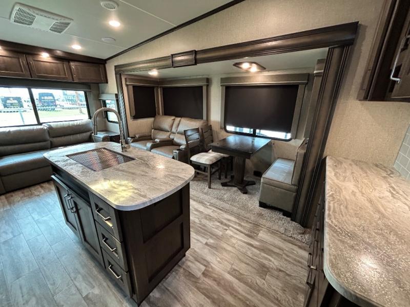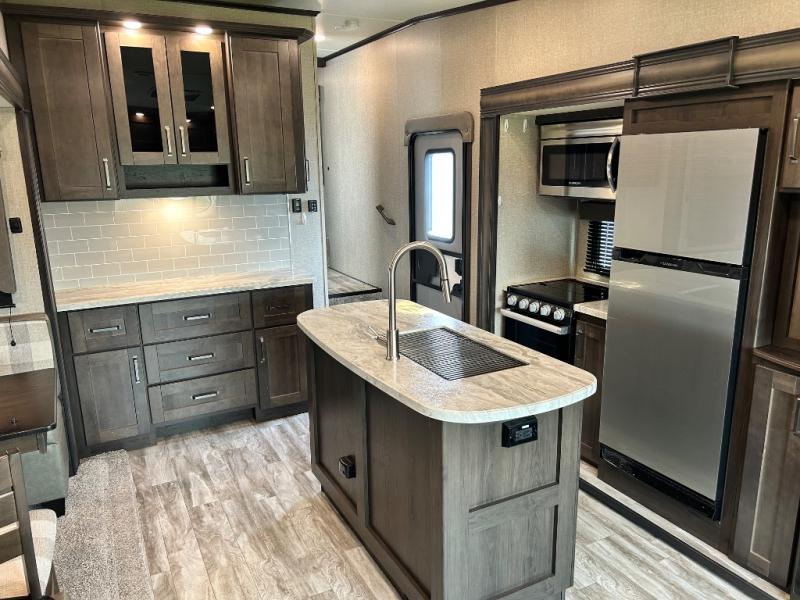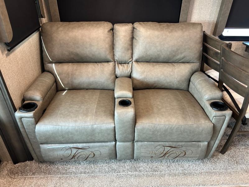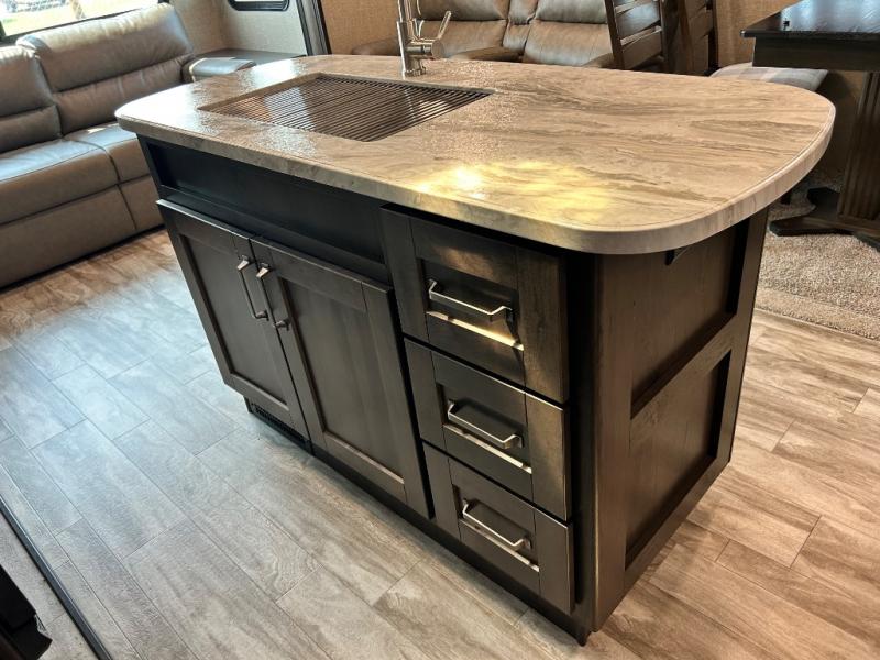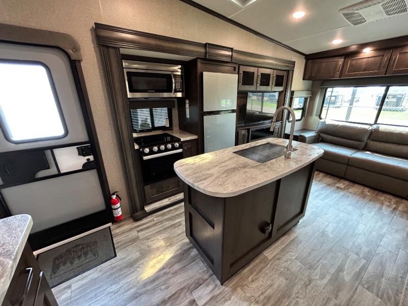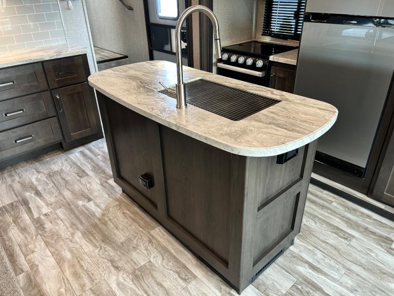 Get ready to enjoy the inside just as much as the outdoors when you have this fifth wheel at the campgrounds. The interior offers a spacious main living and kitchen area thanks to the opposing slides which make walking around the kitchen island easy. The hutch offers more counter and storage space to prepare and serve meals, plus bring extra dishes and such, and the 10 cu. ft. refrigerator will hold your leftovers plus some. Relax on the tri-fold sofa that offers extra sleeping space for guests, and you will love the theatre seats while watching the 40" LED HDTV with fireplace below. There is a full bathroom with a walk-in shower, and the front bedroom allows you to sleep like a queen!