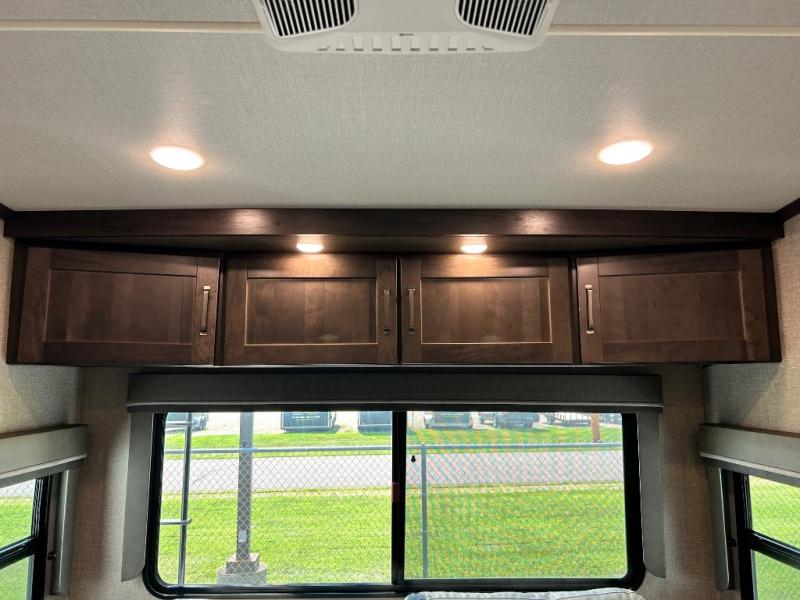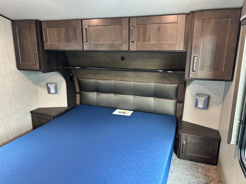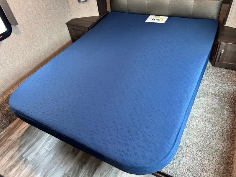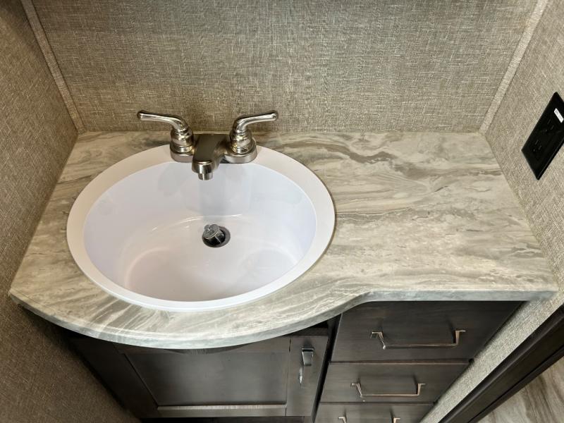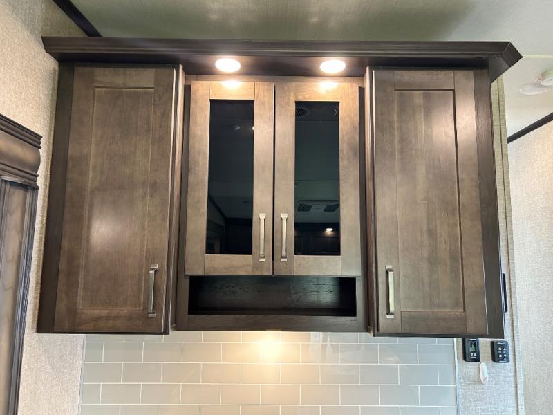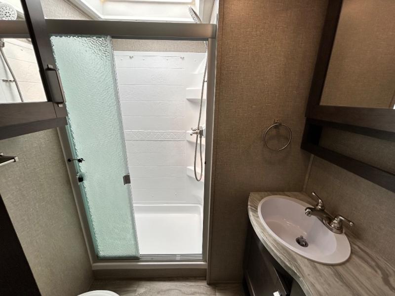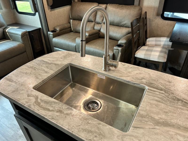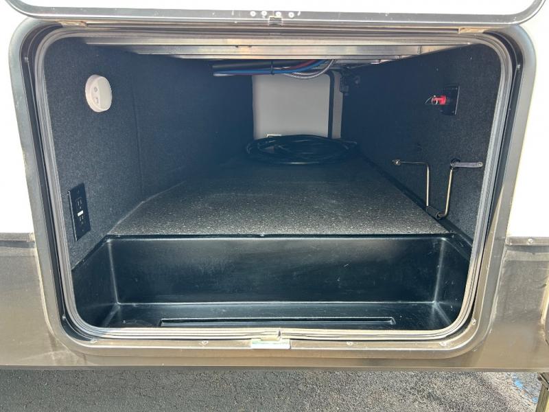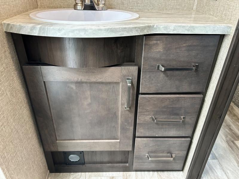 Get ready to enjoy the inside just as much as the outdoors when you have this fifth wheel at the campgrounds. The interior offers a spacious main living and kitchen area thanks to the opposing slides which make walking around the kitchen island easy. The hutch offers more counter and storage space to prepare and serve meals, plus bring extra dishes and such, and the 10 cu. ft. refrigerator will hold your leftovers plus some. Relax on the tri-fold sofa that offers extra sleeping space for guests, and you will love the theatre seats while watching the 40" LED HDTV with fireplace below. There is a full bathroom with a walk-in shower, and the front bedroom allows you to sleep like a queen!