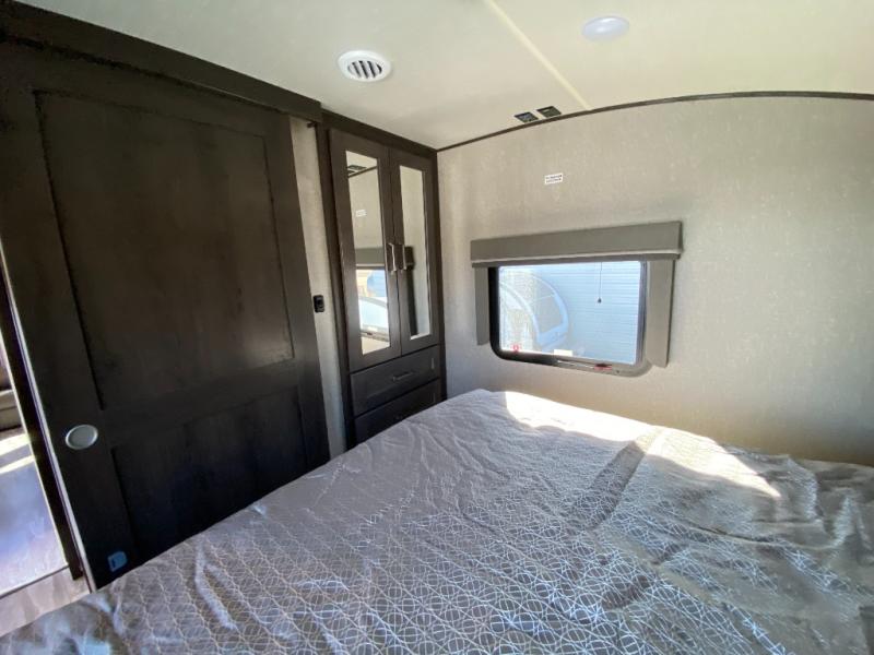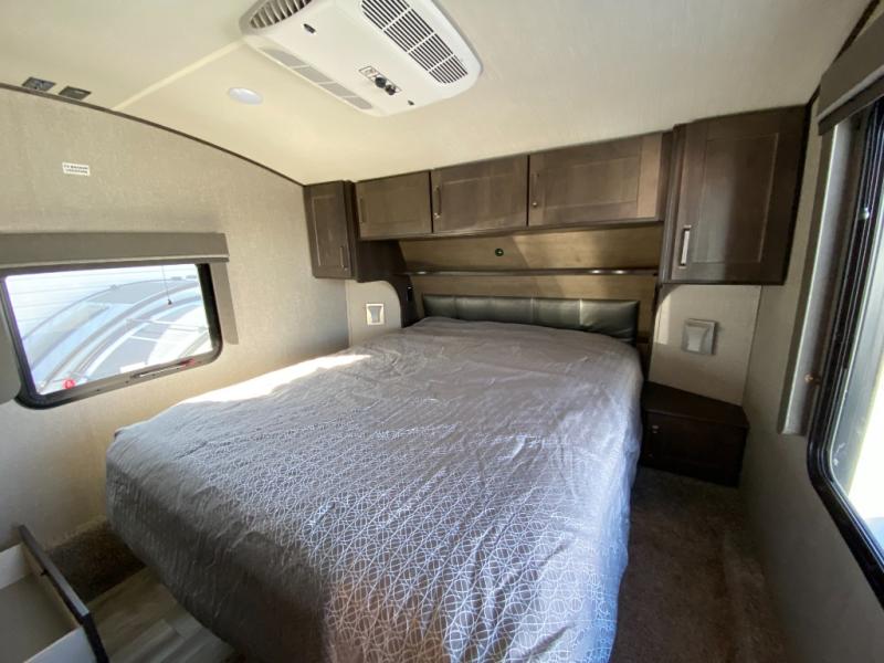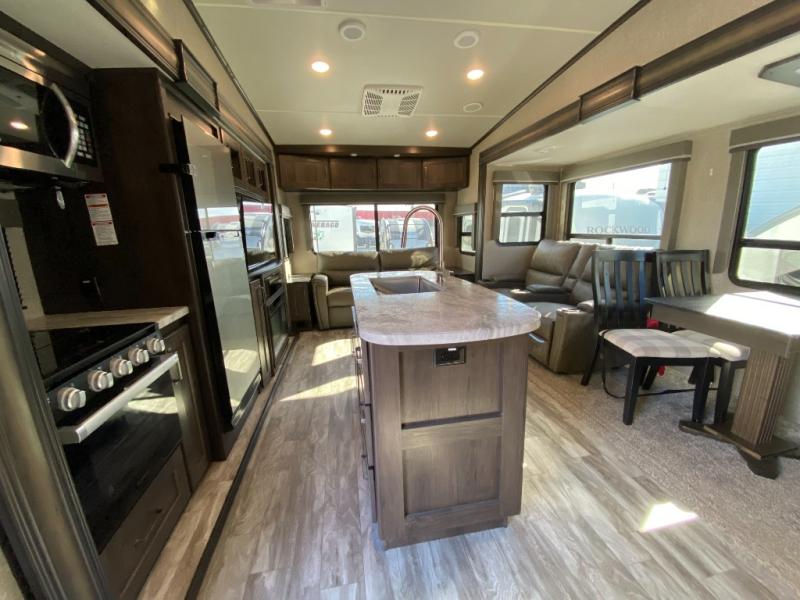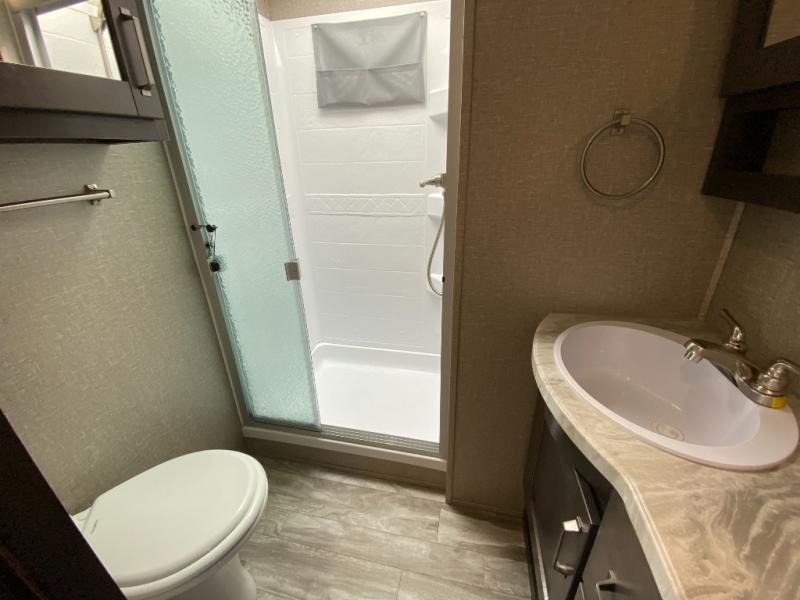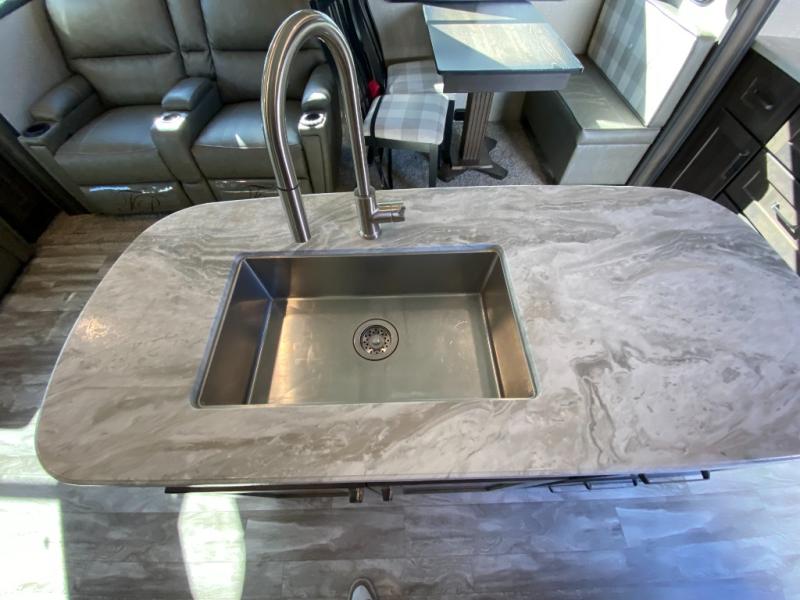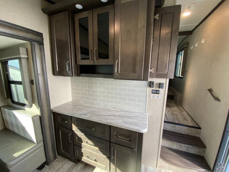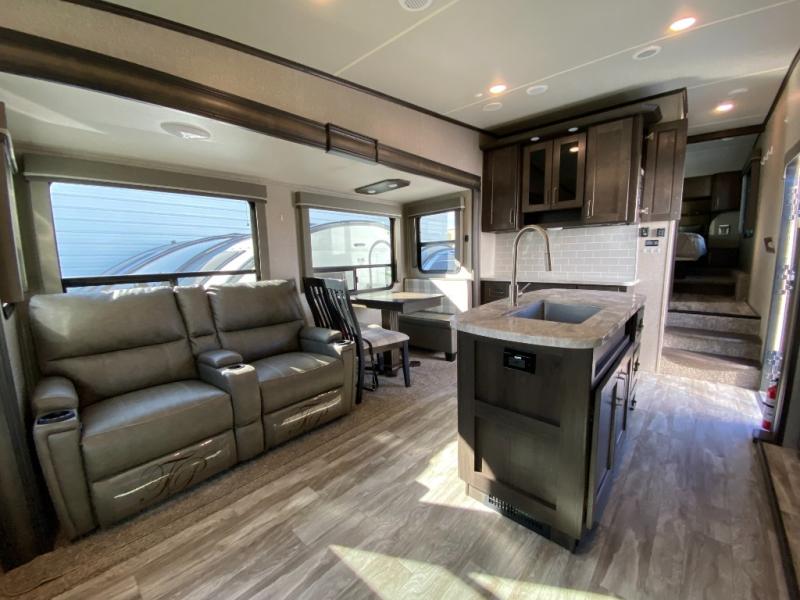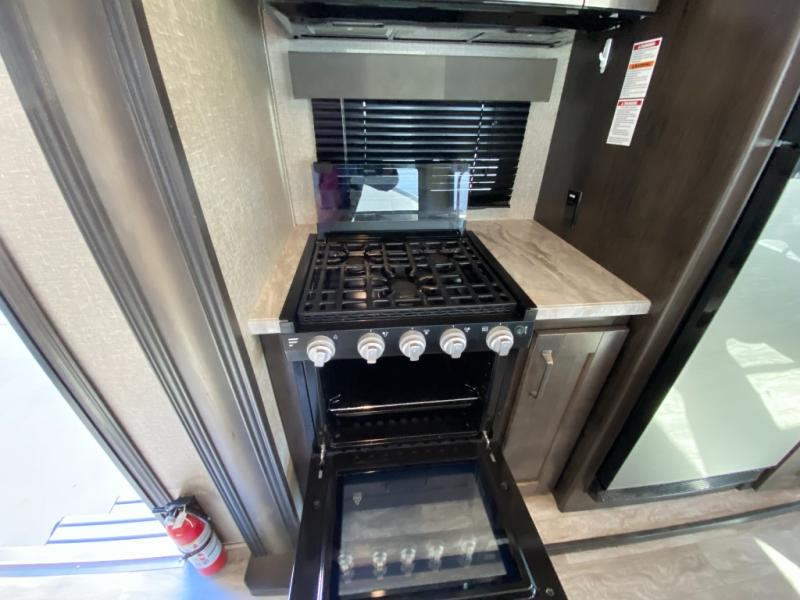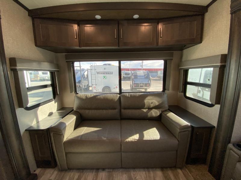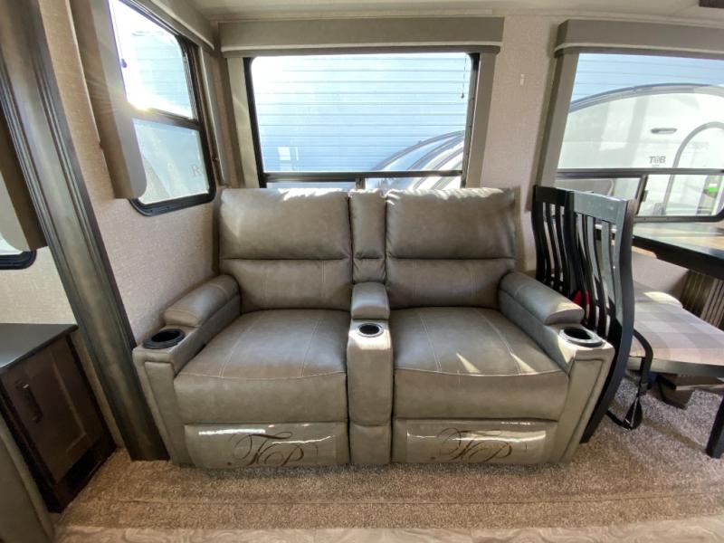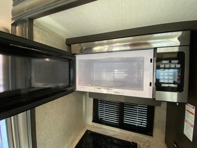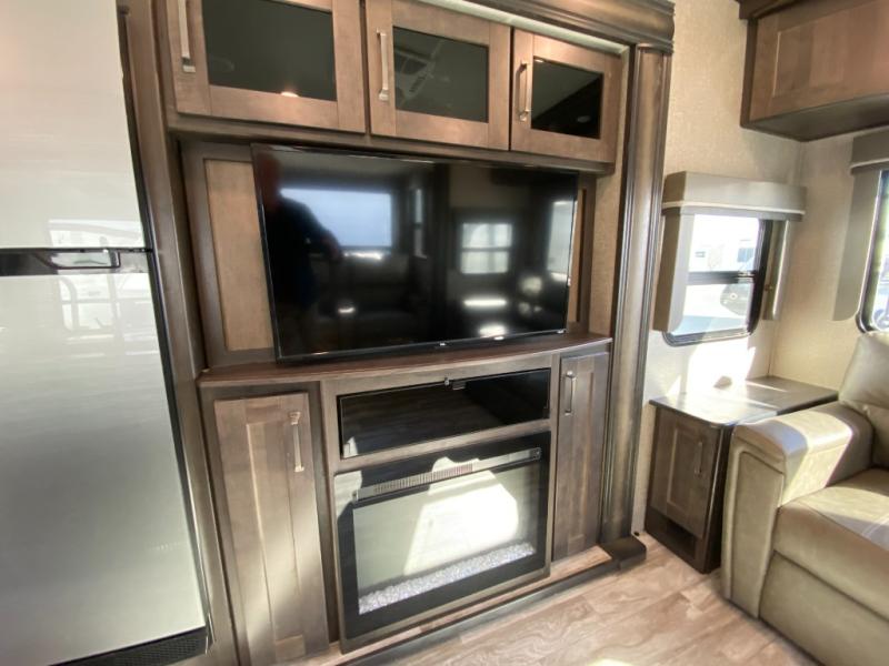 Get ready to enjoy the inside just as much as the outdoors when you have this fifth wheel at the campgrounds. The interior offers a spacious main living and kitchen area thanks to the opposing slides which make walking around the kitchen island easy. The hutch offers more counter and storage space to prepare and serve meals, plus bring extra dishes and such, and the 10 cu. ft. refrigerator will hold your leftovers plus some. Relax on the tri-fold sofa that offers extra sleeping space for guests, and you will love the theatre seats while watching the 40" LED HDTV with fireplace below. There is a full bathroom with a walk-in shower, and the front bedroom allows you to sleep like a queen!