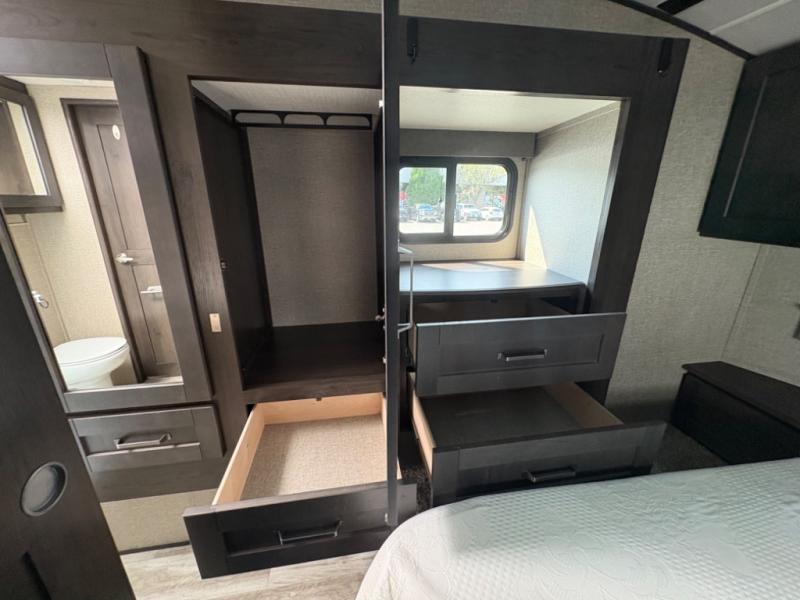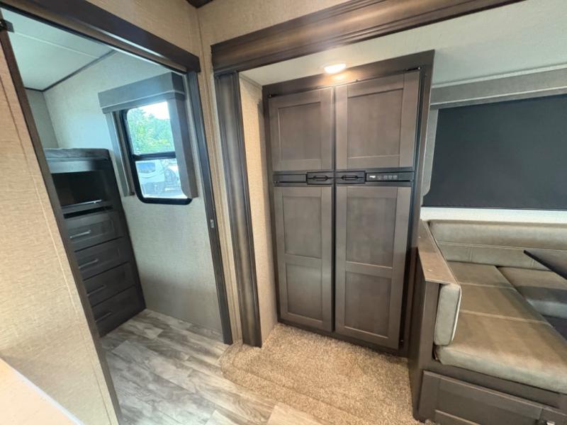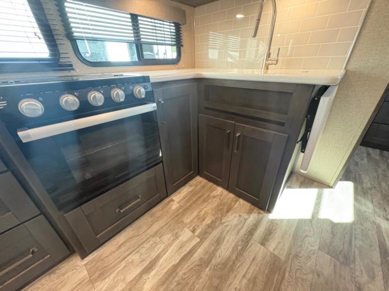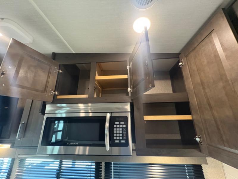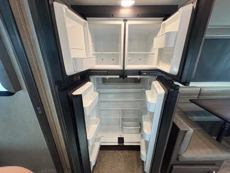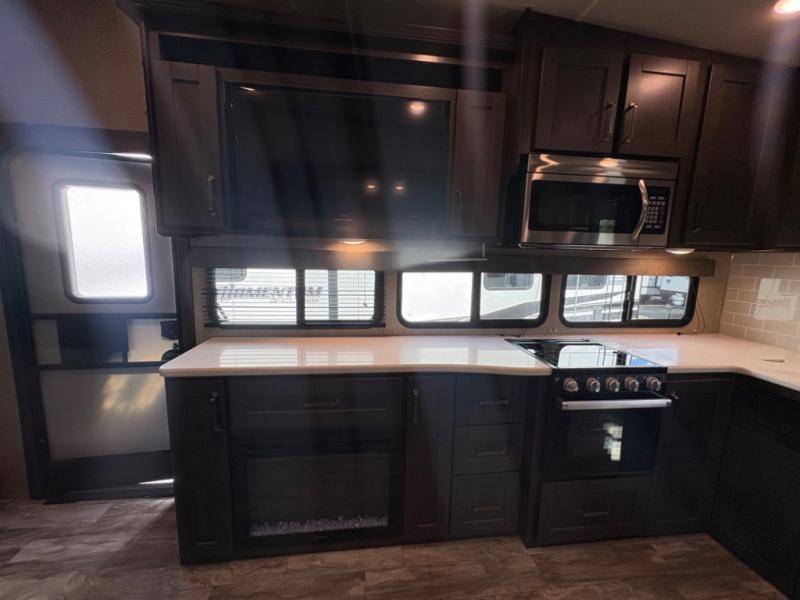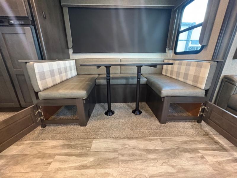 You probably selected this fifth wheel because of the rear bunkhouse that offers a 30" top bunk with a dresser below, a 34" top bunk with a 48" lower bunk, a ladder to reach the two top bunks and the privacy that it allows your family or friends when they camp with you. The gourmet kitchen has a flip-up countertop extension to make meal prepping easier and a 16 cu. ft. refrigerator to store lots of food and beverages for the large group. There is an outside kitchen as well to make meals when you want to be outdoors while others relax under the 21' electric awning. You can dine, relax and play games at the U-shaped dinette or choose the theatre seating option if you prefer, and the tri-fold sofa gives you more seating to watch the 40" LED HDTV with fireplace below. The front bedroom provides a walk-around queen bed, a slide out wardrobe with drawers and linen storage that stretches into the double entry bathroom which provides everything you need to stay clean and refreshed including a space savings radius shower.