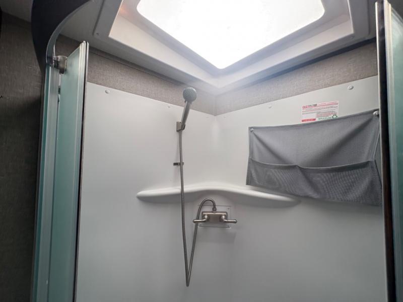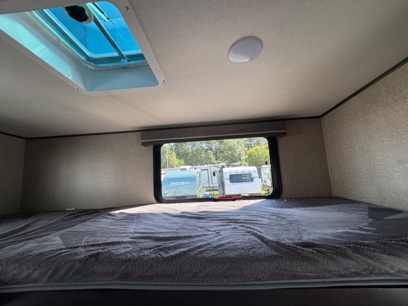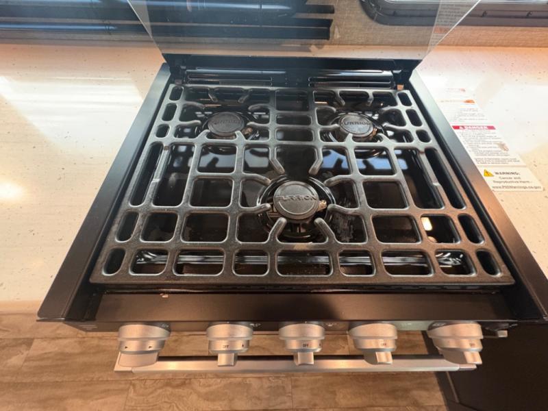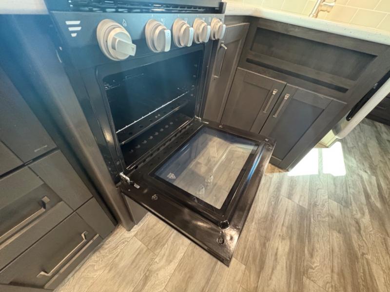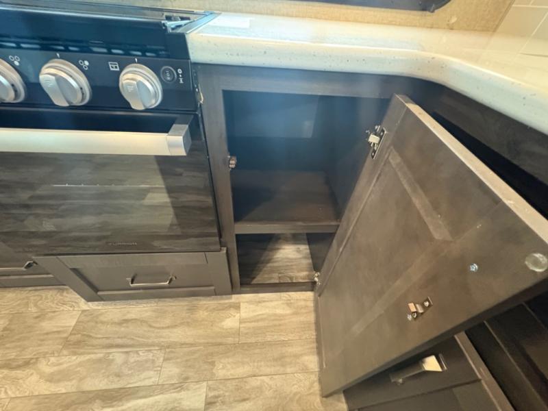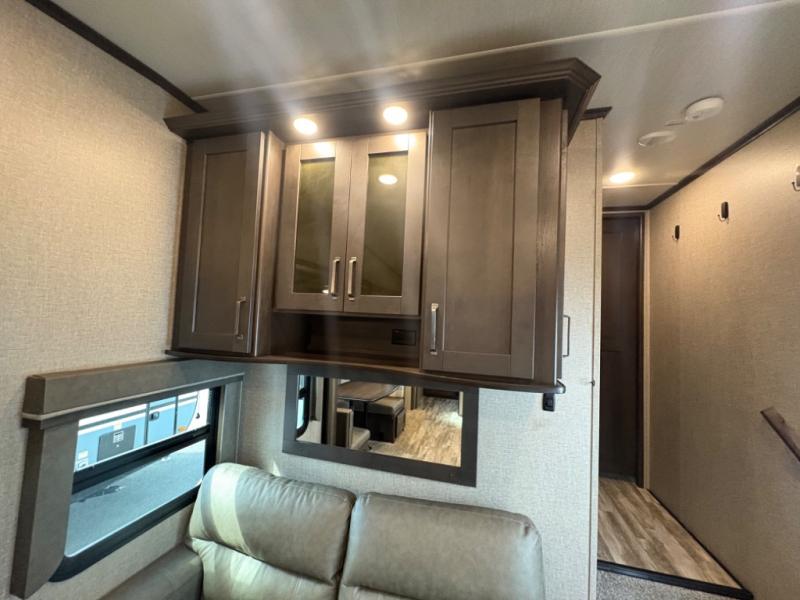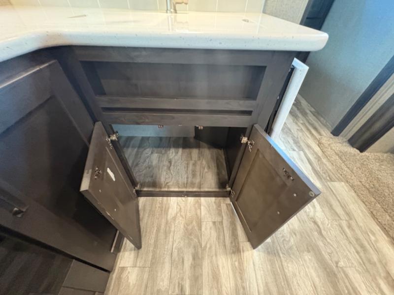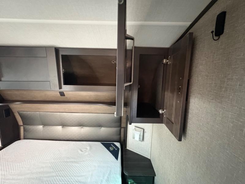 You probably selected this fifth wheel because of the rear bunkhouse that offers a 30" top bunk with a dresser below, a 34" top bunk with a 48" lower bunk, a ladder to reach the two top bunks and the privacy that it allows your family or friends when they camp with you. The gourmet kitchen has a flip-up countertop extension to make meal prepping easier and a 16 cu. ft. refrigerator to store lots of food and beverages for the large group. There is an outside kitchen as well to make meals when you want to be outdoors while others relax under the 21' electric awning. You can dine, relax and play games at the U-shaped dinette or choose the theatre seating option if you prefer, and the tri-fold sofa gives you more seating to watch the 40" LED HDTV with fireplace below. The front bedroom provides a walk-around queen bed, a slide out wardrobe with drawers and linen storage that stretches into the double entry bathroom which provides everything you need to stay clean and refreshed including a space savings radius shower.