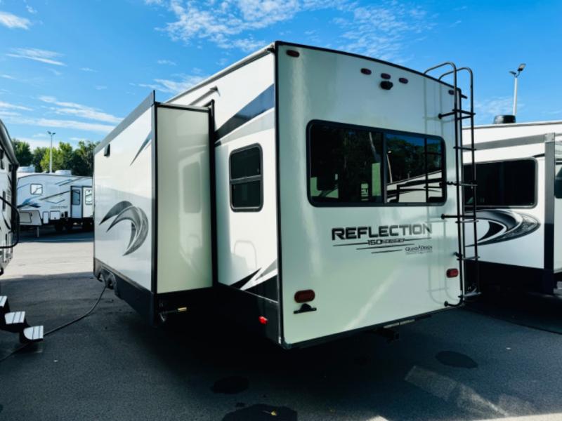 With any Reflection 150 Series fifth wheel by Grand Design, there is more available payload capacity and a broader range of half-ton trucks capable of towing this fifth wheel, and no slider hitch is needed thanks to the 90-degree turning radius which makes them short bed friendly and easier to tow. The mandatory Ultimate Power package provides a "One-Touch" automatic leveling system and a detachable power cord with LED light for easy setup, plus motion sensor pass-through lighting and entry lighting, and the Tire Linc TPMS will help you stay safe on the road. The interior offers residential luxury from the cabinetry and gunstock hardware plus the booth dinette to the residential-style window treatment. Make your refined decision today!