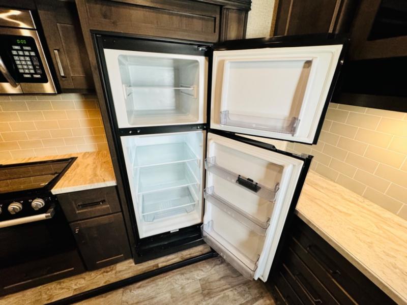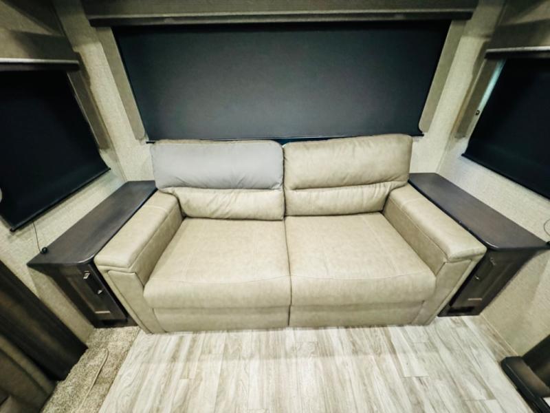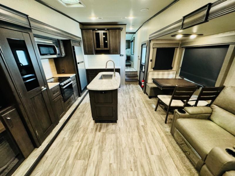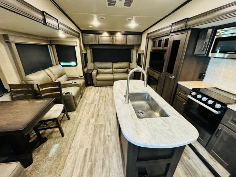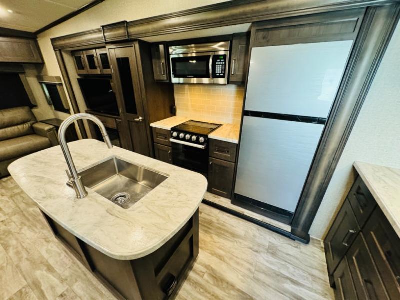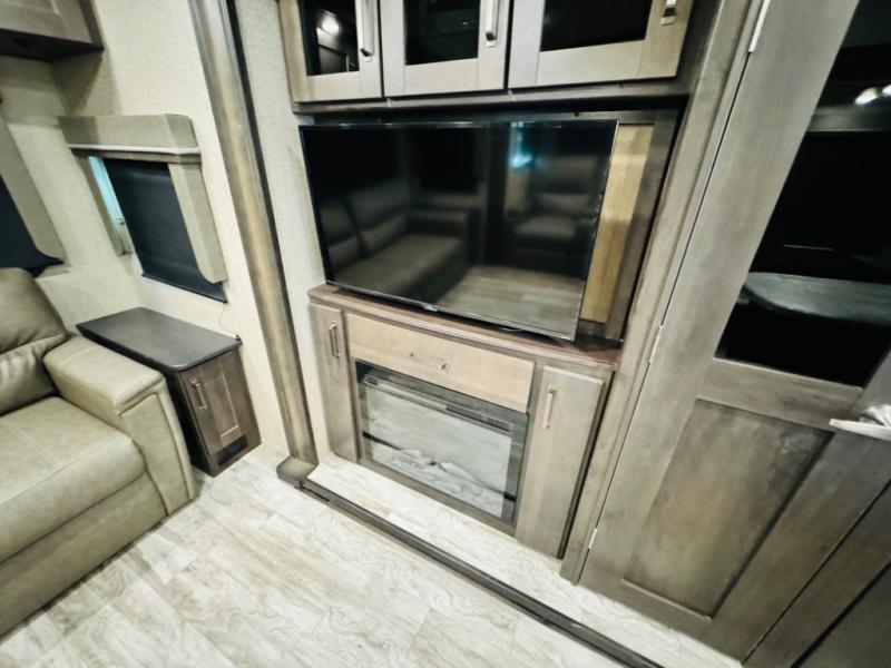 Get ready to enjoy everything the campgrounds and surrounding area has to offer when you are setup to camp in this fifth wheel! The two electric awnings offer protected areas creating outdoor living spaces, just grab your camping chairs from the unobstructed pass-through storage. And the interior offers a spacious living area and kitchen combination with two slide outs. You can sit on the tri-fold sofa or the dinette with an option for a free standing dinette. The hutch and kitchen island offer counter space to prepare and serve meals, and there is a large pantry for goodies. The 40" LED HDTV with fireplace below provides entertainment before bedtime or on a rainy day. And the front bedroom offers privacy, a walk-around queen bed, storage, and it is next to the full bathroom which is just a few steps down the hallway.