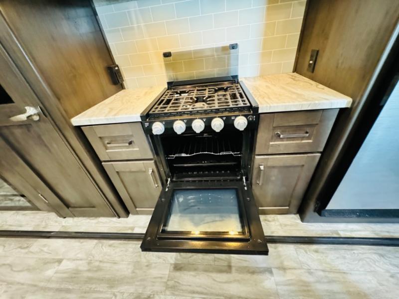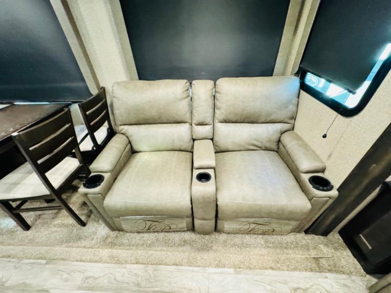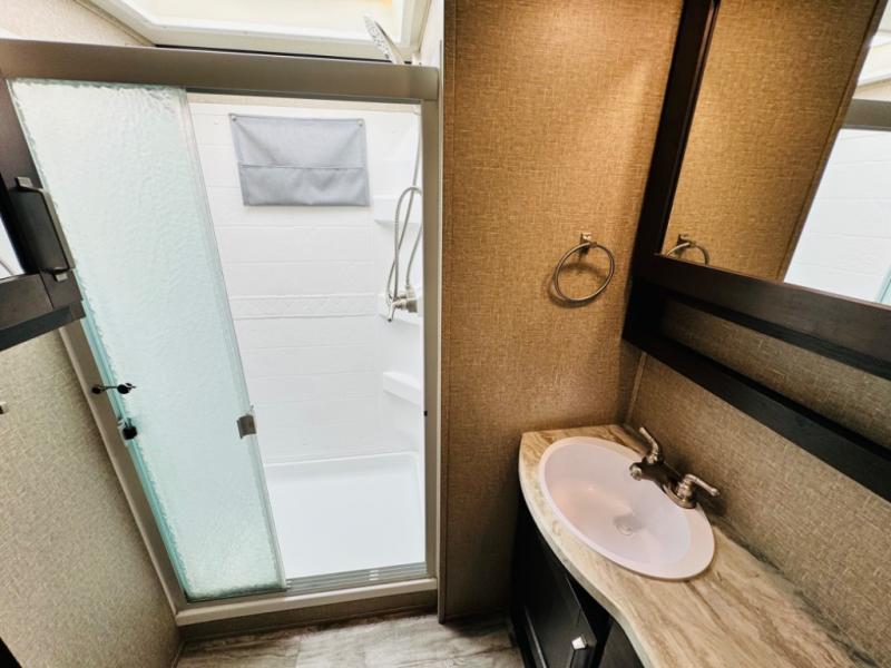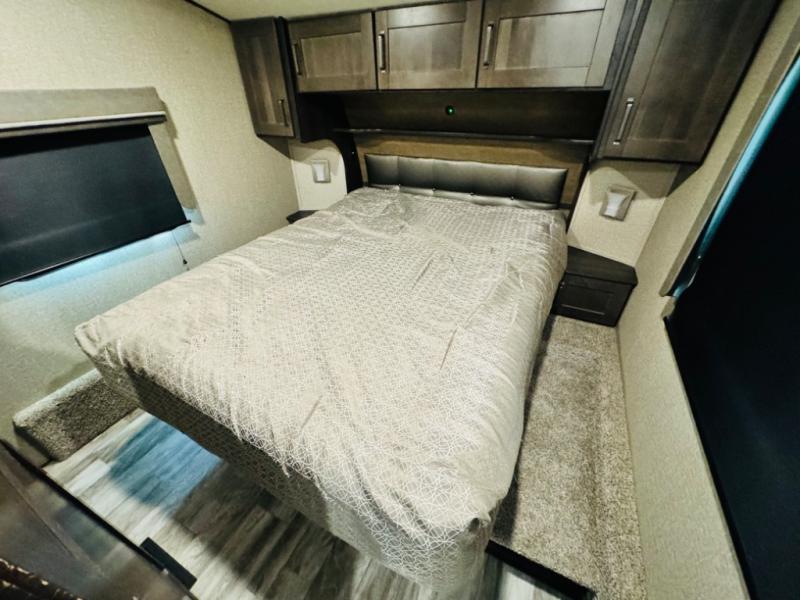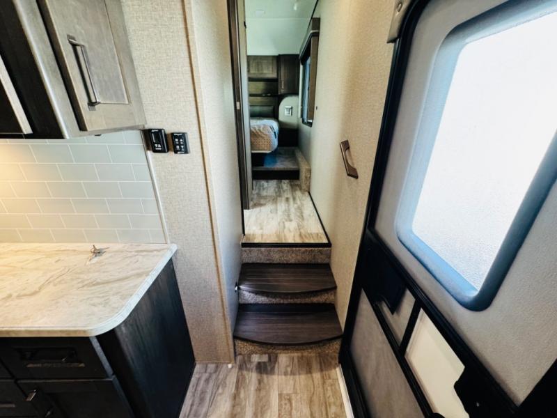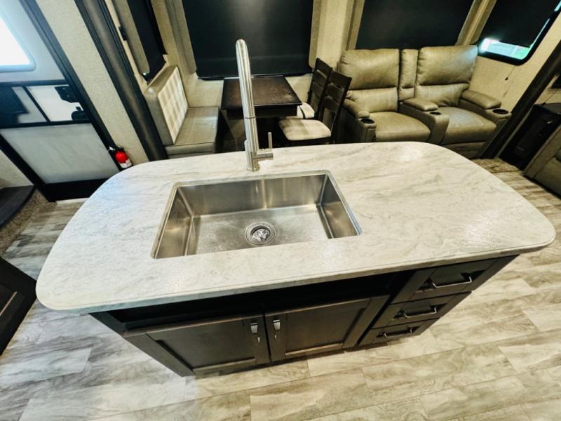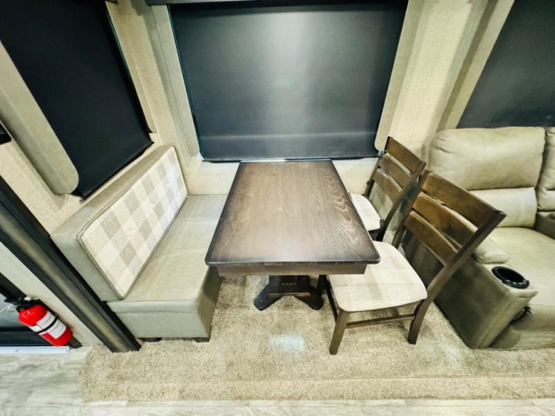 Get ready to enjoy everything the campgrounds and surrounding area has to offer when you are setup to camp in this fifth wheel! The two electric awnings offer protected areas creating outdoor living spaces, just grab your camping chairs from the unobstructed pass-through storage. And the interior offers a spacious living area and kitchen combination with two slide outs. You can sit on the tri-fold sofa or the dinette with an option for a free standing dinette. The hutch and kitchen island offer counter space to prepare and serve meals, and there is a large pantry for goodies. The 40" LED HDTV with fireplace below provides entertainment before bedtime or on a rainy day. And the front bedroom offers privacy, a walk-around queen bed, storage, and it is next to the full bathroom which is just a few steps down the hallway.
