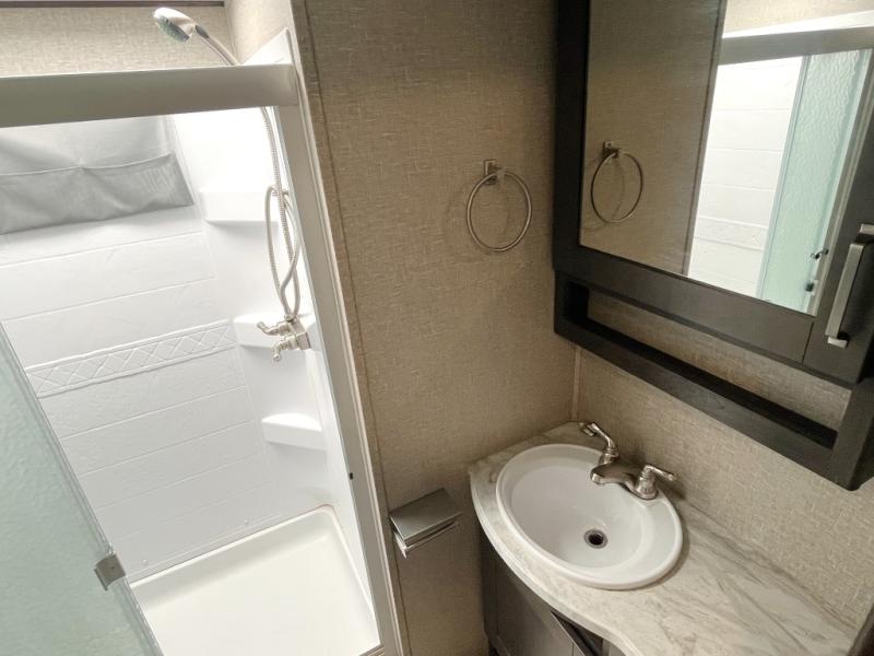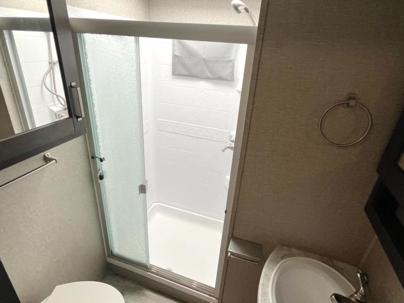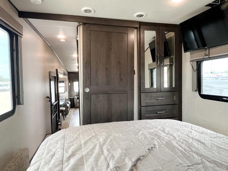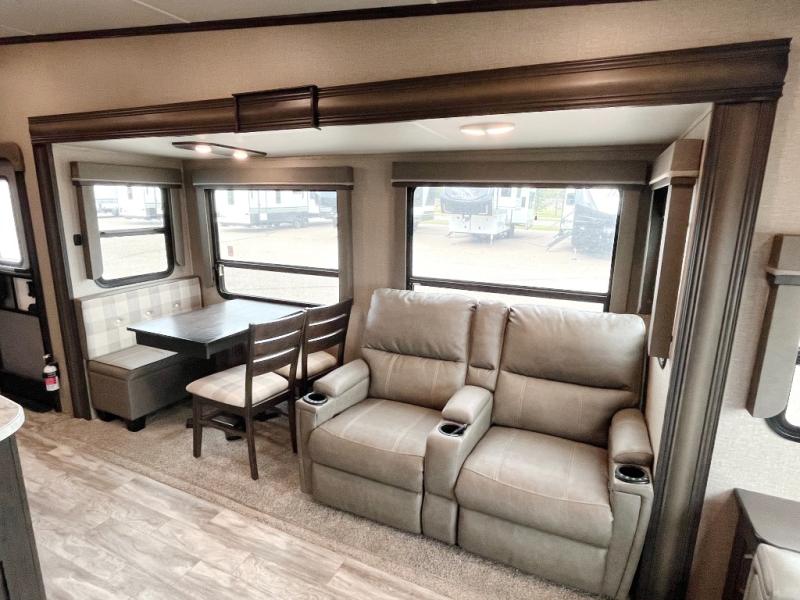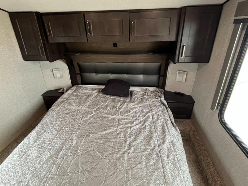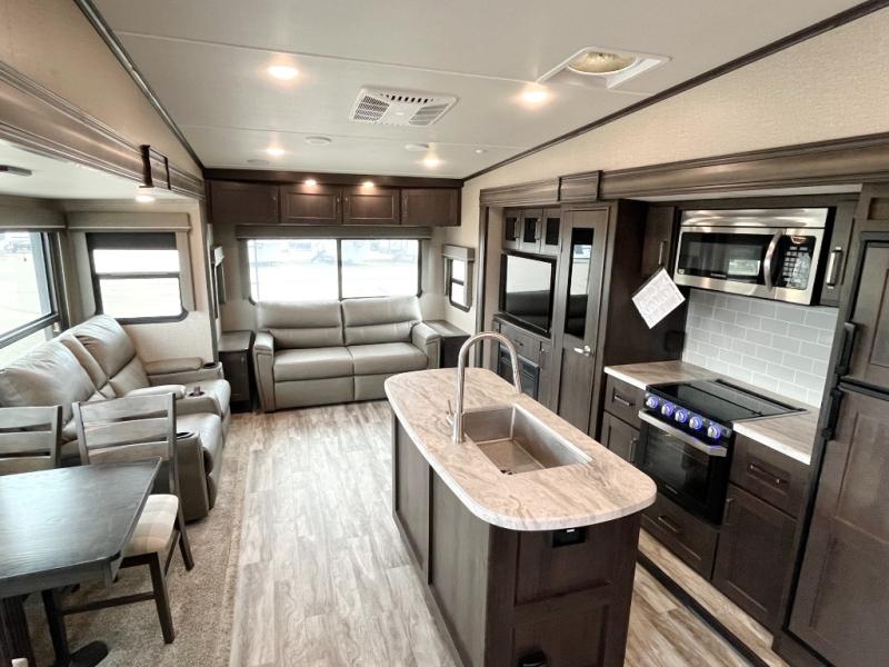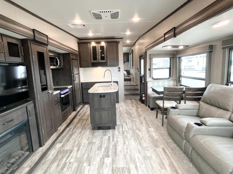 Get ready to enjoy everything the campgrounds and surrounding area has to offer when you are setup to camp in this fifth wheel! The two electric awnings offer protected areas creating outdoor living spaces, just grab your camping chairs from the unobstructed pass-through storage. And the interior offers a spacious living area and kitchen combination with two slide outs. You can sit on the tri-fold sofa or the dinette with an option for a free standing dinette. The hutch and kitchen island offer counter space to prepare and serve meals, and there is a large pantry for goodies. The 40" LED HDTV with fireplace below provides entertainment before bedtime or on a rainy day. And the front bedroom offers privacy, a walk-around queen bed, storage, and it is next to the full bathroom which is just a few steps down the hallway.