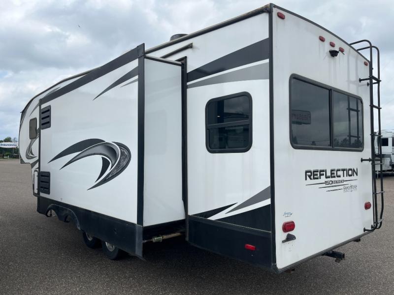With any Reflection 150 Series fifth wheel by Grand Design, there is more available payload capacity and a broader range of half-ton trucks capable of towing this fifth wheel, and no slider hitch is needed thanks to the 90-degree turning radius which makes them short bed friendly and easier to tow. The mandatory Ultimate Power package provides a "One-Touch" automatic leveling system and a detachable power cord with LED light for easy setup, plus motion sensor pass-through lighting and entry lighting, and the Tire Linc TPMS will help you stay safe on the road. The interior offers residential luxury from the cabinetry and gunstock hardware plus the booth dinette to the residential-style window treatment. Make your refined decision today!