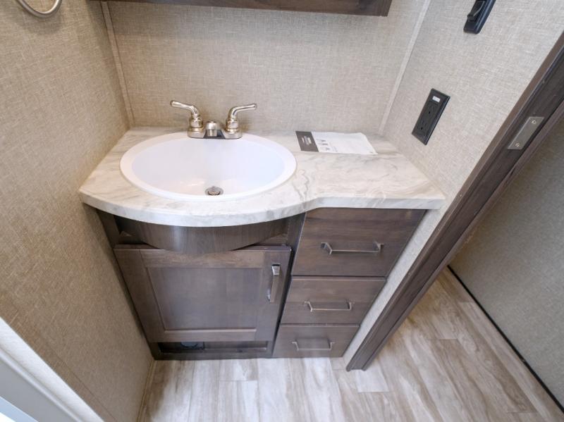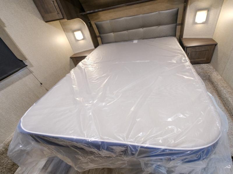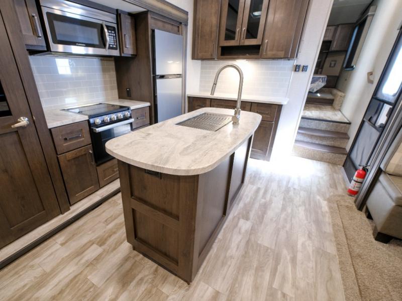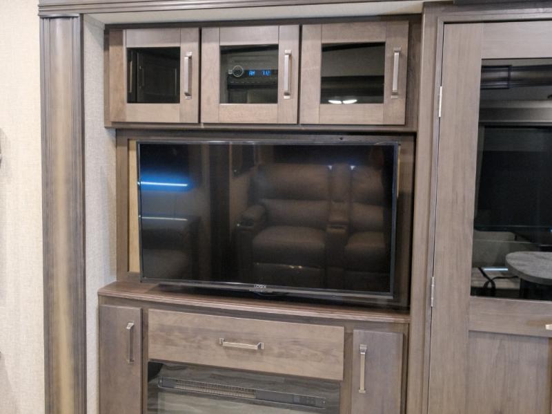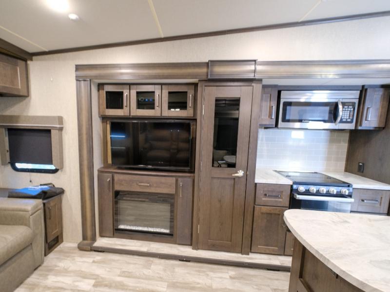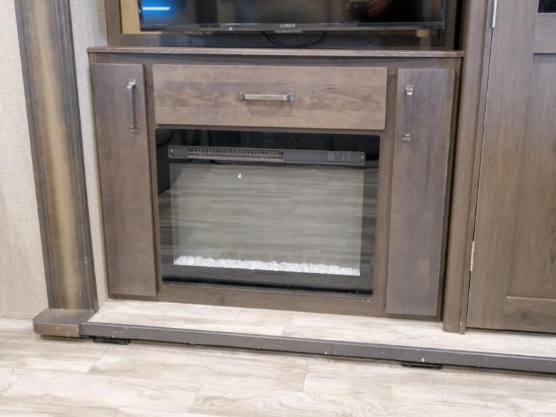 Get ready to enjoy everything the campgrounds and surrounding area has to offer when you are setup to camp in this fifth wheel! The two electric awnings offer protected areas creating outdoor living spaces, just grab your camping chairs from the unobstructed pass-through storage. And the interior offers a spacious living area and kitchen combination with two slide outs. You can sit on the tri-fold sofa or the dinette with an option for a free standing dinette. The hutch and kitchen island offer counter space to prepare and serve meals, and there is a large pantry for goodies. The 40" LED HDTV with fireplace below provides entertainment before bedtime or on a rainy day. And the front bedroom offers privacy, a walk-around queen bed, storage, and it is next to the full bathroom which is just a few steps down the hallway.
