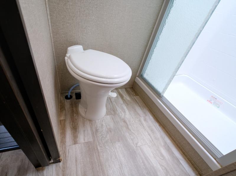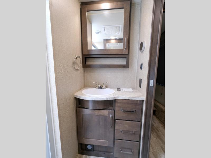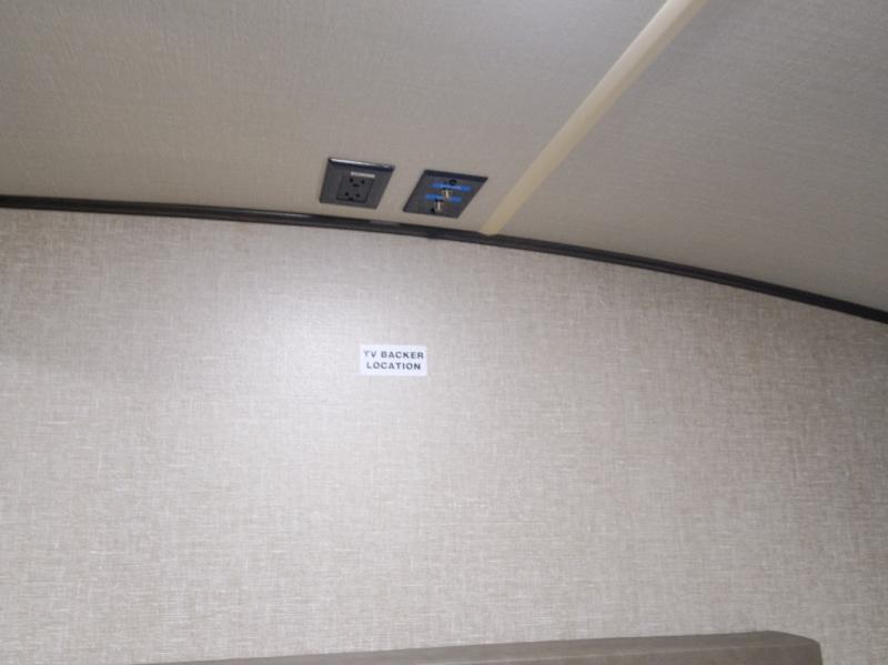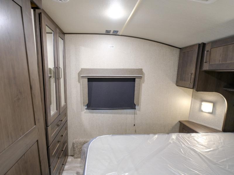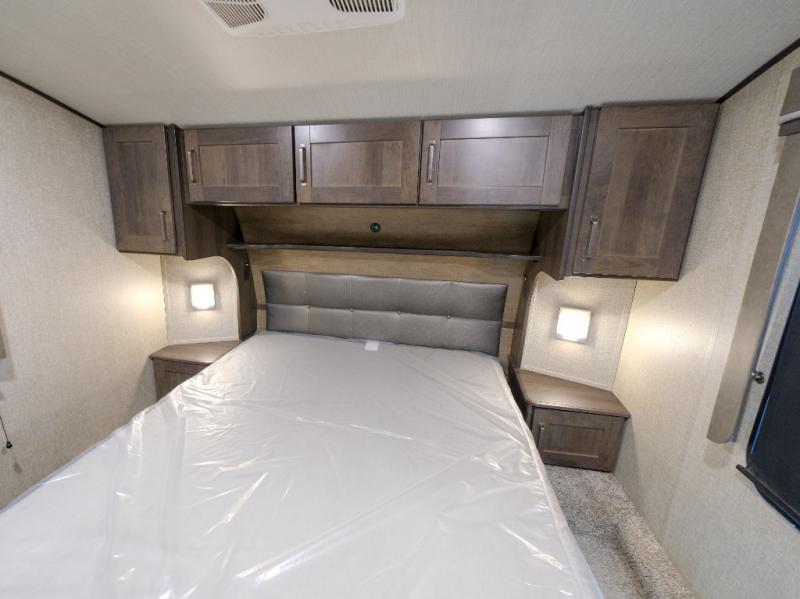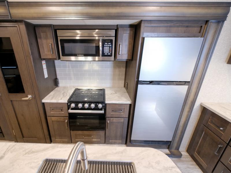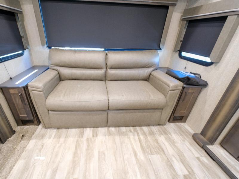 Get ready to enjoy everything the campgrounds and surrounding area has to offer when you are setup to camp in this fifth wheel! The two electric awnings offer protected areas creating outdoor living spaces, just grab your camping chairs from the unobstructed pass-through storage. And the interior offers a spacious living area and kitchen combination with two slide outs. You can sit on the tri-fold sofa or the dinette with an option for a free standing dinette. The hutch and kitchen island offer counter space to prepare and serve meals, and there is a large pantry for goodies. The 40" LED HDTV with fireplace below provides entertainment before bedtime or on a rainy day. And the front bedroom offers privacy, a walk-around queen bed, storage, and it is next to the full bathroom which is just a few steps down the hallway.