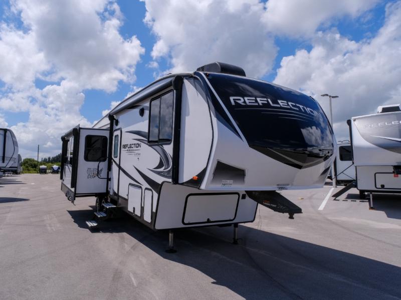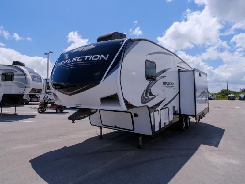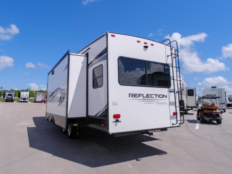 With any Reflection 150 Series fifth wheel by Grand Design, there is more available payload capacity and a broader range of half-ton trucks capable of towing this fifth wheel, and no slider hitch is needed thanks to the 90-degree turning radius which makes them short bed friendly and easier to tow. The mandatory Ultimate Power package provides a "One-Touch" automatic leveling system and a detachable power cord with LED light for easy setup, plus motion sensor pass-through lighting and entry lighting, and the Tire Linc TPMS will help you stay safe on the road. The interior offers residential luxury from the cabinetry and gunstock hardware plus the booth dinette to the residential-style window treatment. Make your refined decision today!