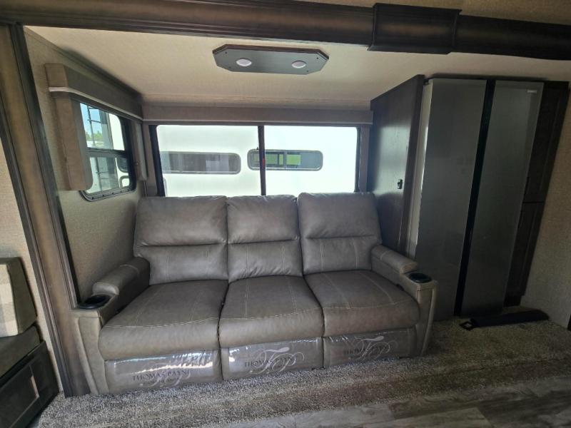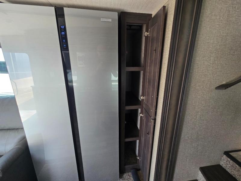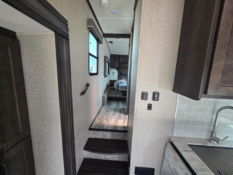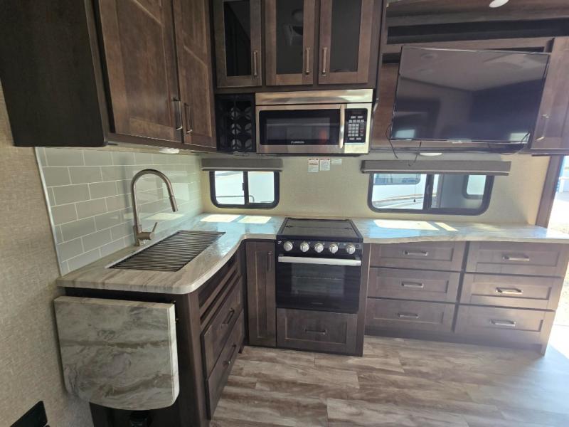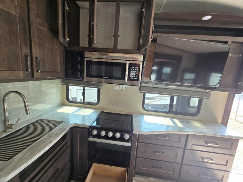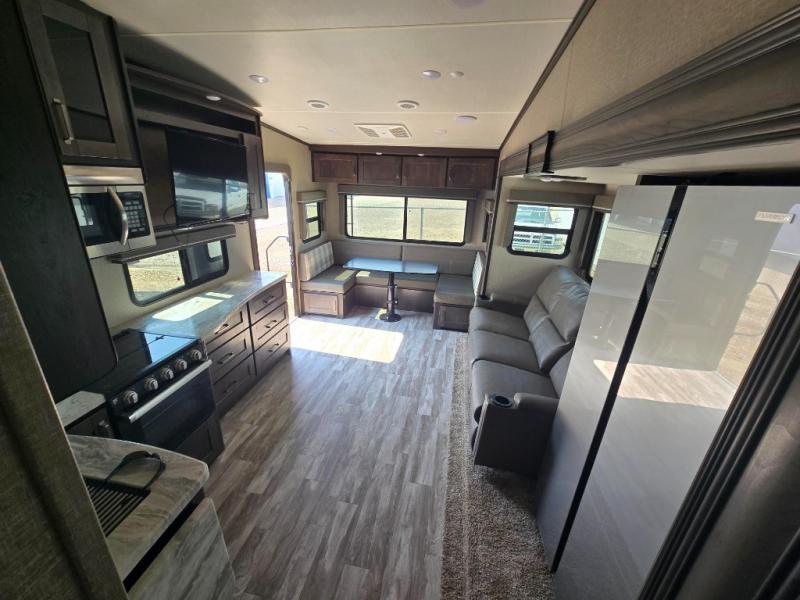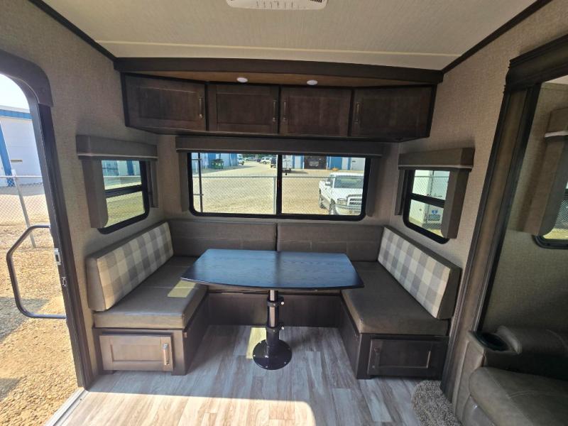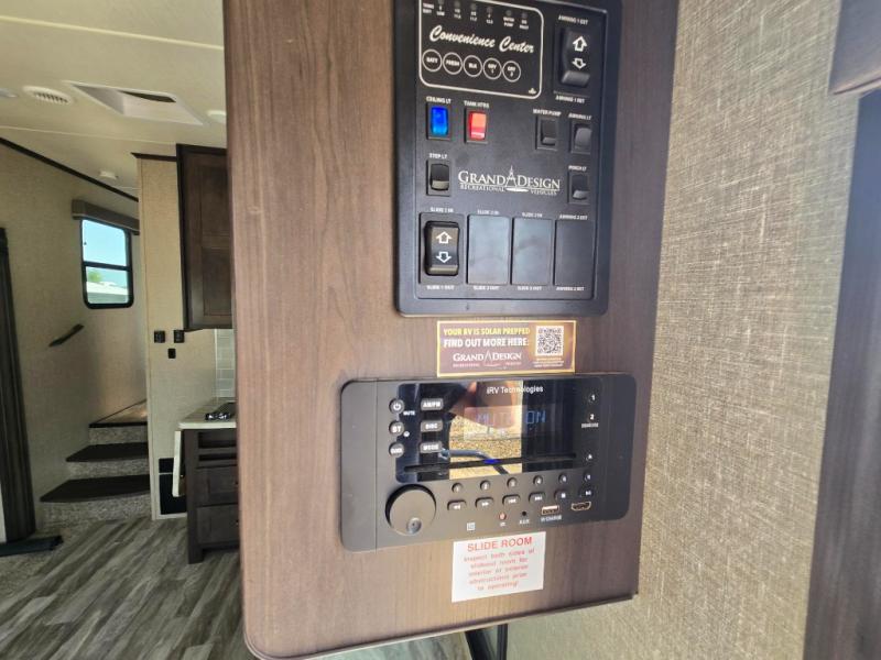 With any Reflection 150 Series fifth wheel by Grand Design, there is more available payload capacity and a broader range of half-ton trucks capable of towing this fifth wheel, and no slider hitch is needed thanks to the 90-degree turning radius which makes them short bed friendly and easier to tow. The mandatory Ultimate Power package provides a "One-Touch" automatic leveling system and a detachable power cord with LED light for easy setup, plus motion sensor pass-through lighting and entry lighting, and the Tire Linc TPMS will help you stay safe on the road. The interior offers residential luxury from the cabinetry and gunstock hardware plus the booth dinette to the residential-style window treatment. Make your refined decision today!