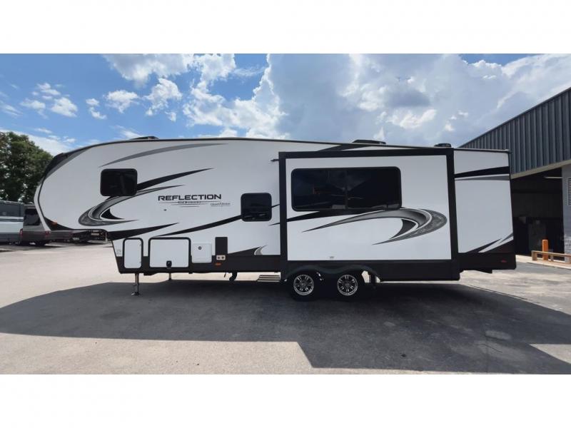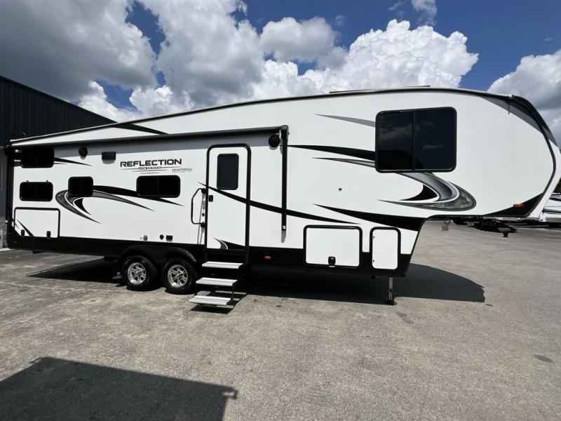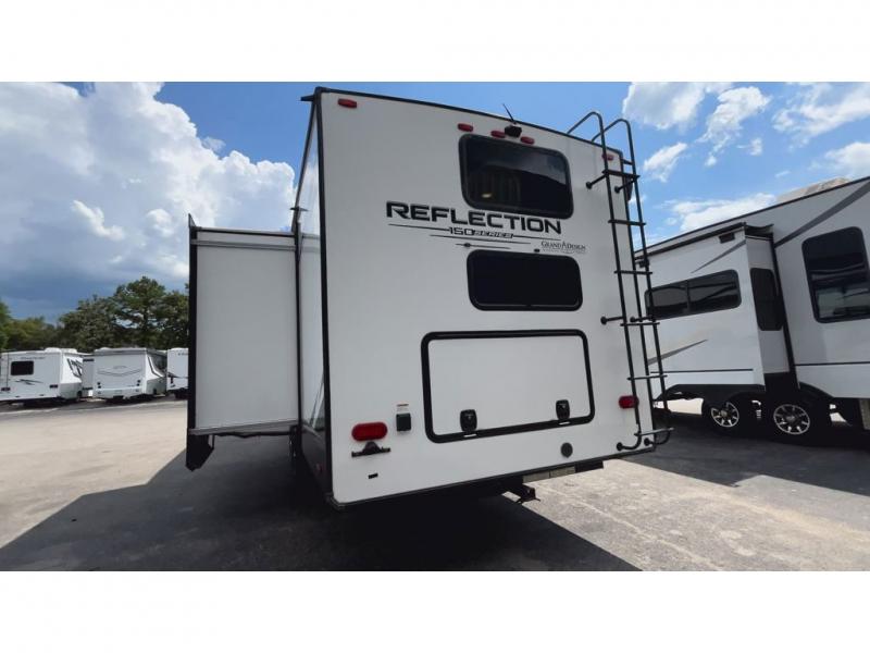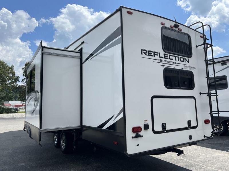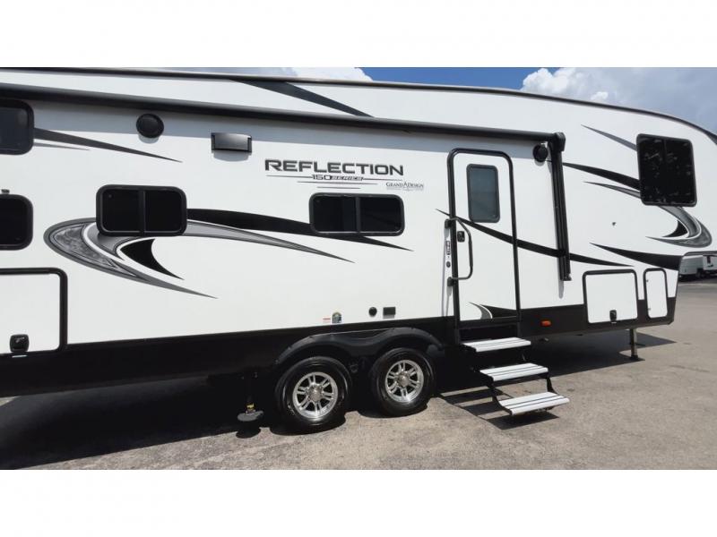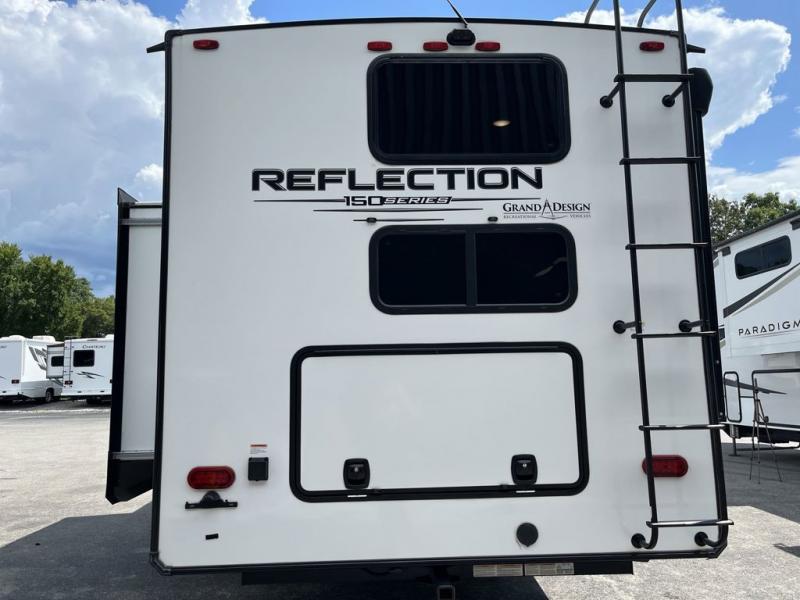 With any Reflection 150 Series fifth wheel by Grand Design, there is more available payload capacity and a broader range of half-ton trucks capable of towing this fifth wheel, and no slider hitch is needed thanks to the 90-degree turning radius which makes them short bed friendly and easier to tow. The mandatory Ultimate Power package provides a "One-Touch" automatic leveling system and a detachable power cord with LED light for easy setup, plus motion sensor pass-through lighting and entry lighting, and the Tire Linc TPMS will help you stay safe on the road. The interior offers residential luxury from the cabinetry and gunstock hardware plus the booth dinette to the residential-style window treatment. Make your refined decision today!