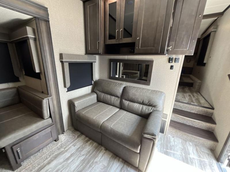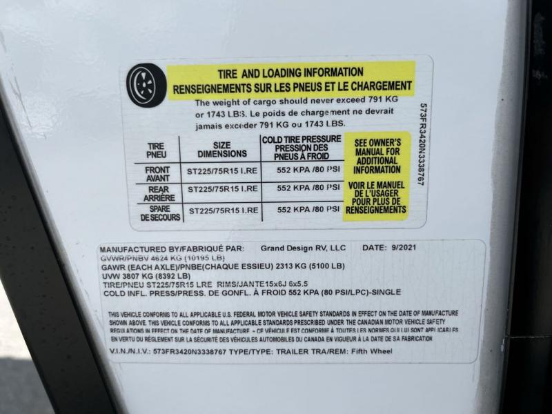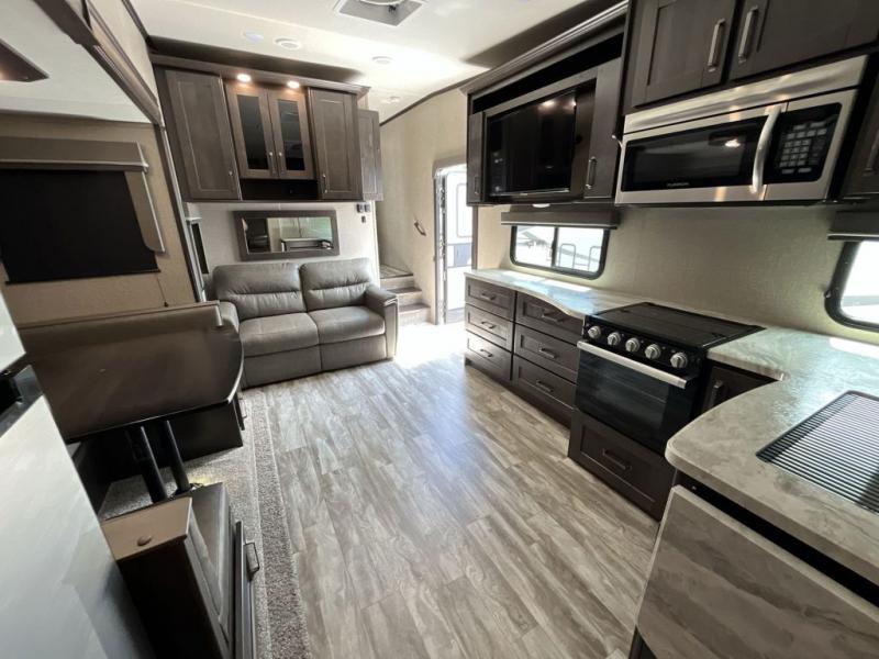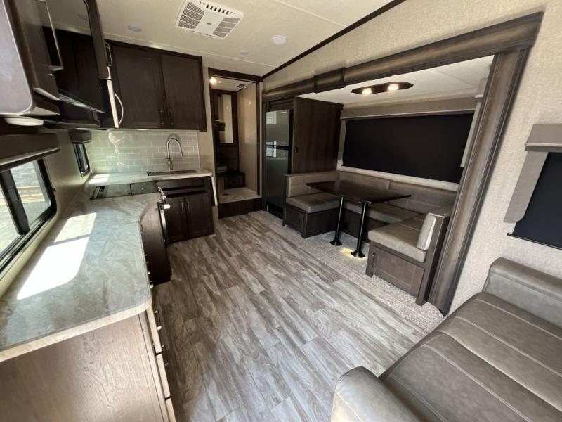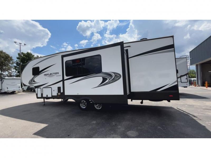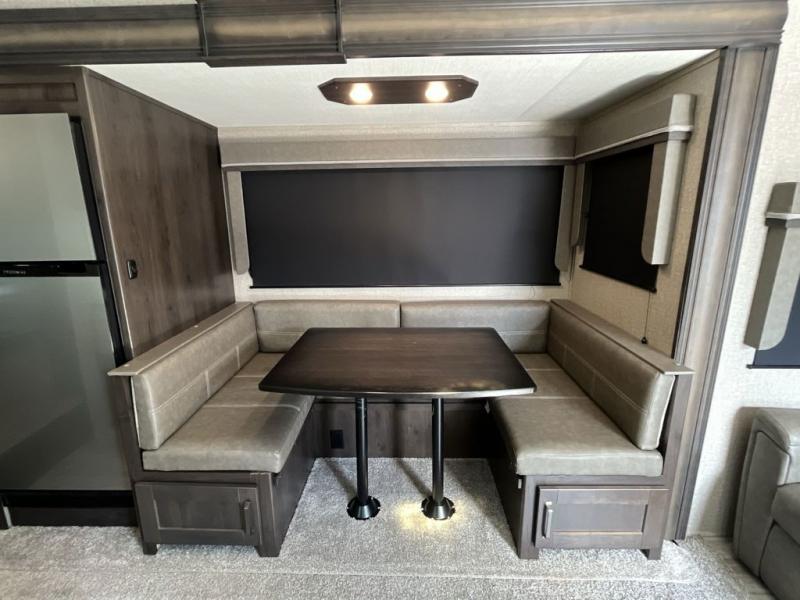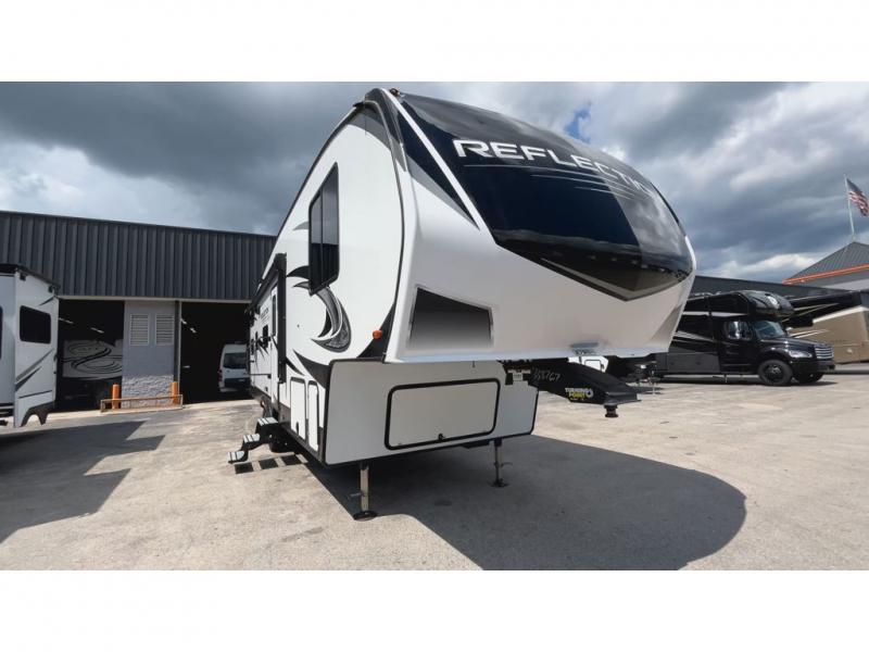 With any Reflection 150 Series fifth wheel by Grand Design, there is more available payload capacity and a broader range of half-ton trucks capable of towing this fifth wheel, and no slider hitch is needed thanks to the 90-degree turning radius which makes them short bed friendly and easier to tow. The mandatory Ultimate Power package provides a "One-Touch" automatic leveling system and a detachable power cord with LED light for easy setup, plus motion sensor pass-through lighting and entry lighting, and the Tire Linc TPMS will help you stay safe on the road. The interior offers residential luxury from the cabinetry and gunstock hardware plus the booth dinette to the residential-style window treatment. Make your refined decision today!