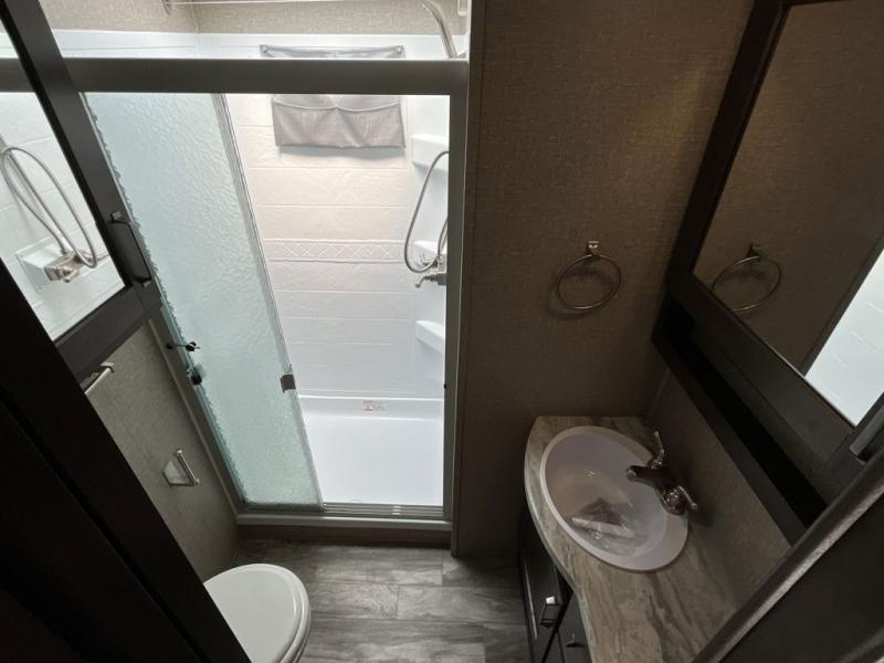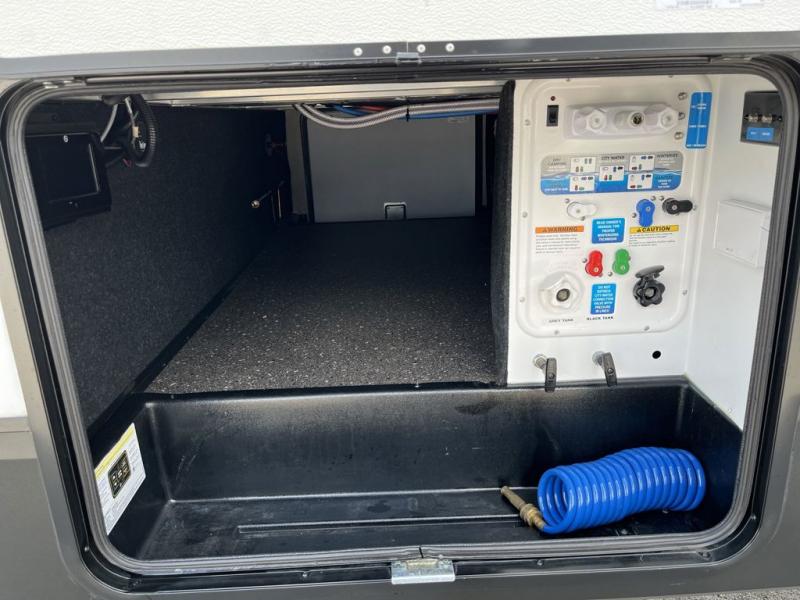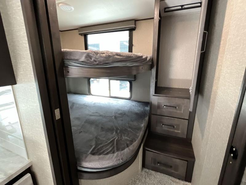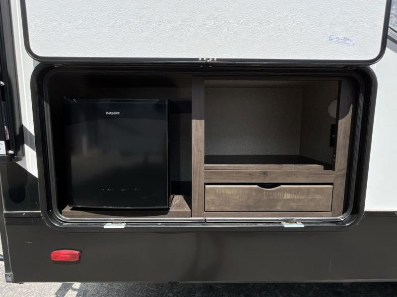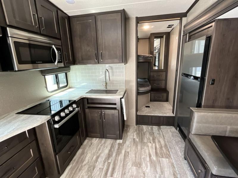 When you enjoy the outdoors as much as the indoors, this fifth wheel offers convenience and comfort throughout the inside and outside! From some of the exterior features such as the outside kitchen to make meals while visiting with other RVers, the spray port to wash off dirty shoes, the rear storage, the All-In-One docking station, the 20' electric awning and aluminum entry steps for safe entry to the interior features with a walk-around queen bed in the front private bedroom and the double-size bunks in the rear with step storage to the 40" LED HDTV in the main living and kitchen area. The tri-fold sofa and U-shaped dinette offer extra sleeping space as well, and the cook will love the L-shaped kitchen area inside with full amenities.
