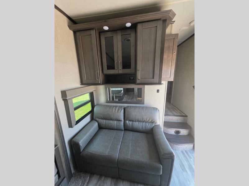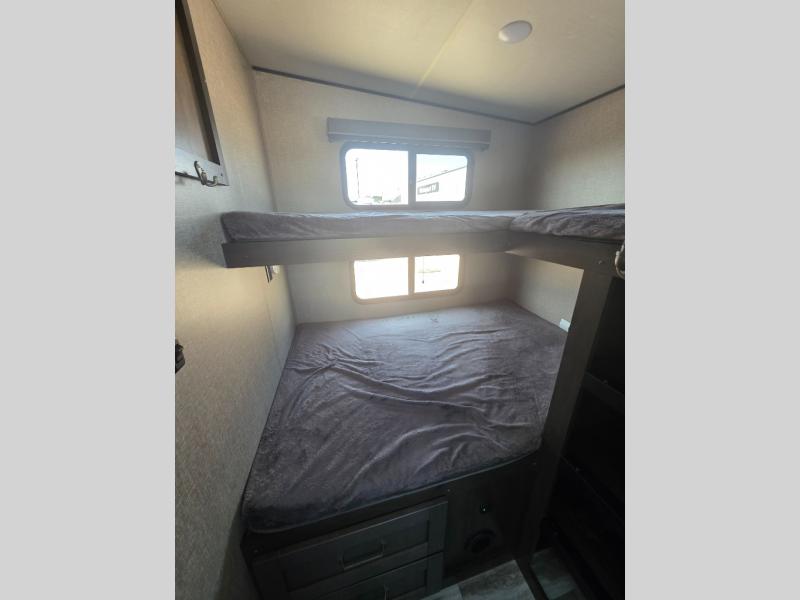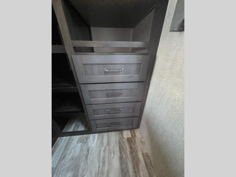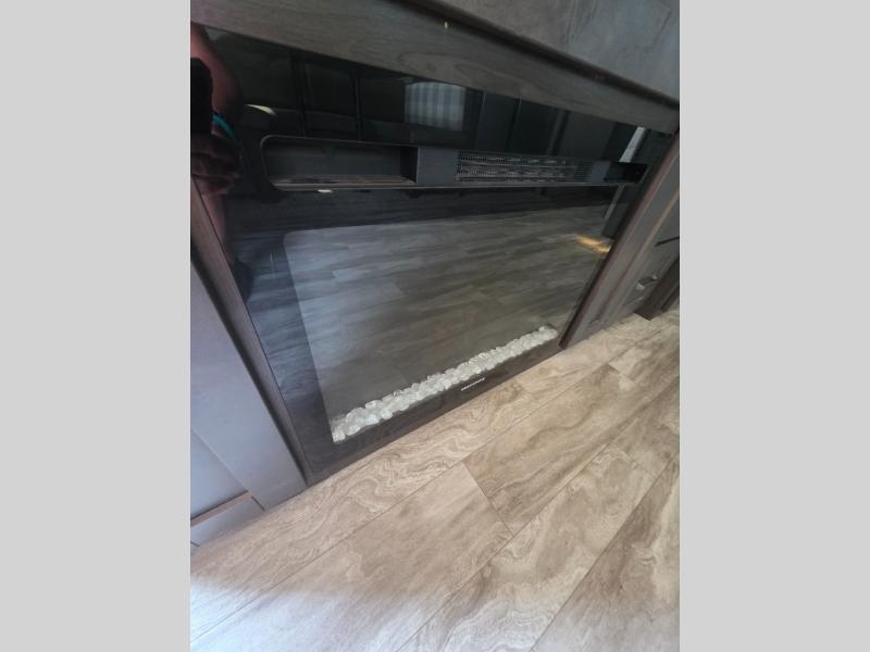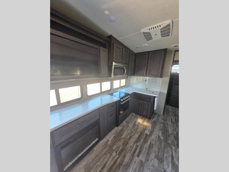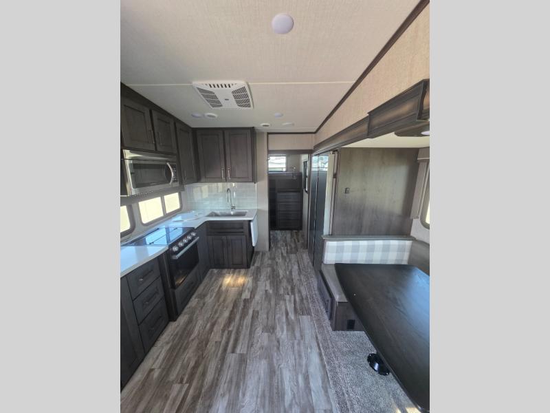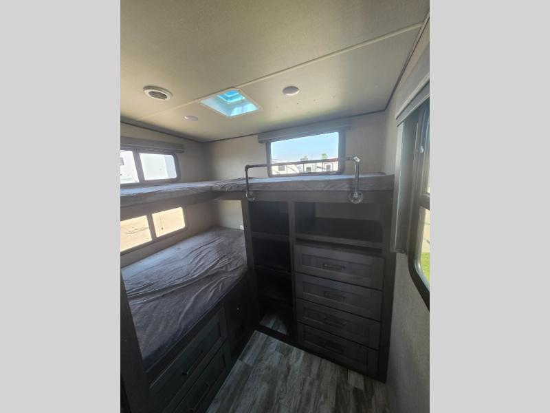 You probably selected this fifth wheel because of the rear bunkhouse that offers a 30" top bunk with a dresser below, a 34" top bunk with a 48" lower bunk, a ladder to reach the two top bunks and the privacy that it allows your family or friends when they camp with you. The gourmet kitchen has a flip-up countertop extension to make meal prepping easier and a 16 cu. ft. refrigerator to store lots of food and beverages for the large group. There is an outside kitchen as well to make meals when you want to be outdoors while others relax under the 21' electric awning. You can dine, relax and play games at the U-shaped dinette or choose the theatre seating option if you prefer, and the tri-fold sofa gives you more seating to watch the 40" LED HDTV with fireplace below. The front bedroom provides a walk-around queen bed, a slide out wardrobe with drawers and linen storage that stretches into the double entry bathroom which provides everything you need to stay clean and refreshed including a space savings radius shower.