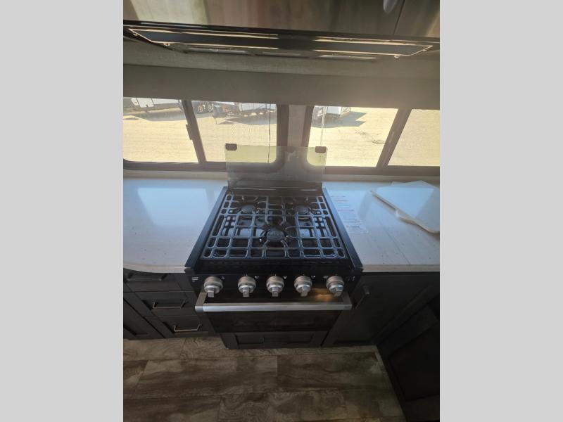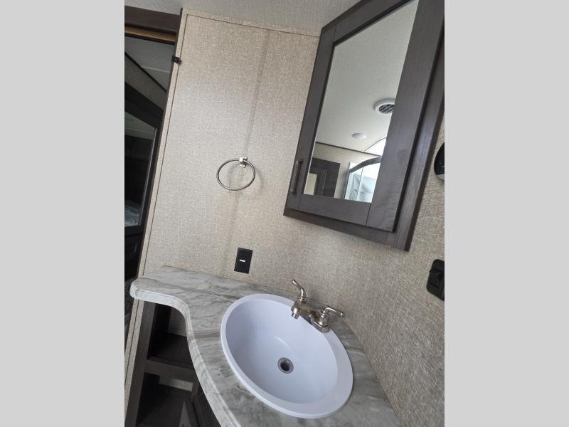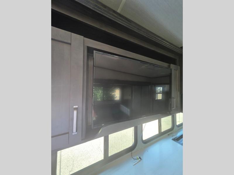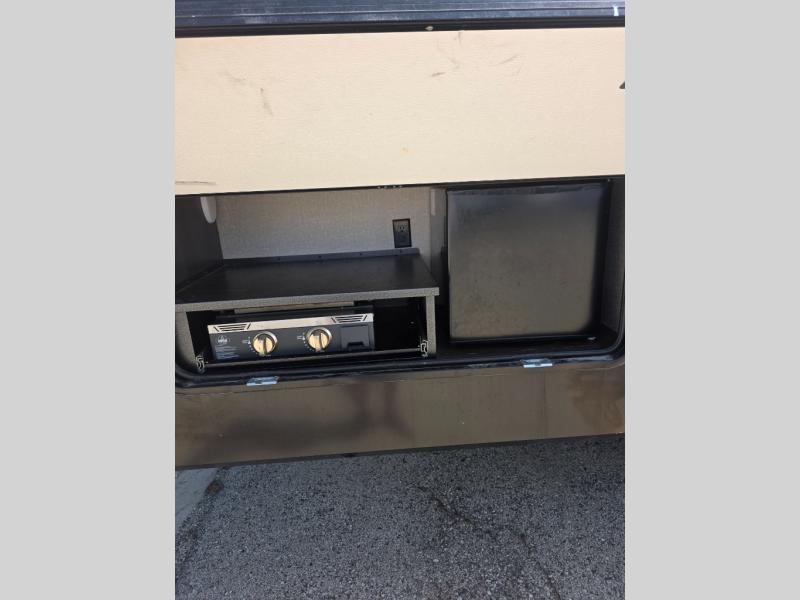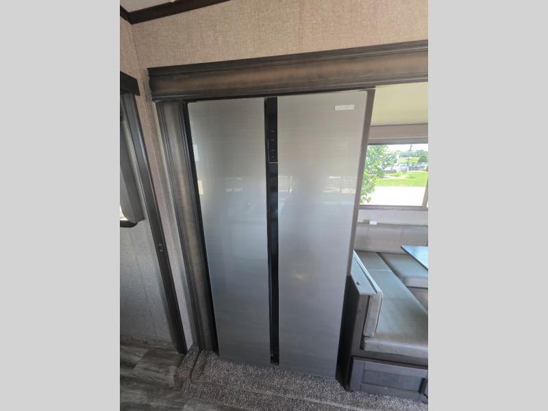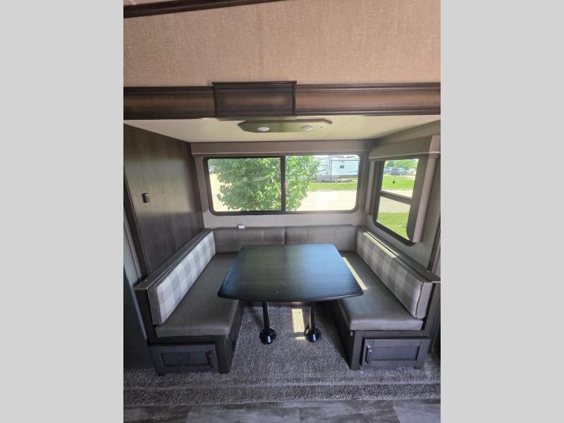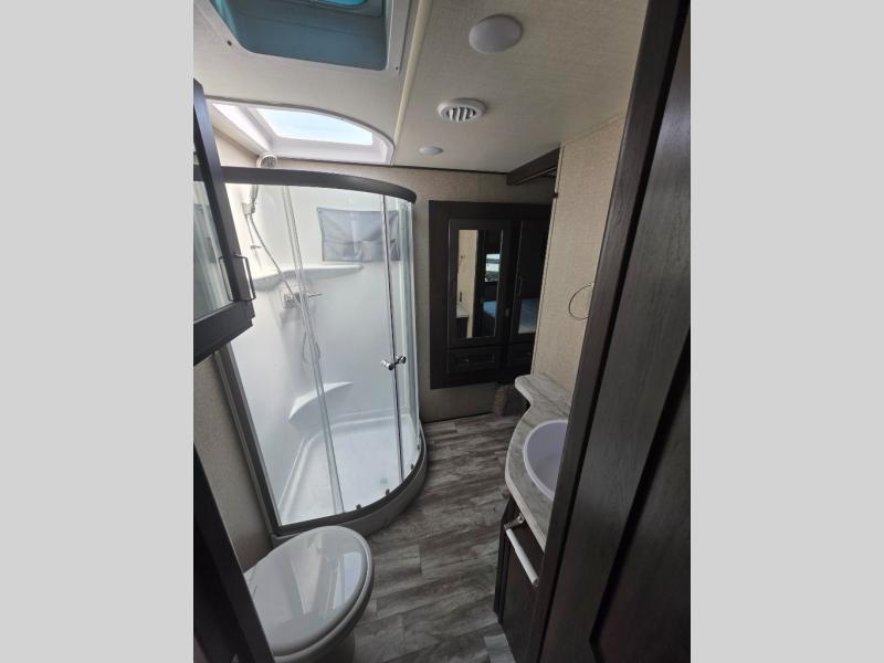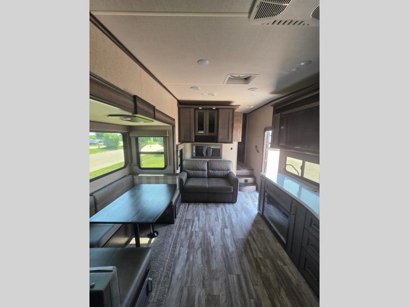 You probably selected this fifth wheel because of the rear bunkhouse that offers a 30" top bunk with a dresser below, a 34" top bunk with a 48" lower bunk, a ladder to reach the two top bunks and the privacy that it allows your family or friends when they camp with you. The gourmet kitchen has a flip-up countertop extension to make meal prepping easier and a 16 cu. ft. refrigerator to store lots of food and beverages for the large group. There is an outside kitchen as well to make meals when you want to be outdoors while others relax under the 21' electric awning. You can dine, relax and play games at the U-shaped dinette or choose the theatre seating option if you prefer, and the tri-fold sofa gives you more seating to watch the 40" LED HDTV with fireplace below. The front bedroom provides a walk-around queen bed, a slide out wardrobe with drawers and linen storage that stretches into the double entry bathroom which provides everything you need to stay clean and refreshed including a space savings radius shower.