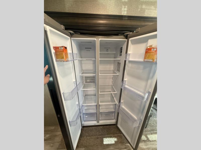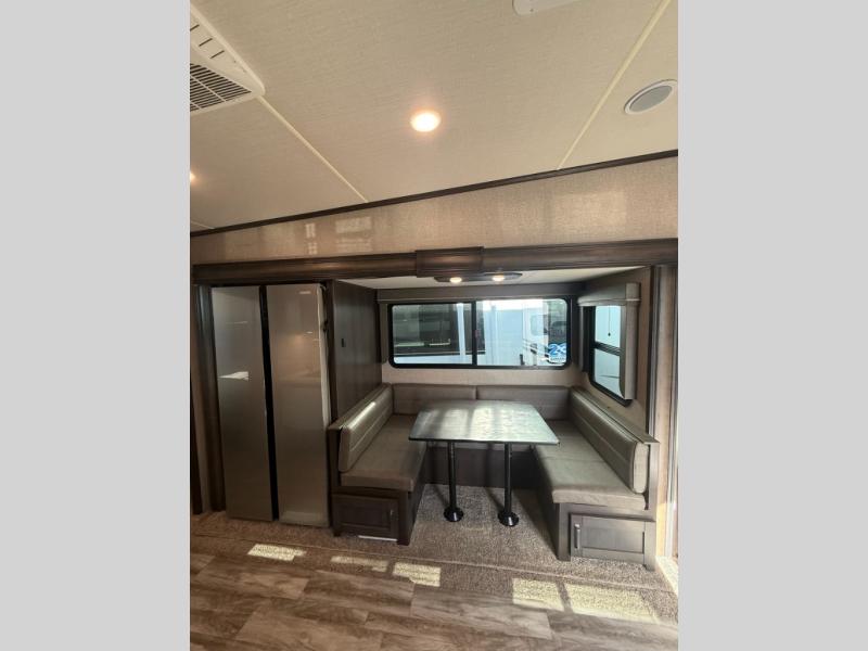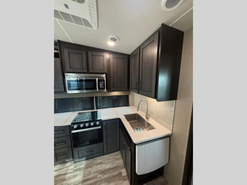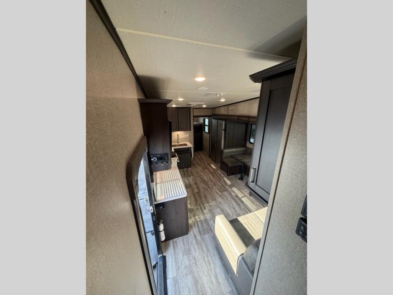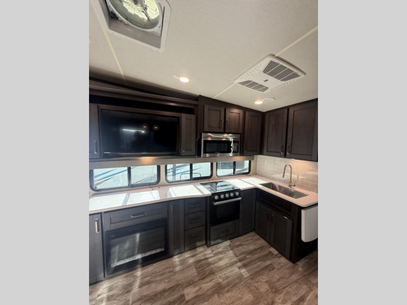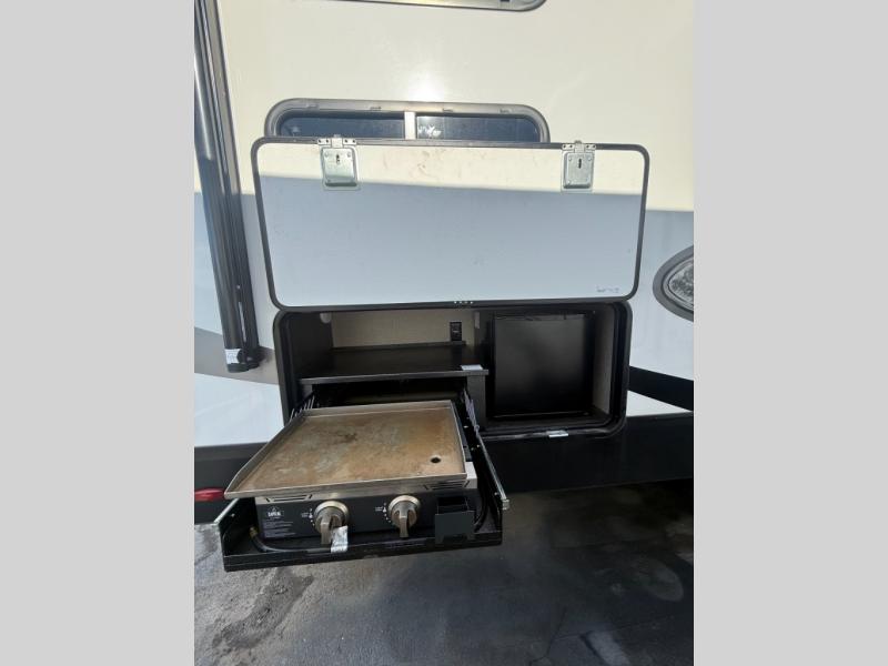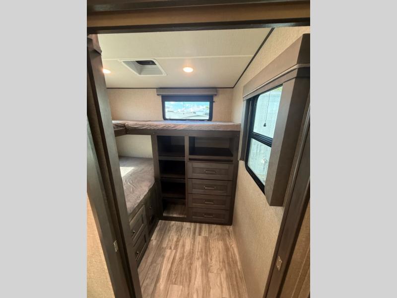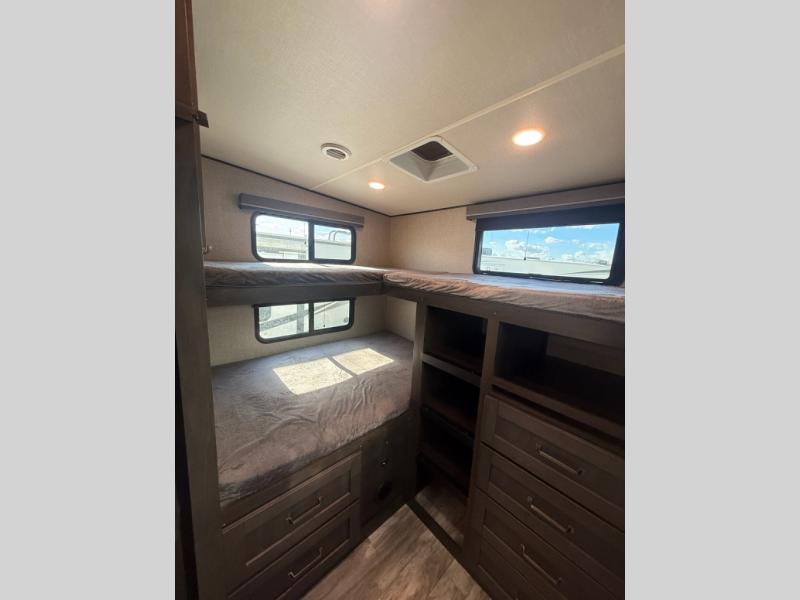 You probably selected this fifth wheel because of the rear bunkhouse that offers a 30" top bunk with a dresser below, a 34" top bunk with a 48" lower bunk, a ladder to reach the two top bunks and the privacy that it allows your family or friends when they camp with you. The gourmet kitchen has a flip-up countertop extension to make meal prepping easier and a 16 cu. ft. refrigerator to store lots of food and beverages for the large group. There is an outside kitchen as well to make meals when you want to be outdoors while others relax under the 21' electric awning. You can dine, relax and play games at the U-shaped dinette or choose the theatre seating option if you prefer, and the tri-fold sofa gives you more seating to watch the 40" LED HDTV with fireplace below. The front bedroom provides a walk-around queen bed, a slide out wardrobe with drawers and linen storage that stretches into the double entry bathroom which provides everything you need to stay clean and refreshed including a space savings radius shower.