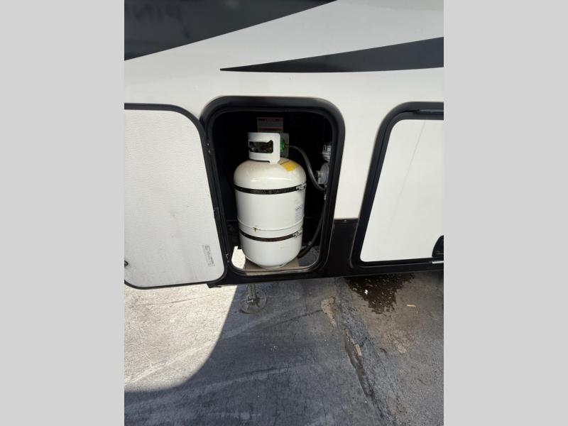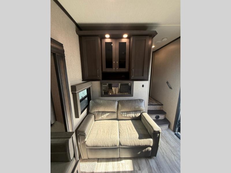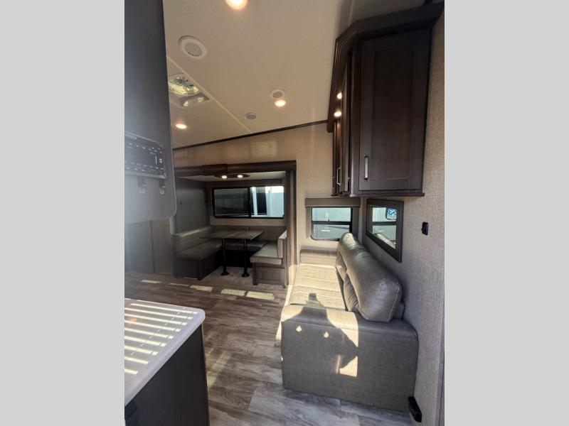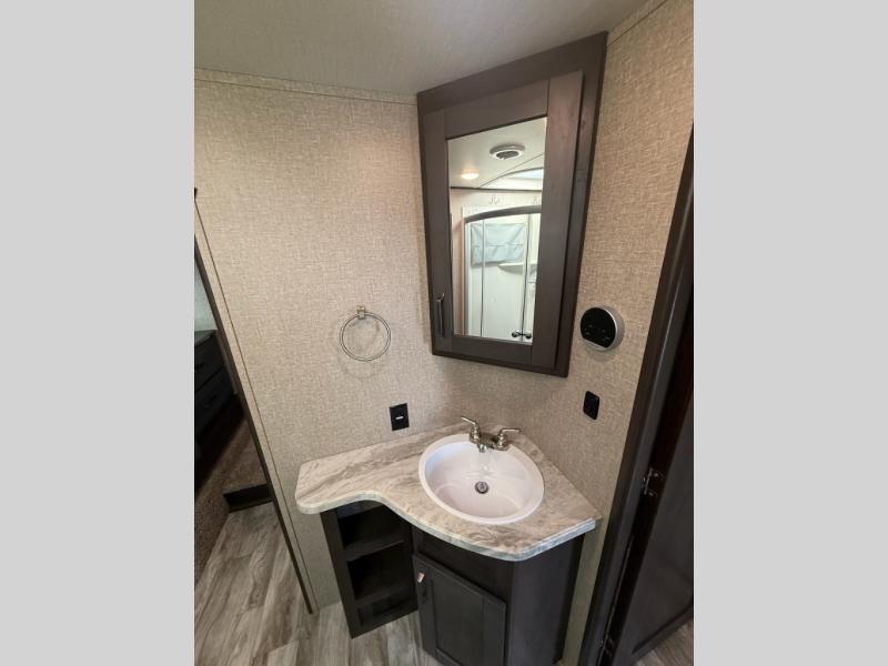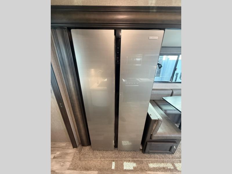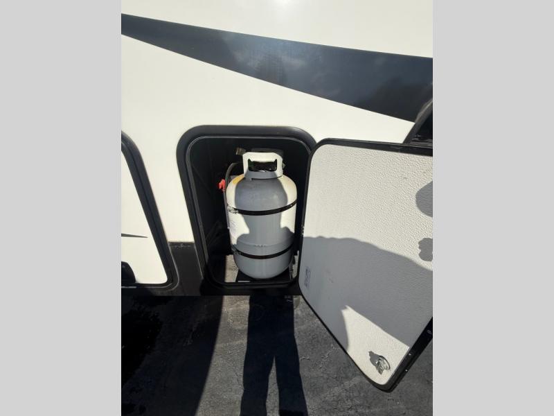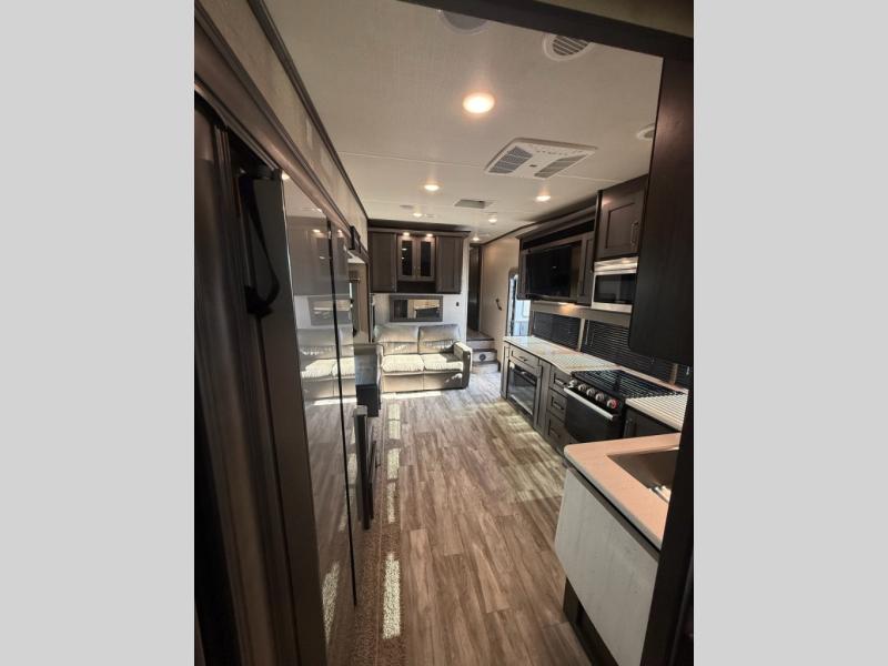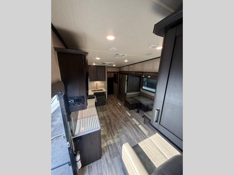 You probably selected this fifth wheel because of the rear bunkhouse that offers a 30" top bunk with a dresser below, a 34" top bunk with a 48" lower bunk, a ladder to reach the two top bunks and the privacy that it allows your family or friends when they camp with you. The gourmet kitchen has a flip-up countertop extension to make meal prepping easier and a 16 cu. ft. refrigerator to store lots of food and beverages for the large group. There is an outside kitchen as well to make meals when you want to be outdoors while others relax under the 21' electric awning. You can dine, relax and play games at the U-shaped dinette or choose the theatre seating option if you prefer, and the tri-fold sofa gives you more seating to watch the 40" LED HDTV with fireplace below. The front bedroom provides a walk-around queen bed, a slide out wardrobe with drawers and linen storage that stretches into the double entry bathroom which provides everything you need to stay clean and refreshed including a space savings radius shower.