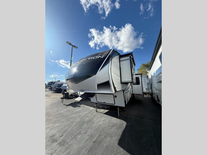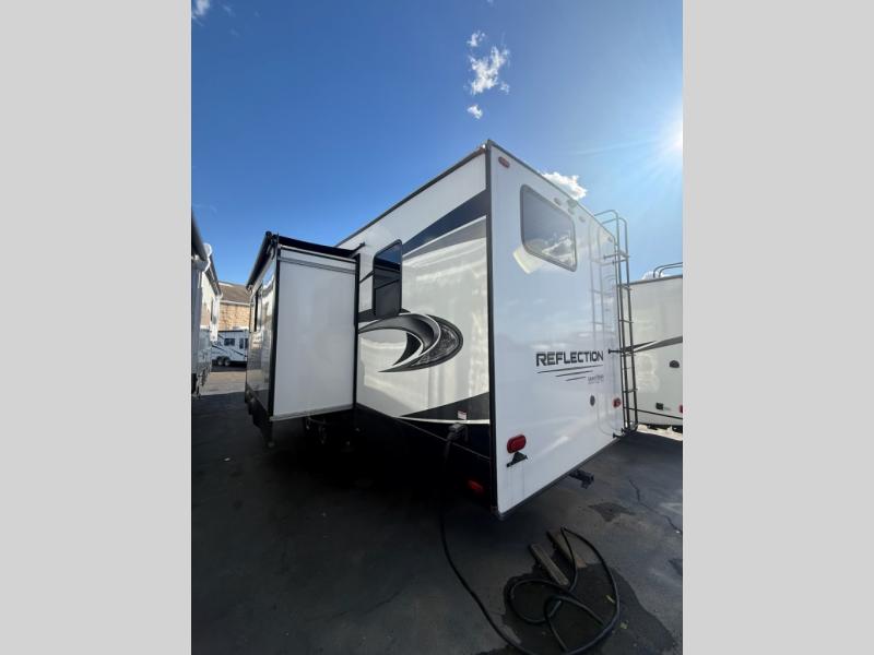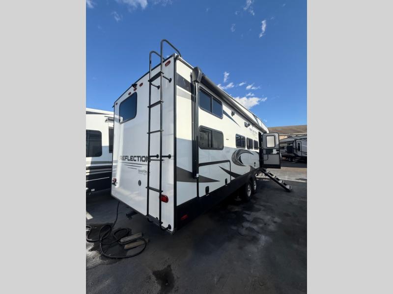 With any Reflection fifth wheels by Grand Design, you will have a 165W solar panel for off-grid camping and a 50 Amp charge controller and inverter prep, a Max Turn radius front cap for easy towing around town and into your campsite, a Universal All-In-One Docking Station, unobstructed pass-through storage, and Goodyear E-rated tires. Some other top features include a chef's kitchen with a 30" stainless steel microwave and residential cooktop, a USB charging station, and the ductless "Evenflow" heating system with no vents in the floor to collect debris. Each is constructed of high gloss gel coat exterior sidewalls, residential 5" truss rafters, walk-on roof decking, a fiberglass and radiant foil roof and front cap insulation plus laminated aluminum framed side walls, rear wall, roof and end walls in slide rooms. Choose luxury, value and towability over all the others, take home a Reflection of your good taste!