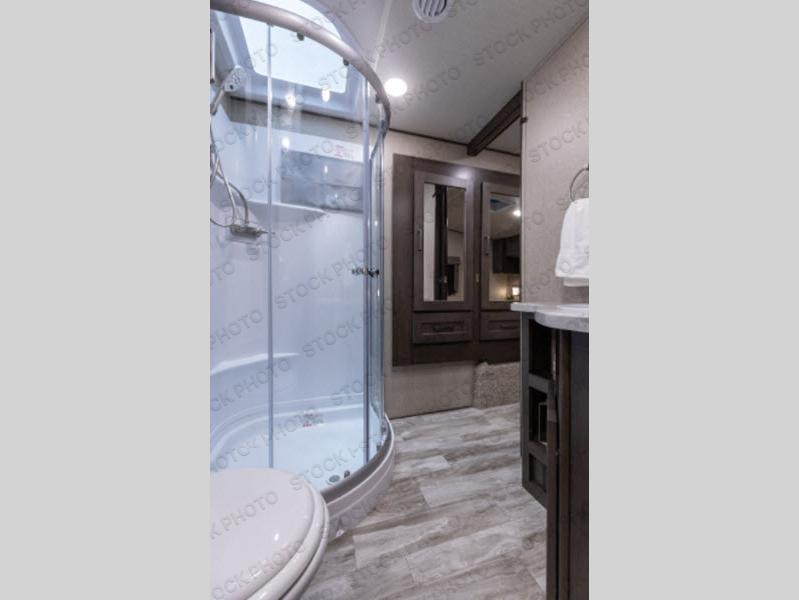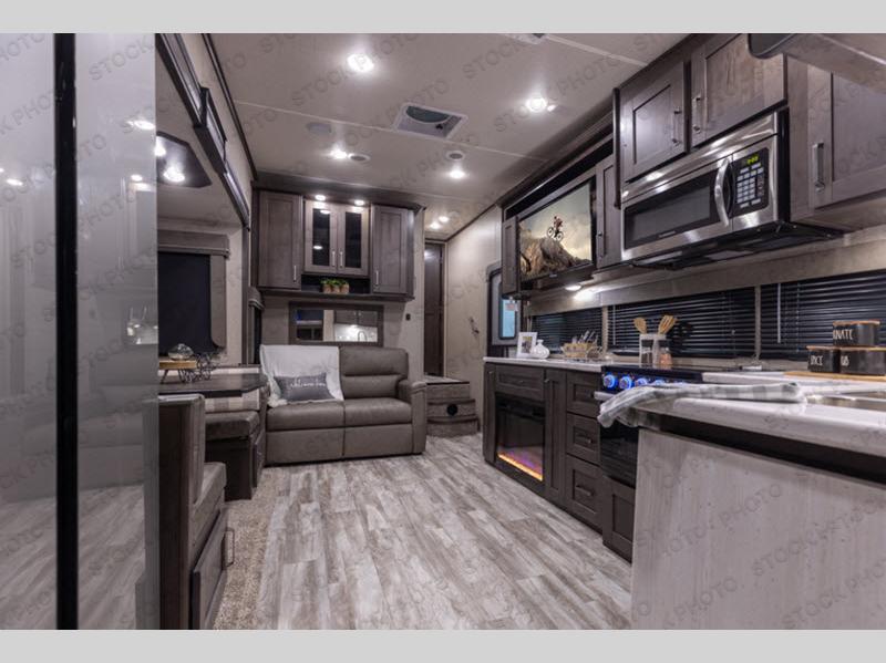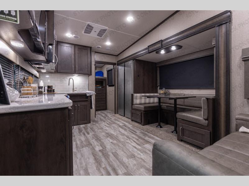 You probably selected this fifth wheel because of the rear bunkhouse that offers a 30" top bunk with a dresser below, a 34" top bunk with a 48" lower bunk, a ladder to reach the two top bunks and the privacy that it allows your family or friends when they camp with you. The gourmet kitchen has a flip-up countertop extension to make meal prepping easier and a 16 cu. ft. refrigerator to store lots of food and beverages for the large group. There is an outside kitchen as well to make meals when you want to be outdoors while others relax under the 21' electric awning. You can dine, relax and play games at the U-shaped dinette or choose the theatre seating option if you prefer, and the tri-fold sofa gives you more seating to watch the 40" LED HDTV with fireplace below. The front bedroom provides a walk-around queen bed, a slide out wardrobe with drawers and linen storage that stretches into the double entry bathroom which provides everything you need to stay clean and refreshed including a space savings radius shower.